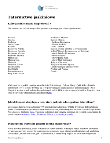 Taternictwo jaskiniowe Które jaskinie można eksplorować ? Dla taternictwa jaskiniowego udostępnione są następujące obiekty jaskiniowe: Barania Czarna Dudnica Goryczkowa Kalacka Kasprowa Niżnia Kasprowa Średnia Kasprowa Wyżnia Koprowa Studnia Małołącka Marmurowa Miętusia Miętusia Wyżnia Pod Dachem Pod Wantą Pomarańczarnia Przy Przechodzie Studnia za Murem System Ptasiej: • Lodowa Litworowa • Ptasia Studnia • Nad Dachem System Wielka Śnieżna (z wyłączeniem Jaskini Wilczej do połączenia ze Śnieżną): • otwór Wielka Litworowa • otwór Śnieżna • otwór Jasny Aven • otwór Nad Kotlinami Śpiących Rycerzy Śpiących Rycerzy Wyżnia Tunel Małołącki (dolny otwór) Wodna pod Pisaną Zimna Większość tych jaskiń znajduje się w Dolinie Kościeliskiej i Dolinie Małej Łąki, kilka obiektów położonych jest w Dolinie Bystrej. Są to w przeważającej części jaskinie przekraczające 100 m długości, a sześć z nich należy do najdłuższych jaskiń TPN przekraczających 1000 m długości. Listę wraz z okresami udostępniania znajdziesz tutaj. Jaki dokument decyduje o tym, które jaskinie udostępniono taternikom? Uprawianie taternictwa na terenie TPN reguluje Zarządzenie nr 6/2012 Dyrektora Tatrzańskiego Parku Narodowego w sprawie uprawiania taternictwa jaskiniowego na terenie Tatrzańskiego Parku Narodowego, dostępne tutaj. Taternicy jaskiniowi, jak wszyscy pozostali, są również zobowiązani do przestrzegania ustawy z dnia 16 kwietnia 2004 r. o ochronie przyrody. Dlaczego nie wszystkie jaskinie można eksplorować? Wiele nieudostępnionych jaskiń to niezwykle cenne obiekty, w których każda obecność człowieka wywiera negatywny wpływ. Są to również w większości małe obiekty nieatrakcyjne pod względem taternickim, jednak one same, jak i ich otoczenie, a także drogi dojścia do nich stanowią cenne Taternictwo jaskiniowe 1 obszary pod względem przyrodniczym. Czy trzeba mieć specjalne zezwolenie i umiejętności? Aby uzyskać zezwolenie na wejście do jaskini na terenie TPN, należy posiadać Kartę Taternika Jaskiniowego, licencję TPN uprawniającą do uprawiania taternictwa jaskiniowego na terenie Parku lub uczestniczyć w kursie jaskiniowym. Kartę Taternika Jaskiniowego uzyskuje się po ukończeniu kursu taternictwa jaskiniowego oraz zdaniu egzaminu. Aby uzyskać licencję TPN, należy dostarczyć zaświadczenie o ukończeniu kursu wystawione przez instruktora taternictwa jaskiniowego oraz odbyć szkolenie przyrodnicze prowadzone przez pracownika Parku. Kursanci mogą wejść do jaskini pod następującymi warunkami: ● ● muszą posiadać dowód tożsamości oraz imienne zaświadczenie potwierdzające uczestnictwo w kursie taternictwa jaskiniowego wystawione przez jednostkę organizującą kurs w wyjściu musi brać udział osoba posiadająca uprawnienia instruktora taternictwa jaskiniowego Przed wejściem do jaskiń należy dokonać rejestracji wyjścia, wypełniając formularz na stronie internetowej www.jaskinie.tpn.pl. W przypadku awarii elektronicznego systemu rejestracji oraz w sytuacjach awaryjnych rejestracji wyjścia można dokonać w Punkcie Informacji Turystycznej, ul. Chałubińskiego 42, telefonicznie (182023300) lub wysyłając e-mail pod adresem: [email protected]. Dopuszcza się możliwość dokonywania wpisów z dwudniowym wyprzedzeniem. Za dokonanie prawidłowego wpisu odpowiada kierownik wyprawy. Po dokonaniu wpisu, trzeba wydrukować "poświadczenie rejestracji wejścia do jaskini” lub zapamiętać numer wpisu. Będzie on bowiem potrzebny w przypadku ewentualnej kontroli. Po dokonaniu rejestracji kierownik zespołu może otrzymać prośbę o wypełnienie karty informacyjnej dotyczącej stanu czystości w jaskini, stanu stałych punktów asekuracyjnych lub innych ważnych z punktu widzenia ochrony przyrody spostrzeżeń. Kartę po wyjściu z jaskini powinien wypełnić kierownik zespołu, a następnie przesłać ją bądź dostarczyć do TPN. Zawsze należy zostawić gdzieś informację o wyjściu, planowanej godzinie powrotu i ewentualnej godzinie alarmowej. Odpowiada za to kierownik wyjścia. Ponosi on całkowitą odpowiedzialność za bezpieczeństwo uczestników wyprawy, jak i za zapewnienie systemu alarmowego, w tym zgłoszenie wyprawy w TOPR. Jakie szczególne ograniczenia obowiązują? ● ● ● ● Do tej samej jaskini w ciągu jednego dnia mogą być wydane zezwolenia tylko trzem grupom taterników, przy czym dzienny limit wejść to 15 osób. W czasie dojścia oraz powrotu do otworu jaskini obowiązuje dojście najkrótszą bezpieczną drogą od najbliższego szlaku turystycznego. Zaleca się używanie tradycyjnie wykorzystywanych ciągów komunikacyjnych, których przebieg każdy taternik jaskiniowy powinien znać. Nie wolno dowolnie podchodzić, schodzić czy też przemieszczać się po terenie, gdzie znajdują się udostępnione jaskinie. Obowiązuje całkowity zakaz używania oświetlenia karbidowego. Uprawianie taternictwa jaskiniowego dozwolone jest jedynie w znanych (udokumentowanych) i ubezpieczonych w stałe punkty asekuracyjne ciągach jaskiniowych. Taternictwo jaskiniowe 2 ● ● Podczas uprawiania taternictwa jaskiniowego zabrania się montażu i demontażu stałych punktów asekuracyjnych bez zezwolenia dyrekcji Tatrzańskiego Parku Narodowego. Działalność badawcza w jaskiniach, w tym eksploracyjna, wymaga oddzielnego zezwolenia dyrekcji Tatrzańskiego Parku Narodowego. Taternictwo jaskiniowe 3