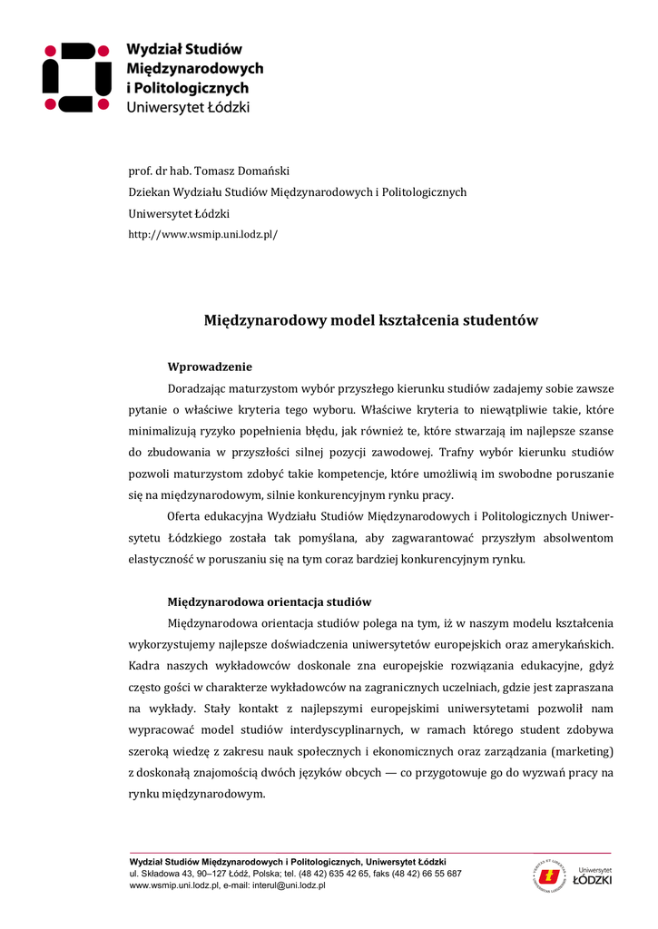 prof. dr hab. Tomasz Domański Dziekan Wydziału Studiów Międzynarodowych i Politologicznych Uniwersytet Łódzki http://www.wsmip.uni.lodz.pl/ Międzynarodowy model kształcenia studentów Wprowadzenie Doradzając maturzystom wybór przyszłego kierunku studiów zadajemy sobie zawsze pytanie o właściwe kryteria tego wyboru. Właściwe kryteria to niewątpliwie takie, które minimalizują ryzyko popełnienia błędu, jak również te, które stwarzają im najlepsze szanse do zbudowania w przyszłości silnej pozycji zawodowej. Trafny wybór kierunku studiów pozwoli maturzystom zdobyć takie kompetencje, które umożliwią im swobodne poruszanie się na międzynarodowym, silnie konkurencyjnym rynku pracy. Oferta edukacyjna Wydziału Studiów Międzynarodowych i Politologicznych Uniwer- sytetu Łódzkiego została tak pomyślana, aby zagwarantować przyszłym absolwentom elastyczność w poruszaniu się na tym coraz bardziej konkurencyjnym rynku. Międzynarodowa orientacja studiów Międzynarodowa orientacja studiów polega na tym, iż w naszym modelu kształcenia wykorzystujemy najlepsze doświadczenia uniwersytetów europejskich oraz amerykańskich. Kadra naszych wykładowców doskonale zna europejskie rozwiązania edukacyjne, gdyż często gości w charakterze wykładowców na zagranicznych uczelniach, gdzie jest zapraszana na wykłady. Stały kontakt z najlepszymi europejskimi uniwersytetami pozwolił nam wypracować model studiów interdyscyplinarnych, w ramach którego student zdobywa szeroką wiedzę z zakresu nauk społecznych i ekonomicznych oraz zarządzania (marketing) z doskonałą znajomością dwóch języków obcych — co przygotowuje go do wyzwań pracy na rynku międzynarodowym. Wydział Studiów Międzynarodowych i Politologicznych, Uniwersytet Łódzki ul. Składowa 43, 90–127 Łódź, Polska; tel. (48 42) 635 42 65, faks (48 42) 66 55 687 www.wsmip.uni.lodz.pl, e-mail: [email protected] Kształcenie dla międzynarodowego rynku pracy Doskonała znajomość nowoczesnych wymagań międzynarodowego rynku pracy pozwoliła nam stworzyć model kształcenia, który jest wysoko ceniony przez zagranicznych pracodawców oraz menedżerów. Nasz absolwent potrafi doskonale komunikować się z zagranicznymi partnerami, z którymi coraz częściej będzie musiał współpracować w ramach jednego międzynarodowego zespołu. Międzynarodowy charakter zespołów w przedsiębiorstwach oraz w trakcie realizacji złożonych projektów europejskich wymaga nie tylko doskonałego komunikowania się w języku angielskim, ale również w innych językach obcych (np.: francuskim, hiszpańskim, rosyjskim czy niemieckim). Nasi absolwenci znając dwa, a coraz częściej także trzy, języki obce znacznie lepiej aniżeli absolwenci klasycznych studiów inżynierskich, ekonomicznych, prawnych lub menedżerskich odnajdują się na konkurencyjnym rynku pracy. Cechuje ich znacznie większa otwartość kulturowa, która w połączeniu z wiedzą marketingową, zarządzaniem projektami oraz znajomością nowych technologii komunikowania daje im ogromną przewagę na rynku. Nasze doświadczenia edukacyjne zdobyte w ciągu ostatnich 12 lat pozwoliły wypracować oryginalny i bardzo skuteczny model kształcenia. Możliwość wyboru własnej ścieżki kariery Proponowany przez nas model kształcenia stwarza studentom daleko posunięte możliwości indywidualizacji własnej ścieżki kariery. Nasi studenci mogą wybierać między ścieżką prowadzącą ich do pracy w międzynarodowym biznesie (marketing międzyna- rodowy, międzynarodowe zarządzanie projektami, międzynarodowa komunikacja marketingowa); w międzynarodowych instytucjach społecznych i politycznych (instytucje samorzą- dowe, realizujące programy europejskie, polskie przedstawicielstwa dyplomatyczne oraz agendy Unii Europejskiej), jak również w międzynarodowych mediach (dziennikarstwo międzynarodowe w koncernach multimedialnych: prasa, telewizja, Internet, radio). Proponowany przez nas model kształcenia stwarza studentom warunki do dokonywania indywidualnych wyborów oraz możliwość łączenia różnych ścieżek kariery. Ten typ absolwenta znacznie lepiej odnajduje się później na rynku pracy, gdyż jest bardziej elastyczny i otwarty zarówno na zmiany otoczenia, jak i na wyzwania towarzyszące innowacyjności oraz wdrażaniu nowych technologii. Absolwent naszego Wydziału jest bardziej mobilny i tym samym szybciej znajduje atrakcyjne oferty pracy. To także absolwent, który lepiej stawi czoła czekającym go coraz częściej zmianom, sytuacjom kryzysowym i załamaniom gospodarki. 2 Międzynarodowy Biznes–Polityka i Dyplomacja– –Dziennikarstwo międzynarodowe Łączenie w ramach jednego kierunku studiów (stosunki międzynarodowe czy politologiczne) interdyscyplinarnego podejścia do ścieżki własnej kariery pozwala nam kształcić ludzi bardziej otwartych na świat. Nasz absolwent jest tym samym lepiej przygotowany do kilkakrotnych zmian miejsca pracy oraz otoczenia przedsiębiorstw, z którymi będzie musiał sobie radzić w przyszłości. Będzie również doskonale radził sobie zarówno w biznesie w roli menedżera i szefa projektu, jak i w administracji publicznej, samorządowej na szczeblu lokalnym oraz centralnym. Kompetencje zdobyte na studiach stwarzają mu ogromne pole do działania zarówno w instytucjach zorientowanych na zysk, jak i w organizacjach publicznych oraz fundacjach i instytucjach w tym non-profit. Znajomość otoczenia międzynarodowego szczególnie predestynuje go do pracy we wszelkiego rodzaju instytucjach i biurach szeroko kontaktujących się z zagranicą i odpowiedzialnych za realizację międzynarodowych projektów biznesowych, społecznych, politycznych oraz kulturowych. Jego umiejętności w zakresie komunikacji wielokulturowej czynią z niego zarówno potencjalnego partnera, jak i docelowo lidera tego typu zespołów. Szeroko rozbudowana wymiana zagraniczna Opisany tutaj model kszta