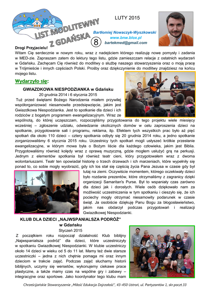 LUTY 2015 Bartłomiej Nowaczyk-Wyszkowski www.bnw.blox.pl [email protected] 8 Drogi Przyjacielu! Witam Cię serdecznie w nowym roku, wraz z nadejściem którego realizuję nowe pomysły i zadania w MED-zie. Zapraszam zatem do lektury tego listu, gdzie zamieszczam relacje z ostatnich wydarzeń w Gdańsku. Zachęcam Cię również do modlitwy o służbę naszego stowarzyszenia oraz o moją pracę w Trójmieście i innych częściach Polski. Prośby oraz dziękczynienie do modlitwy znajdziesz na końcu mojego listu. Wydarzyło się: GWIAZDKOWA NIESPODZIANKA w Gdańsku 20 grudnia 2014 i 6 stycznia 2015 Tuż przed świętami Bożego Narodzenia miałem przywilej współorganizować niesamowite przedsięwzięcie, jakim jest Gwiazdkowa Niespodzianka. Jest to spotkanie dla dzieci i ich rodziców z bogatym programem ewangelizacyjnym. Wraz ze wspólnotą, do której uczęszczam, rozpoczęliśmy przygotowania do tego projektu wiele miesięcy wcześniej – zgłoszenie udziału, odwiedzanie okolicznych domów w celu zaproszenia dzieci na spotkanie, przygotowanie sali i programu, reklama, itp. Efektem tych wszystkich prac było aż pięć spotkań dla około 110 dzieci – cztery spotkania odbyły się 20 grudnia 2014 roku, a jedno spotkanie zorganizowaliśmy 6 stycznia 2015 roku. Uczestnicy tych spotkań mogli usłyszeć krótkie przesłanie ewangelizacyjne, w którym mowa była o Bożym liście dla każdego człowieka, jakim jest Biblia. Przygotowaliśmy również kolędy wraz z oprawą muzyczną, gdzie mogłem usłużyć grą na perkusji. Jednym z elementów spotkania był również teatr cieni, który przygotowałem wraz z dwoma wolontariuszami. Teatr ten opowiadał historię o trzech drzewach i ich marzeniach, które wypełniły się ponad to, co sobie mogły wyobrazić, gdy ich los stał się częścią życia Pana Jezusa w czasie gdy był tutaj na ziemi. Oczywiście momentem, którego oczekiwały dzieci było rozdanie prezentów, które otrzymaliśmy z zagranicy dzięki organizacji Samaritan's Purse. Był to wspaniały czas zarówno dla dzieci jak i dorosłych. Wiele osób dziękowało nam za możliwość uczestniczenia w tym spotkaniu i cieszyło się, że ich pociechy mogły otrzymać niesamowity podarunek w czasie świąt. Ja osobiście dziękuję Panu Bogu za błogosławieństwo, jakim nas obdarzył podczas przygotowań i realizacji Gwiazdkowej Niespodzianki. KLUB DLA DZIECI „NAJWSPANIALSZA PODRÓŻ” w Gdańsku Styczeń 2015 Z początkiem roku rozpoczął działalność Klub biblijny „Najwspanialsza podróż” dla dzieci, które uczestniczyły w spotkaniu Gwiazdkowej Niespodzianki. W klubie uczestniczy około 14 dzieci w wieku od 5 do 11 lat. Mamy też dwie starsze uczestniczki – jedna z nich chętnie pomaga mi oraz innym dzieciom w trakcie zajęć. Podczas zajęć słuchamy historii biblijnych, uczymy się wersetów, wykonujemy ciekawe prace plastyczne, a także mamy czas na wspólne gry i zabawy – integracyjne oraz sportowe. Jako koordynator tego klubu mam Chrześcijańskie Stowarzyszenie „Miłość Edukacja Dojrzałość”, 43-450 Ustroń, ul. Partyzantów 1, skr.poczt.33 przyjemność współpracować z wolontariuszami z mojego kościoła, którzy angażują się w pomoc i prowadzenie zajęć biblijnych, za co jestem im ogromnie wdzięczny. Zajęcia klubu odbywają się w każdą sobotę, więc przed nami jeszcze sporo spotkań, na których dzieci nie tylko będą poznawać historię, ale również prawdy biblijne, które będą miały wpływ na ich życie – jest to moim pragnieniem i westchnieniem do Boga. GRA TERENOWA „NIEZWYKŁE NACZYNIA” W ostatnim czasie zakończyłem pracę nad publikacją Gra terenowa „Niezwykłe naczynia”, którą opracowywałem z różnymi przerwami w ramach mojej służby w MED. Jest to dodatek do znanego cyklu lekcji biblijnych Zaszczytne i pospolite, które wydał MED kilka lat temu. Grę opracowałem dzięki mojemu kilkuletniemu doświadczeniu jako nauczyciel lekcji biblijnej w chrześcijańskiej szkole. Właśnie w tym czasie pojawił się pomysł podsumowania półrocznej pracy z dziećmi, w czasie której realizowaliśmy program Zaszczytne i pospolite. Postanowiłem, że ciekawą formą, nie będzie sprawdzian czy odpytywanie, ale gra, w której uczniowie wykorzystają swoją wiedzą oraz umiejętności. Przez kilka lat modyfikowałem ten pomysł i właśnie dzięki temu powstała publikacja Gra terenowa „Niezwykłe naczynia”. Można ją pobrać za darmo, wchodząc na stronę www.med.org.pl. Zachęcam również do nabycia cyklu lekcji biblijnych Zaszczytne i pospolite w biurze naszego stowarzyszenia, odwiedzając stronę www.med.org.pl lub dzwoniąc pod nr tel. 33 854 25 97. MOJA CODZIENNA PRACA w Gdańsku Oprócz spotkań klubu biblijnego, szkoleń, konferencji i innych aktywnych działań, na co dzień pracuję w swoim pokoju, który wynajmuję w Gdańsku. Zajmuję się przygotowaniem wykładów na kolejne szkolenia – obecnie przygotowuję się do Letniej Szkoły Biblijnej, która odbędzie się pod koniec lutego w Giżycku. Tworzę nowe publikacje – niebawem ukaże się Poradnik Dobrej Zabawy. W MED-zie zajmuję się również działem graficznym, przygotowuję plakaty, ulotki, banery, kolorowe napisy i informacje graficzne. Są również inne działania, tj. cotygodniowe przygotowanie lekcji biblijnych, regularne przygotowania do obozów letnich i wiele innych zadań, które pojawiają się w codziennej pracy. Pracy jest wiele, ale dzięki Panu Bogu otrzymuję również wiele sił, aby podołać tym wyzwaniom, za co jestem Mu wdzięczny. Dziękuj Bogu razem ze mną za: ofiarodawców, którzy wspierają moją służbę w Trójmieście; Gwiazdkową Niespodziankę i głoszone na niej Słowo Boże, które dotarło do wielu gdańskich rodzin; rozpoczęcie działalności klubu biblijnego dla dzieci „Najwspanialsza podróż” na terenie byłej Stoczni Gdańskiej; przygotowany nowy materiał pomocny w nauczaniu dzieci – G