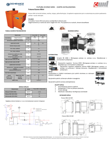 FUTURA ECONO MINI - KARTA KATALOGOWA Futura Econo Mini Futura Mini to kocioł stalowy, wodny, stojący, jednofunkcyjny. Urządzenie wyposażone jest w automatyczny system podawania paliwa i ruszta awaryjne. PALIWO Do kotłów Futura Mini przy pracy z podajnikiem zalecany jest: węgiel kamienny o rozmiarze ziaren węgla 8-25 mm. Przy spalaniu na rusztach, drewno kawałkowe TABELA DANYCH TECHNICZNYCH BUDOWA KOTŁA Model kotła moc kotła Węgiel kamienny granulacji 8-25mm Sprawność na palniku retortowym kW 18 - 24 % 3 pojemność wodna dm ciśnienie dopusz czalne bar min. temp. zasilania max. temp. zasilania temperatura spalin przy mocy nominalnej temperatura spalin przy mocy minimalnej opór po stronie wody; ∆t=10K Futura Mini 16 5-16 Futura Mini 24 8-24 82% 75 105 2 o C 55 o C 90 o C 240-260 o C 100-150 mbar 0,5-5 podciśnienie kominowe Pa 20 zalecana min. minimalna wysokość komina zalecany przekrój komina m 8 poj. kosza zasypowego 2 400 3 140 cm dm Węgiel kam. Ekogroszek 26MJ/kg pobór mocy Seryjnie RK 2006 L Obsługujący pompę c.o. pompę c.w.u, Współpracuje z termostatem pokojowym. 2-20 opór po stronie wody; ∆t=20K zużycie paliwa mocy nominalnej AUTOMATYKA kg/h h kW 2,7 Opcjonalnie regulator Ecomax 250R. Obsługujący pompę c.o. pompę c.w.u, Współpracuje z termostatem pokojowym. Opcjonalnie regulator pogodowy Ecomax 800R Obsługujący pompę c.o. pompę c.w.u,mieszacz i pompę mieszacza. Współpracuje z termostatem pokojowym. 3,5 OPCJE Standardowo w kotłach montowany jest palnik retortowy ze stalowym układem nawęglania Opcjonalnie palnik z żeliwnym układem nawęglania 0,19/0,27 Opcjonalnie palnik rynnowy wielopaliwowy EMISJA SPALIN miano Futura Mini (ekogroszek) Emis ja C O (O2=10%) mg/m3 1145 Emis ja OGC (O2=10%) mg/m3 35 Emis ja p yłu ( O2=10%) mg/m3 40 Model kotła ZALETY KOTŁA Automatyzacja procesu spalania Stałopalność 2-7dni na jednym załadunku Prosta obsługa Możliwość rozbudowy i konfiguracji automatyki WYMIARY KOTŁA Futura Mini 16 kW Poglądowy schemat instalacji c.o. i c.w.u z termostatycznym zaworem 3-drogowym Futura Mini 24 kW Futura Mini 24 kW Informacje zawarte na tej stronie mają charakter informacyjny i nie stanowią oferty handlowej w rozumieniu art. 66 ust. 1 Kodeksu Cywilnego Producent zastrzega sobie możliwość zmiany niektórych danych technicznych zawartych w karcie katalogowej.
