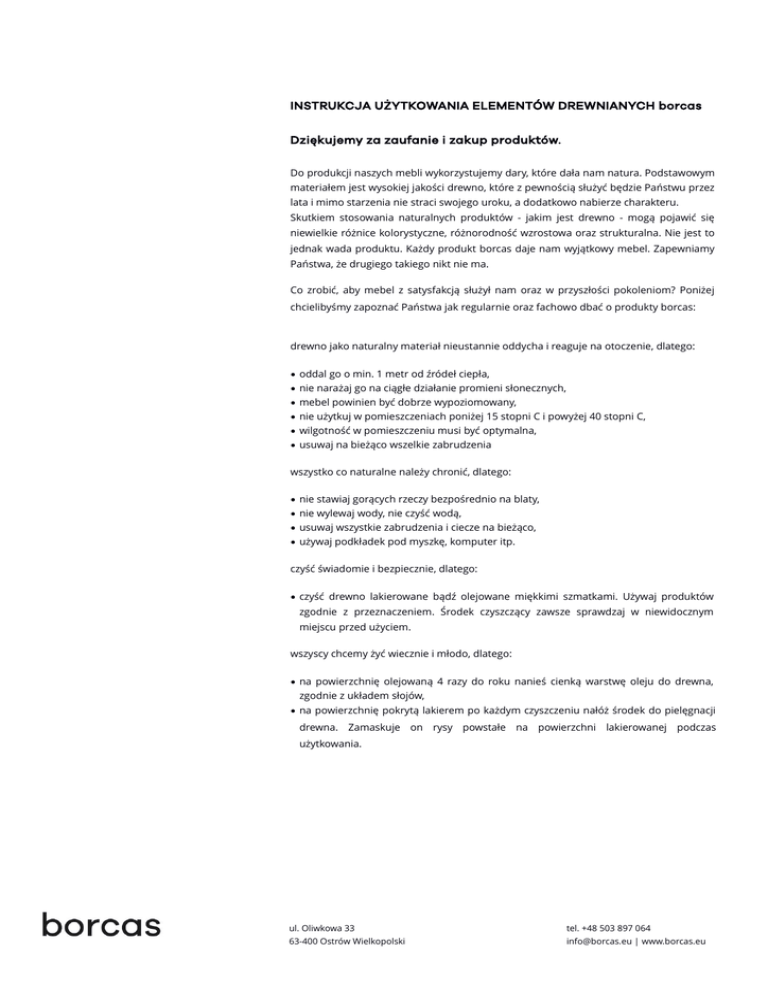 INSTRUKCJA UŻYTKOWANIA ELEMENTÓW DREWNIANYCH borcas Dziękujemy za zaufanie i zakup produktów. Do produkcji naszych mebli wykorzystujemy dary, które dała nam natura. Podstawowym materiałem jest wysokiej jakości drewno, które z pewnością służyć będzie Państwu przez lata i mimo starzenia nie straci swojego uroku, a dodatkowo nabierze charakteru. Skutkiem stosowania naturalnych produktów - jakim jest drewno - mogą pojawić się niewielkie różnice kolorystyczne, różnorodność wzrostowa oraz strukturalna. Nie jest to jednak wada produktu. Każdy produkt borcas daje nam wyjątkowy mebel. Zapewniamy Państwa, że drugiego takiego nikt nie ma. Co zrobić, aby mebel z satysfakcją służył nam oraz w przyszłości pokoleniom? Poniżej chcielibyśmy zapoznać Państwa jak regularnie oraz fachowo dbać o produkty borcas: drewno jako naturalny materiał nieustannie oddycha i reaguje na otoczenie, dlatego: oddal go o min. 1 metr od źródeł ciepła, nie narażaj go na ciągłe działanie promieni słonecznych, mebel powinien być dobrze wypoziomowany, nie użytkuj w pomieszczeniach poniżej 15 stopni C i powyżej 40 stopni C, wilgotność w pomieszczeniu musi być optymalna, usuwaj na bieżąco wszelkie zabrudzenia wszystko co naturalne należy chronić, dlatego: nie stawiaj gorących rzeczy bezpośrednio na blaty, nie wylewaj wody, nie czyść wodą, usuwaj wszystkie zabrudzenia i ciecze na bieżąco, używaj podkładek pod myszkę, komputer itp. czyść świadomie i bezpiecznie, dlatego: czyść drewno lakierowane bądź olejowane miękkimi szmatkami. Używaj produktów zgodnie z przeznaczeniem. Środek czyszczący zawsze sprawdzaj w niewidocznym miejscu przed użyciem. wszyscy chcemy żyć wiecznie i młodo, dlatego: na powierzchnię olejowaną 4 razy do roku nanieś cienką warstwę oleju do drewna, zgodnie z układem słojów, na powierzchnię pokrytą lakierem po każdym czyszczeniu nałóż środek do pielęgnacji drewna. Zamaskuje on rysy powstałe na powierzchni lakierowanej podczas użytkowania. asdsads asdsads ul. Oliwkowa 33 tel. +48 503 897 064 63-400 Ostrów Wielkopolski [email protected] | www.borcas.eu