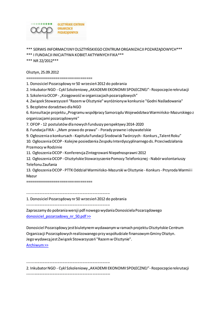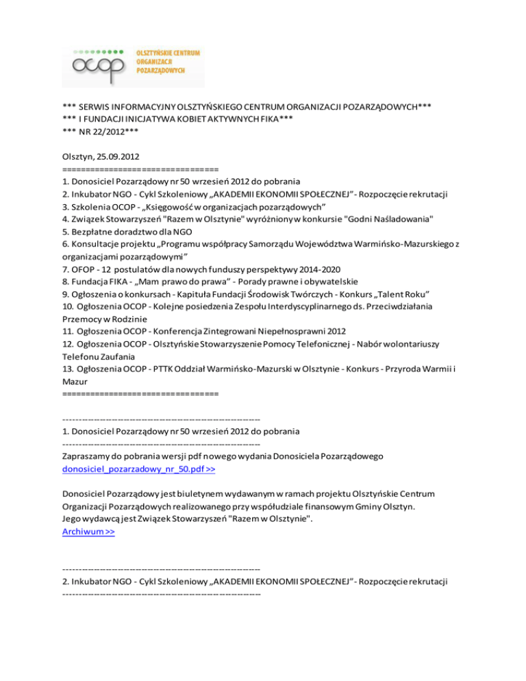 *** SERWIS INFORMACYJNY OLSZTYŃSKIEGO CENTRUM ORGANIZACJI POZARZĄDOWYCH*** *** I FUNDACJI INICJATYWA KOBIET AKTYWNYCH FIKA*** *** NR 22/2012*** Olsztyn, 25.09.2012 ================================= 1. Donosiciel Pozarządowy nr 50 wrzesień 2012 do pobrania 2. Inkubator NGO - Cykl Szkoleniowy „AKADEMII EKONOMII SPOŁECZNEJ”- Rozpoczęcie rekrutacji 3. Szkolenia OCOP - „Księgowość w organizacjach pozarządowych” 4. Związek Stowarzyszeń "Razem w Olsztynie" wyróżniony w konkursie "Godni Naśladowania" 5. Bezpłatne doradztwo dla NGO 6. Konsultacje projektu „Programu współpracy Samorządu Województwa Warmińsko-Mazurskiego z organizacjami pozarządowymi” 7. OFOP - 12 postulatów dla nowych funduszy perspektywy 2014-2020 8. Fundacja FIKA - „Mam prawo do prawa” - Porady prawne i obywatelskie 9. Ogłoszenia o konkursach - Kapituła Fundacji Środowisk Twórczych - Konkurs „Talent Roku” 10. Ogłoszenia OCOP - Kolejne posiedzenia Zespołu Interdyscyplinarnego ds. Przeciwdziałania Przemocy w Rodzinie 11. Ogłoszenia OCOP - Konferencja Zintegrowani Niepełnosprawni 2012 12. Ogłoszenia OCOP - Olsztyńskie Stowarzyszenie Pomocy Telefonicznej - Nabór wolontariuszy Telefonu Zaufania 13. Ogłoszenia OCOP - PTTK Oddział Warmińsko-Mazurski w Olsztynie - Konkurs - Przyroda Warmii i Mazur ================================= -----------------------------------------------------------------1. Donosiciel Pozarządowy nr 50 wrzesień 2012 do pobrania -----------------------------------------------------------------Zapraszamy do pobrania wersji pdf nowego wydania Donosiciela Pozarządowego donosiciel_pozarzadowy_nr_50.pdf >> Donosiciel Pozarządowy jest biuletynem wydawanym w ramach projektu Olsztyńskie Centrum Organizacji Pozarządowych realizowanego przy współudziale finansowym Gminy Olsztyn. Jego wydawcą jest Związek Stowarzyszeń "Razem w Olsztynie". Archiwum >> -----------------------------------------------------------------2. Inkubator NGO - Cykl Szkoleniowy „AKADEMII EKONOMII SPOŁECZNEJ”- Rozpoczęcie rekrutacji ------------------------------------------------------------------ Związek Stowarzyszeń „Razem w Olsztynie” zaprasza do wzięcia udziału w cyklu szkoleniowym pt. „Akademia Ekonomii Społecznej”, organizowanym w ramach projektu "Praca zamiast zasiłku Partnerstwo na Rzecz Rozwoju Ekonomii Społecznej na Warmii i Mazurach”. Celem projektu jest wspieranie przedsiębiorczości i samowystarczalności NGO. 7-dniowy cykl szkoleniowy pt. „AKADEMII EKONOMII SPOŁECZNEJ” jest adresowany do liderów/pracowników organizacji pozarządowych z województwa warmińsko-mazurskiego, którzy planują rozpoczęcie prowadzenia działalności odpłatnej bądź też działalności gospodarczej w ramach organizacji. Daty szkoleń oraz tematyka: 19-20.10.2012 – Badania i analiza zasobów własnych. Ustalanie celów i priorytetów. Poszukiwanie pomysłów na produkty/usługi. Grupowe podejmowanie decyzji. Wstęp do badania rynku. 27-28.10.2012 - Badania rynku. Badania marketingowe. Marketing w podmiotach ekonomii społecznej. 8-10.11.2012 - Analiza finansowa i analiza rentowności przedsięwzięcia. Aspekty prawne, finansowe, księgowe prowadzenia działalności gospodarczej NGO. Zatrudnianie pracowników i społeczna działalność członków organizacji. Działalność gospodarcza NGO – korzyści i zagrożenia. Zakończenie działalności organizacji pozarządowej. Organizacje biorące udział w Akademii zostaną objęte nieodpłatnym doradztwem w zakresie sporządzania planu rozwoju organizacji lub tworzenia biznesplanów. Na zakończenie Akademii Ekonomii Społecznej każda uczestnicząca w niej organizacja będzie posiadała plan działania oraz biznesplan swojego przedsięwzięcia. Organizacje potrzebujące doradztwa rachunkowo-księgowego dodatkowo mogą korzystać z punktu konsultacyjnego w „Inkubatorze NGO”. Charakterystyka cyklu: Cykl szkoleniowy będzie realizowany od października do listopada 2012, Grupa będzie liczyła ok. 16 osób (8 organizacji pozarządowych), po dwie osoby z jednej organizacji, Przewidziano 7 dni szkoleniowych tj. 56 godzin dydaktycznych (2 dwudniowe oraz 1 trzydniowy zjazd szkoleniowy), Dla każdej osoby przewidziano pracę z doradcą, Szkolenia są bezpłatne. Obecność na wszystkich zjazdach szkoleniowych jest obowiązkowa, Organizatorzy zapewniają bezpłatne wyżywienie, zakwaterowanie, materiały szkoleniowe oraz transport z Olsztyna do miejsca szkoleń (Hotel Azzun, Kromerowo 29, 11-010 Barczewo www.azzun.pl). Organizacje zainteresowane udziałem w projekcie prosimy o wypełnienie ankiety zgłoszeniowej (doc) >> wraz z załącznikami oraz dostarczenie jej do dnia 10 października 2012 osobiście lub pocztą na adres: Związek Stowarzyszeń „Razem w Olsztynie”, ul. Tarasa Szewczenki 1, 10-274 Olsztyn lub na adres [email protected] (zeskanowane kopie). Załączniki (należy dołączyć do zgłoszenia): 1) list polecający wystawiony przez organizację, w której działa Kandydat, potwierdzający jego działalność mile widziany również 2) list polecający wystawiony przez inną organizację znającą działalność Kandydata Prosimy również zapoznać się z Kontraktem (pdf) >>, który podpisuje każdy uczestnik Akademii. Podpisanie Kontraktu (pdf) >> nastąpi po zakwalifikowaniu uczestników. Uczestnicy zostaną poinformowani o zakwalifikowaniu przez komisję rekrutacyjną telefonicznie lub pocztą elektroniczną do dnia 12 października 2012. DO POBRANIA: Ogłoszenie o AES (pdf) >> Ankieta zgłoszeniowa (doc) >> lub (pdf) >> Kontrakt (pdf) >> Regulamin rekrutacji (pdf) >> Projekt „Praca zamiast zasiłku-Partnerstwo na Rzecz Rozwoju Ekonomii Społecznej na Warmii i Mazurach” jest współfinansowany przez Unię Europejską ze środków Europejskiego Funduszu Społecznego w ramach Programu Operacyjnego Kapitał Ludzki, Priorytet VII, Działanie 7.2 Przeciwdziałanie wykluczeniu i wzmocnienie sektora 