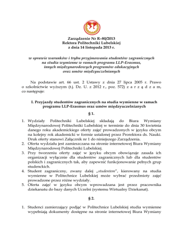 Zarządzenie Nr R–80/2013 Rektora Politechniki Lubelskiej z dnia 14 listopada 2013 r. w sprawie warunków i trybu przyjmowania studentów zagranicznych na studia wymienne w ramach programu LLP-Erasmus, innych międzynarodowych programów edukacyjnych oraz umów międzyuczelnianych Na podstawie art. 66 ust. 2 Ustawy z dnia 27 lipca 2005 r. Prawo o szkolnictwie wyższym (t.j. Dz. U. z 2012 r., poz. 572) z a r z ą d z a m, co następuje: I. Przyjazdy studentów zagranicznych na studia wymienne w ramach programu LLP-Erasmus oraz umów międzyuczelnianych § 1. 1. Wydziały Politechniki Lubelskiej składają do Biura Wymiany Międzynarodowej Politechniki Lubelskiej w terminie do dnia 30 kwietnia danego roku akademickiego oferty zajęć prowadzonych w języku obcym na kolejny rok akademicki w formie ustalonej przez Prorektora ds. Nauki. Druk oferty stanowi Załącznik nr 1 do niniejszego Zarządzenia. 2. Oferta wydziału jest zamieszczana na stronie internetowej Biura Wymiany Międzynarodowej Politechniki Lubelskiej. 3. Przy tworzeniu oferty zajęć w języku obcym obowiązuje zasada ich organizacji wyłącznie dla studentów zagranicznych lub dla studentów polskich i zagranicznych tak, aby zapewnić funkcjonowanie pełnych grup studenckich. 4. Student zagraniczny, zwany dalej „studentem”, kierowany na studia wymienne w Politechnice Lubelskiej może wybrać przedmioty zajęć prowadzone przez różne wydziały. 5. Oferta zajęć w języku obcym wprowadzana jest przez pracownika dziekanatu do bazy danych Uczelni (systemu Wirtualny Dziekanat). § 2. 1. Studenci zamierzający podjąć w Politechnice Lubelskiej studia wymienne wypełniają dokumenty dostępne na stronie internetowej Biura Wymiany Międzynarodowej Politechniki Lubelskiej, które obowiązują w procedurze kwalifikacyjnej na studia wymienne, tj.: formularz aplikacyjny oraz porozumienie o programie zajęć, zwane dalej „Learning Agreement”. Ponadto studenci dostarczają potwierdzenie znajomości języka obcego, w którym będą prowadzone zajęcia w Politechnice Lubelskiej, kopię paszportu lub dowodu osobistego w przypadku obywateli Unii Europejskiej oraz kopię dokumentu potwierdzającego ubezpieczenie. 2. Termin składania aplikacji na studia wymienne w Politechnice Lubelskiej przez studentów z uczelni partnerskich upływa dnia 15 czerwca danego roku akademickiego na semestr zimowy i cały następny rok akademicki oraz dnia 30 listopada danego roku akademickiego – na semestr letni. 3. „Learning Agreement” powinien zapewnić studentowi zaliczenie jednego bądź dwóch semestrów zgodnych z kierunkiem studiów, uwzględniając wymaganą liczbę punktów ECTS. 4. Wszelkie zmiany w „Learning Agreement” mogą być wprowadzane najpóźniej do miesiąca po rozpoczęciu semestru, w którym student będzie uczęszczał na zajęcia. § 3. 1. Student ma prawo przedłużyć pobyt w Politechnice Lubelskiej o jeden semestr w obrębie tego samego roku akademickiego. 2. Na okres przedłużenia pobytu w Politechnice Lubelskiej sporządzony zostaje nowy „Learning Agreement”. 3. Zgodę na przedłużenie pobytu w Politechnice Lubelskiej wydaje koordynator wydziałowy oraz prodziekan ds. studenckich danego wydziału. 4. W przypadku braku zgody na przedłużenie pobytu, studentowi przysługuje prawo odwołania się do Prorektora ds. Nauki w terminie 7 dni od dnia otrzymania negatywnej decyzji o przedłużeniu okresu studiów wymiennych. 5. Termin składania do Biura Wymiany Międzynarodowej Politechniki Lubelskiej kompletnego „Learning Agreement” na drugi semestr upływa dnia 30 listopada danego roku akademickiego. § 4. 1. Decyzje koordynatorów wydziałowych i prodziekanów ds. studenckich wydziałów o akceptacji przyjazdu studenta muszą zostać podjęte najpóźniej na 3 tygodnie przed rozpoczęciem semestru zimowego lub letniego danego roku akademickiego. 2. Listy studentów przyjeżdżających do Politechniki Lubelskiej w ramach programu LLP-Erasmus oraz umów międzyuczelnianych są ustalane przez koordynatorów wydziałowych Politechniki Lubelskiej i koordynatorów uczelni partnerskich w oparciu o zgłoszenia złożone w Biurze Wymiany Międzynarodowej Politechniki Lubelskiej. Aplikację studenta zagranicznego akceptują: koordynator wydziałowy oraz prodziekan ds. studenckich danego wydziału, składając podpisy na „Learning Agreement”. 3. Rzeczywista liczba studentów uczestnicząca w studiach wymiennych jest potwierdzana przez pracownika Biura Wymiany Międzynarodowej Politechniki Lubelskiej na podstawie zebranych potwierdzeń przyjazdu wypełnionych przez studentów po przybyciu do Uczelni. § 5. 1. Kryterium przypisania studenta do wydziału stanowi liczba punktów ECTS zaplanowana do uzyskania przez studenta w „Learning Agreement”. 2. Student zostaje przypisany do wydziału, z oferty którego wybrał największą liczbę punktów ECTS. 3. W przypadku gdy liczba punktów ECTS z różnych wydziałów jest równa, decyzję o przypisaniu studenta do wydziału podejmuje Prorektor ds. Nauki. 4. Przypisanie studenta do wydziału nie ulega zmianie w przypadku: 1) dokonania zmian w „Learning Agreement” prowadzących do zmiany struktury liczby punktów ECTS uzyskiwanych na zajęciach realizowanych w różnych wydziałach, 2) przedłużenia pobytu studenta na drugi semestr danego roku akademickiego i wyboru większości przedmiotów z innego wydziału niż ten, do którego został przypisany student. § 6. 1. Studentom zagranicznym przysługuje możliwość ubiegania się o zakwaterowanie w Domu Studenckim Politechniki Lubelskiej. Liczba miejsc w Domach Studenckich dla studentów zagranicznych na kolejny rok akademicki jest określana przez kierowników Domów Studenckich w porozumieniu z Prorektorem ds. Studenckich i zgłaszana do Biura Wymiany Międzynarodowej Politechniki Lubelskiej w terminie do dnia 30 kwietnia na kolejny rok akademicki. 2. Celem złożenia wniosku o zakwaterowanie w Domu Studenckim s