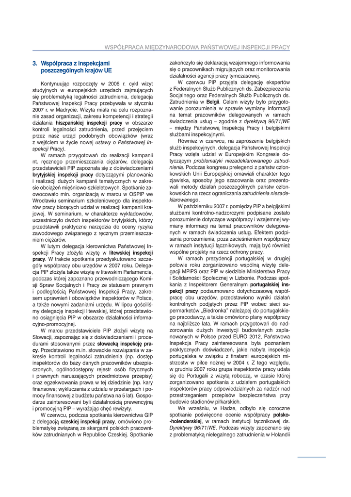 WSPÓŁPRACA MIĘDZYNARODOWA PAŃSTWOWEJ INSPEKCJI PRACY 3. Współpraca z inspekcjami poszczególnych krajów UE Kontynuując rozpoczęty w 2006 r. cykl wizyt studyjnych w europejskich urzędach zajmujących się problematyką legalności zatrudnienia, delegacja Państwowej Inspekcji Pracy przebywała w styczniu 2007 r. w Madrycie. Wizyta miała na celu rozpoznanie zasad organizacji, zakresu kompetencji i strategii działania hiszpańskiej inspekcji pracy w obszarze kontroli legalności zatrudnienia, przed przejęciem przez nasz urząd podobnych obowiązków (wraz z wejściem w życie nowej ustawy o Państwowej Inspekcji Pracy). W ramach przygotowań do realizacji kampanii nt. ręcznego przemieszczania ciężarów, delegacja przedstawicieli PIP zapoznała się z doświadczeniami brytyjskiej inspekcji pracy dotyczącymi planowania i realizacji dużych kampanii tematycznych w zakresie obciążeń mięśniowo-szkieletowych. Spotkanie zaowocowało min. organizacją w marcu w OSPIP we Wrocławiu seminarium szkoleniowego dla inspektorów pracy biorących udział w realizacji kampanii krajowej. W seminarium, w charakterze wykładowców, uczestniczyło dwóch inspektorów brytyjskich, którzy przedstawili praktyczne narzędzia do oceny ryzyka zawodowego związanego z ręcznym przemieszczaniem ciężarów. W lutym delegacja kierownictwa Państwowej Inspekcji Pracy złożyła wizytę w litewskiej inspekcji pracy. W trakcie spotkania przedyskutowano szczegóły współpracy obu urzędów w 2007 roku. Delegacja PIP złożyła także wizytę w litewskim Parlamencie, podczas której zapoznano przewodniczącego Komisji Spraw Socjalnych i Pracy ze statusem prawnym i podległością Państwowej Inspekcji Pracy, zakresem uprawnień i obowiązków inspektorów w Polsce, a także nowymi zadaniami urzędu. W lipcu gościliśmy delegację inspekcji litewskiej, której przedstawiono osiągnięcia PIP w obszarze działalności informacyjno-promocyjnej. W marcu przedstawiciele PIP złożyli wizytę na Słowacji, zapoznając się z doświadczeniami i procedurami stosowanymi przez słowacką inspekcję pracy. Przedstawiono m.in. słowackie rozwiązania w zakresie kontroli legalności zatrudnienia (np. dostęp inspektorów do bazy danych pracowników ubezpieczonych, ogólnodostępny rejestr osób fizycznych i prawnych naruszających przedmiotowe przepisy) oraz egzekwowania prawa w tej dziedzinie (np. kary finansowe; wykluczenia z udziału w przetargach i pomocy finansowej z budżetu państwa na 5 lat). Gospodarze zainteresowani byli działalnością prewencyjną i promocyjną PIP – wyrażając chęć rewizyty. W czerwcu, podczas spotkania kierownictwa GIP z delegacją czeskiej inspekcji pracy, omówiono problematykę związaną ze skargami polskich pracowników zatrudnianych w Republice Czeskiej. Spotkanie zakończyło się deklaracją wzajemnego informowania się o pracownikach migrujących oraz monitorowania działalności agencji pracy tymczasowej. W czerwcu PIP przyjęła delegację ekspertów z Federalnych Służb Publicznych ds. Zabezpieczenia Socjalnego oraz Federalnych Służb Publicznych ds. Zatrudnienia w Belgii. Celem wizyty było przygotowanie porozumienia w sprawie wymiany informacji na temat pracowników delegowanych w ramach świadczenia usług – zgodnie z dyrektywą 96/71/WE – między Państwową Inspekcją Pracy i belgijskimi służbami inspekcyjnymi. Również w czerwcu, na zaproszenie belgijskich służb inspekcyjnych, delegacja Państwowej Inspekcji Pracy wzięła udział w Europejskim Kongresie dotyczącym problematyki niezadeklarowanego zatrudnienia. Podczas kongresu prelegenci z państw członkowskich Unii Europejskiej omawiali charakter tego zjawiska, sposoby jego szacowania oraz prezentowali metody działań poszczególnych państw członkowskich na rzecz ograniczania zatrudnienia niezadeklarowanego. W październiku 2007 r. pomiędzy PIP a belgijskimi służbami kontrolno-nadzorczymi podpisane zostało porozumienie dotyczące współpracy i wzajemnej wymiany informacji na temat pracowników delegowanych w ramach świadczenia usług. Efektem podpisania porozumienia, poza zacieśnieniem współpracy w ramach instytucji łącznikowych, mają być również wspólne projekty na rzecz ochrony pracy. W ramach prezydencji portugalskiej w drugiej połowie roku zorganizowano wspólną wizytę delegacji MPiPS oraz PIP w siedzibie Ministerstwa Pracy i Solidarności Społecznej w Lizbonie. Podczas spotkania z Inspektorem Generalnym portugalskiej inspekcji pracy podsumowano dotychczasową współpracę obu urzędów, przedstawiono wyniki działań kontrolnych podjętych przez PIP wobec sieci supermarketów „Biedronka” należącej do portugalskiego pracodawcy, a także omówiono plany współpracy na najbliższe lata. W ramach przygotowań do nadzorowania dużych inwestycji budowlanych zaplanowanych w Polsce przed EURO 2012, Państwowa Inspekcja Pracy zainteresowana była poznaniem praktycznych doświadczeń, jakie nabyła inspekcja portugalska w związku z finałami europejskich mistrzostw w piłce nożnej w 2004 r. Z tego względu, w grudniu 2007 roku grupa inspektorów pracy udała się do Portugalii z wizytą roboczą, w czasie której zorganizowano spotkania z udziałem portugalskich inspektorów pracy odpowiedzialnych za nadzór nad przestrzeganiem przepisów bezpieczeństwa przy budowie stadionów piłkarskich. We wrześniu, w Hadze, odbyło się coroczne spotkanie poświęcone ocenie współpracy polsko-holenderskiej, w ramach instytucji łącznikowej ds. Dyrektywy 96/71/WE. Podczas wizyty zapoznano się z problematyką nielegalnego zatrudnienia w Holandii SPRAWOZDANIE GIP Z DZIAŁALNOŚCI PIP W 2007 r. oraz związanymi z tym doświadczeniami i procedurami stosowanymi przez holenderską inspekcję pracy. Ponadto, w związku z przejęciem przez Państwową Inspekcję Pracy koordynacji kampanii SLIC dotyczącej ręcznego przemieszczania ciężarów, holenderska inspekcja pracy odpowiedzi