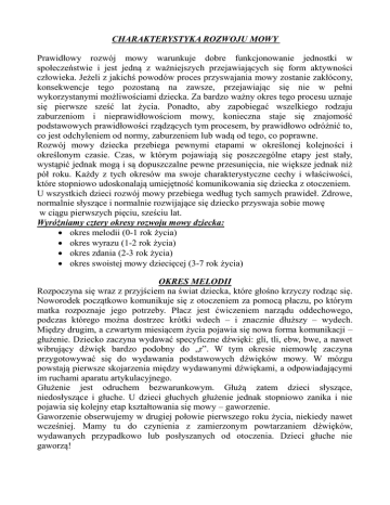 CHARAKTERYSTYKA ROZWOJU MOWY Prawidłowy rozwój mowy warunkuje dobre funkcjonowanie jednostki w społeczeństwie i jest jedną z ważniejszych przejawiających się form aktywności człowieka. Jeżeli z jakichś powodów proces przyswajania mowy zostanie zakłócony, konsekwencje tego pozostaną na zawsze, przejawiając się nie w pełni wykorzystanymi możliwościami dziecka. Za bardzo ważny okres tego procesu uznaje się pierwsze sześć lat życia. Ponadto, aby zapobiegać wszelkiego rodzaju zaburzeniom i nieprawidłowościom mowy, konieczna staje się znajomość podstawowych prawidłowości rządzących tym procesem, by prawidłowo odróżnić to, co jest odchyleniem od normy, zaburzeniem lub wadą od tego, co poprawne. Rozwój mowy dziecka przebiega pewnymi etapami w określonej kolejności i określonym czasie. Czas, w którym pojawiają się poszczególne etapy jest stały, wystąpić jednak mogą i są dopuszczalne pewne przesunięcia, nie większe jednak niż pół roku. Każdy z tych okresów ma swoje charakterystyczne cechy i właściwości, które stopniowo udoskonalają umiejętność komunikowania się dziecka z otoczeniem. U wszystkich dzieci rozwój mowy przebiega według tych samych prawideł. Zdrowe, normalnie słyszące i normalnie rozwijające się dziecko przyswaja sobie mowę w ciągu pierwszych pięciu, sześciu lat. Wyróżniamy cztery okresy rozwoju mowy dziecka: okres melodii (0-1 rok życia) okres wyrazu (1-2 rok życia) okres zdania (2-3 rok życia) okres swoistej mowy dziecięcej (3-7 rok życia) OKRES MELODII Rozpoczyna się wraz z przyjściem na świat dziecka, które głośno krzyczy rodząc się. Noworodek początkowo komunikuje się z otoczeniem za pomocą płaczu, po którym matka rozpoznaje jego potrzeby. Płacz jest ćwiczeniem narządu oddechowego, podczas którego można dostrzec krótki wdech – i znacznie dłuższy – wydech. Między drugim, a czwartym miesiącem życia pojawia się nowa forma komunikacji – głużenie. Dziecko zaczyna wydawać specyficzne dźwięki: gli, tli, ebw, bwe, a nawet wibrujący dźwięk bardzo podobny do „r”. W tym okresie niemowlę zaczyna przygotowywać się do wydawania podstawowych dźwięków mowy. W mózgu powstają pierwsze skojarzenia między wydawanymi dźwiękami, a odpowiadającymi im ruchami aparatu artykulacyjnego. Głużenie jest odruchem bezwarunkowym. Głużą zatem dzieci słyszące, niedosłyszące i głuche. U dzieci głuchych głużenie jednak stopniowo zanika i nie pojawia się kolejny etap kształtowania się mowy – gaworzenie. Gaworzenie obserwujemy w drugiej połowie pierwszego roku życia, niekiedy nawet wcześniej. Mamy tu do czynienia z zamierzonym powtarzaniem dźwięków, wydawanych przypadkowo lub posłyszanych od otoczenia. Dzieci głuche nie gaworzą! OKRES WYRAZU Dziecko w tym czasie potrafi użyć wszystkich samogłosek ustnych (i, y, e, a, o, u), wymawia też wiele spółgłosek (p, b, m, t, d, n, k, l). Głoski trudniejsze zastępuje łatwymi, a grupy spółgłoskowe często upraszcza, ułatwiając sobie kontakt słowny z otoczeniem. W miarę rozwoju sprawności narządów artykulacyjnych, dziecko coraz precyzyjniej wypowiada wyrazy adekwatne do konkretnych sytuacji życiowych. Czyni ono także znaczne postępy w zakresie rozumienia wypowiedzi otoczenia. Pod koniec tego okresu dziecko wymawia około 300 słów. OKRES ZDANIA W bardzo szybkim tempie wzbogaca się słownik dziecka, z 300 słów w wieku 2 lat do 1000 w wieku 3 lat. Wypowiedzi nie są jednak spójne pod względem logicznym i gramatycznym. U progu przedszkola dziecko wymawia wszystkie samogłoski (ustne: i, y, e, a, o, u; nosowe: ą, ę) oraz spółgłoski: p, b, m, ł, w, f, ś, ź, c, dź, ń, j, k, g, ki, gi, h, t, d, n, l. Pod koniec tego okresu mogą pojawić się głoski syczące (s, z, c, dz) a nawet szumiące (sz, ż, cz, dż). Często trudniejsze głoski dziecko zastępuje łatwiejszymi do wymówienia. Dla otoczenia jego mowa jest niemal w pełni zrozumiała. OKRES SWOISTEJ MOWY DZIECIĘCEJ W tym okresie dziecko prowadzi swobodne rozmowy. W wieku 5-6 lat zdobywa umiejętność wymawiania pełnego zasobu głoskowego języka polskiego, tzn. ostatecznie utrwalają się w wieku 3-4 lat głoski s, z, c, dz. Zwykle pod koniec 4 roku życia zostaje opanowana spółgłoska „ r”, a między 4 a 5 rokiem życia ustalają się spółgłoski sz, ż, cz, dź. Częstym zjawiskiem jest przestawianie głosek, a nawet – całych sylab, np.: dziecko mówi zamiast „ lokomotywa” - „ kolomotywa” . Pod koniec tego okresu wszystkie głoski powinny zostać opanowane, a mowa dziecka winna być w pełni zrozumiała dla otoczenia. Opracowano na podstawie Logopedia Pytania i odpowiedzi, Podręcznik akademicki pod redakcją T. Gałkowskiego, G. Jastrzębowskiej Opole 1999 Minimum logopedyczne nauczyciela przedszkola Warszawa 1978