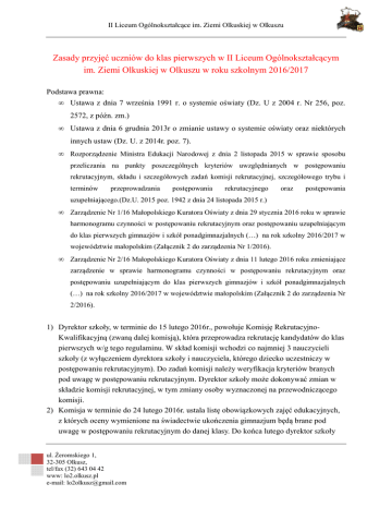 II Liceum Ogólnokształcące Ogólnokształc ce im. Ziemi Olkuskiej w Olkuszu Zasady przyjęć ęć uczniów do klas pierwszych w II Liceum Ogólnokształc Ogólnokształcącym im. Ziemi Olkuskiej w Olkuszu w roku szkolnym 2016/2017 2016/2017 Podstawa prawna: • Ustawa z dnia 7 września wrześ 1991 r. o systemie oświaty wiaty (Dz. U z 2004 r. Nr 256, poz. 2572, z późn. zm.) • Ustawa z dnia 6 grudnia 2013r o zmianie ustawy o systemie oświaty oświaty oraz niektórych innych ustaw (Dz. U. z 2014r. poz. 7). • Rozporządzenie dzenie Ministra Edukacji Narodowej z dnia 2 listopada 2015 w sprawie sposobu przeliczania na punkty poszczególnych kryteriów uwzględnianych uwzględnianych w post postępowaniu rekrutacyjnym, składu i szczegółowych zadań komisji rekrutacyjnej, szczegółowego trybu i terminów przeprowadzania post powania postępowania rekrutacyjnego oraz postępowania post uzupełniającego.(Dz.U. o.(Dz.U. 2015 poz. 1942 z dnia 24 listopada 2015 r.) • Zarządzenie Nr 1/16 Małopolskiego Kuratora Kurato Oświaty z dnia 29 stycznia 2016 roku w sprawie harmonogramu czynności ści w post postępowaniu rekrutacyjnym oraz postępowaniu ępowaniu uzupełniaj uzupełniającym do klas pierwszych gimnazjów i szkół ponadgimnazjalnych (…) na rok szkolny 2016/2017 w województwie małopolskim (Załącznik 2 do zarządzenia Nr 1/2016). • Zarządzenie Nr 2/16 Małopolskiego Kuratora Kurato Oświaty wiaty z dnia 11 lutego 2016 roku zmieniające zmieniaj zarządzenie dzenie w sprawie harmonogramu czynno czynności w postępowaniu powaniu rekrutacyjnym oraz postępowaniu powaniu uzupełniającym uzupełniającym do klas pierwszych gimnazjów i szkół po ponadgimnazjalnych (…) na rok szkolny 2016/2017 w województwie małopolskim (Załącznik ącznik 2 do zarządzenia zarz Nr 2/2016). 1) Dyrektor szkoły, ły, w terminie do 15 lutego 2016r., 201 powołuje Komisjęę RekrutacyjnoRekrutacyjno Kwalifikacyjną (zwanąą dalej komisją), komisj która przeprowadza rekrutacjęę kandydatów do klas pierwszych wszych w/g tego regulaminu. W skład komisji wchodzi co najmniej 3 nauczycieli szkoły (z wyłączeniem czeniem dyrektora szkoły i nauczyciela, którego dziecko uczestniczy w postępowaniu aniu rekrutacyjnym). Do zadań zada komisji należyy weryfikacja kryteriów branych pod uwagę w postępowaniu ępowaniu rekrutacyjnym. Dyrektor szkoły może może dokonywać dokonywa zmian w składzie komisji rekrutacyjnej, w tym zmiany osoby wyznaczonej na przewodniczącego przewodnicz komisji. 2) Komisja w terminie erminie do 24 lutego 2016r. ustala listę obowiązkowych zkowych zajęć edukacyjnych, z których oceny wymienione na świadectwie ukończenia gimnazjum będą bę ą brane pod uwagę w postępowaniu powaniu rekrutacyjnym do danej klasy. Do końca końca lutego dyrektor szkoły ul. Żeromskiego 1, 32-305 Olkusz, tel/fax (32) 643 04 42 www: lo2.olkusz.pl e-mail: [email protected] II Liceum Ogólnokształcące Ogólnokształc ce im. Ziemi Olkuskiej w Olkuszu podaje do publicznej wiadomości wiadomo poprzez umieszczenie na stronie internetowej szkoły, listę obowiązkowych zkowych zajęć edukacyjnych, z których oceny wymienione na świadectwie ukończenia czenia gimnazjum będą brane pod uwagę w postępowaniu powaniu rekrutacyjnym do danej klasy. 3) Warunkiem przyjęcia ęcia do klasy pierwszej jest ukończenie uko czenie gimnazjum publicznego lub gimnazjum niepublicznego o uprawnieniach szkoły publicznej. 4) Kandydaci do szkoły, w terminie od 11 kwietnia do 28 czerwca 2016 roku r dokonują rejestracji do systemu rekrutacji elektronicznej w macierzystym gimnazjum jeżeli je gimnazjum jest objęte ęte tym systemem lub indywidualnie. Kandydat dokonuje rejestracji elektronicznej do maksymalnie trzech szkół. W obrębie obr bie szkoły kandydaci mogą mog wybrać dowolną ilość oddziałów. a) Kandydat w terminie od 11 kwietnia do 28 czerwca 2016 roku składa wniosek o przyjęcie doo szkoły w sekretariacie II LO, LO o ile jest to szkoła pierwszego wyboru. 5) Kandydaci zobowiązani ązani są dostarczyć w terminie od 24 czerwcaa do 28 czerwca 2016 roku oryginał lub kopięę świadectwa i oryginał lub kopię kopi zaświadczenia wiadczenia o wyniku egzaminu gimnazjalnego do szkoły pierwszego wyboru. Kopia świadectwa i kopia zaświadczenia wiadczenia o wynikach egzaminu powinny być by poświadczone wiadczone za zgodność zgodno z oryginałem nałem przez dyrektora gimnazjum. Wszystkie informacje o kandydatach weryfikuje II LO, o ile jest szkołąą pierwszego wyboru. a) Do 30 czerwca 2016 roku komisja rekrutacyjna przeprowadza weryfikację weryfikacj wniosków o przyjęcie cie i dokumentów potwierdzających potwierdzaj spełnienie przez ez kandydata warunków i kryteriów branych pod uwagę uwag w postępowaniu rekrutacyjnym. 6) Do 15 lipca 2016 roku, nastąpi nastąpi ogłoszenie listy kandydatów zakwalifikowanych do oddziałów klasy pierwszej oraz listy kandydatów niezakwalifikowanych do oddziałów klasy pierwszej. 7) Do 26 lipca 2016 roku rodzice kandydata albo kandydat pełnoletni umieszczeni na listach zakwalifikowanych do przyjęcia przyję zobowiązani są potwierdzić wolęę podjęcia podję nauki w II LO poprzez dostarczenie oryginałów świadectwa ukończenia czenia gimnazjum i zaświadczenia zaś o wynikach egzaminu gimnazjalnego o ile nie zostały one złożone zło one w uzupełnieniu wniosku o przyjęcie cie do szkoły. Należy Należ także dołączyć następujące dokumenty: a) kartę informacyjną b) kartę zdrowia i szczepień c) dwie fotografie d) laureaci i finaliści ci konkursów przedmiotowych, olimpiad, zawodów itp. (szczebla ( co najmniej wojewódzkiego) dołączają doł dyplom laureata lub kserokopię z potwierdzoną zgodnością z oryginałem przez dyrektora dyrektor gimnazjum. ul. Żeromskiego 1, 32-305 Olkusz, tel/fax (32) 643 04 42 www: lo2.olkusz.pl e-mail: [email protected] II Liceum Ogólnokształcące Ogólnokształc ce i