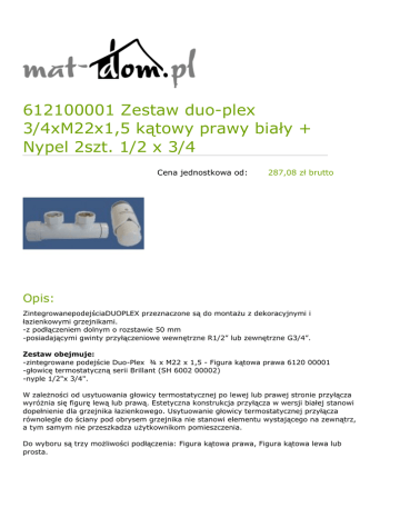 612100001 Zestaw duo-plex 3/4xM22x1,5 kątowy prawy biały + Nypel 2szt. 1/2 x 3/4 Cena jednostkowa od: 287,08 zł brutto Opis: ZintegrowanepodejściaDUOPLEX przeznaczone są do montażu z dekoracyjnymi i łazienkowymi grzejnikami. -z podłączeniem dolnym o rozstawie 50 mm -posiadającymi gwinty przyłączeniowe wewnętrzne R1/2” lub zewnętrzne G3/4”. Zestaw obejmuje: -zintegrowane podejście Duo-Plex ¾ x M22 x 1,5 - Figura kątowa prawa 6120 00001 -głowicę termostatyczną serii Brillant (SH 6002 00002) -nyple 1/2"x 3/4". W zależności od usytuowania głowicy termostatycznej po lewej lub prawej stronie przyłącza wyróżnia się figurę lewą lub prawą. Estetyczna konstrukcja przyłącza w wersji białej stanowi dopełnienie dla grzejnika łazienkowego. Usytuowanie głowicy termostatycznej przyłącza równolegle do ściany pod obrysem grzejnika nie stanowi elementu wystającego na zewnątrz, a tym samym nie przeszkadza użytkownikom pomieszczenia. Do wyboru są trzy możliwości podłączenia: Figura kątowa prawa, Figura kątowa lewa lub prosta. Należy pamiętać, że głowica termostatyczna montowana jest na zasilaniu grzejnika. Dodatkowe informacje: regulacja termostatyczna zakres regulacji 0-28°C głowica termostatyczna z czujnikiem cieczowym zakres nastaw Kv 0,06-1,03 [Kvs 1,00] maksymalna temperatura pracy 120°C ciśnienie nominalne 1Mpa rozstaw przyłączy 50mm prawy biały Powered by TCPDF (www.tcpdf.org)