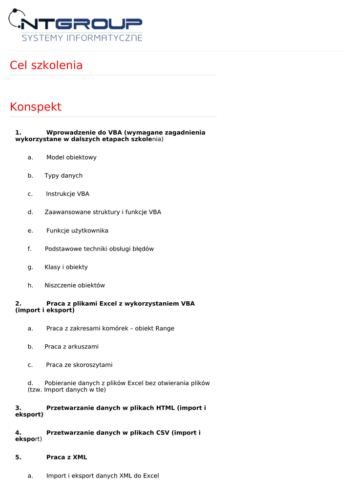Cel szkolenia Konspekt 1. Wprowadzenie do VBA (wymagane zagadnienia wykorzystane w dalszych etapach szkolenia) a. Model obiektowy b. Typy danych c. Instrukcje VBA d. Zaawansowane struktury i funkcje VBA e. Funkcje użytkownika f. Podstawowe techniki obsługi błędów g. Klasy i obiekty h. Niszczenie obiektów 2. Praca z plikami Excel z wykorzystaniem VBA (import i eksport) a. Praca z zakresami komórek – obiekt Range b. Praca z arkuszami c. Praca ze skoroszytami d. Pobieranie danych z plików Excel bez otwierania plików (tzw. Import danych w tle) 3. Przetwarzanie danych w plikach HTML (import i eksport) 4. Przetwarzanie danych w plikach CSV (import i eksport) 5. Praca z XML a. Import i eksport danych XML do Excel b. Tworzenie mapy plików XSD 6. Zastosowanie obiektów ADO 7. Integracja Excel, poprzez VBA z: a. Microsoft Access Nazwa: b. Microsoft SQL Server Szkolenie Import eksport danych w MS Excel - operacje zaawansowane c. PostgreSQL Czas trwania: 2 dni 8. Budowanie formularzy (UserForm) Ilość godzin: 9. Dodatki COM i ich tworzenie 16 Język: 10. Wykorzystanie zewnętrznych bibliotek DLL Prowadzący: Trener Microsoft, analityk, wieloletni praktyk Lokalizacja: NT Group Łódź, siedziba klienta, lub dowolne miasto w Polsce Cena szkolenia: Cena do uzgodnienia. Prosimy o kontakt: 801 011 684 11. Współpraca z programami pakietu Office a. Eksport danych do Microsoft Word b. Eksport danych do Microsoft PowerPoint c. Eksport danych do Microsoft Outlook Dodatkowe informacje Dostępne terminy W cenę szkolenia wliczony jest: Certyfikat ukończenia szkolenia NT Group Sp. z o.o. Kawa, herbata, sładki poczęstunek . Obiad NT GROUP Sp. z o.o. 90-418 Łódź, Al. T. Kościuszki 39 III piętro Firma posiada wpis w Urzędzie Miasta Łodzi jako placówka kształcenia ustawicznego. infolina 801 011 684 Tel.: +48 42 655-33-77; Fax: +48 42 630-15-63 e-mail: [email protected] NT Group Systemy Informatyczne Sp. z o.o. Krajowy Rejestr Sądowy Konto Bankowe 90-418 Łódź, Al. T. Kościuszki 39 III piętro KRS 0000214993 Kredyt Bank S.A. tel.: +42 6553377 Sąd Rejonowy dla Łodzi-Śródmieścia Rozliczenie Krajowe: tel. / fax. +42 6301563 w Łodzi, XX Wydział KRS 71 1500 1246 1215 4005 5991 0000 e-mail: [email protected] www.ntgroup.pl Rozliczenie Zagraniczne: Regon: 470557218 PL 71 1500 1246 1215 4005 5991 0000 NIP: 7251888624 KRDBPLPW