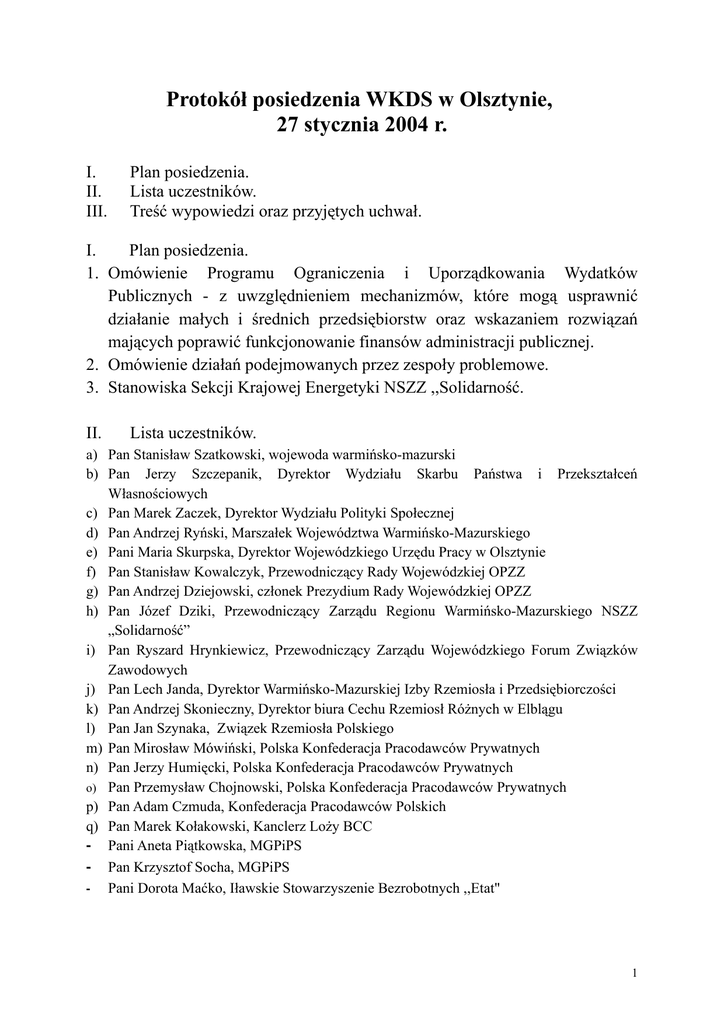 Protokół posiedzenia WKDS w Olsztynie, 27 stycznia 2004 r. I. II. III. Plan posiedzenia. Lista uczestników. Treść wypowiedzi oraz przyjętych uchwał. I. Plan posiedzenia. 1. Omówienie Programu Ograniczenia i Uporządkowania Wydatków Publicznych - z uwzględnieniem mechanizmów, które mogą usprawnić działanie małych i średnich przedsiębiorstw oraz wskazaniem rozwiązań mających poprawić funkcjonowanie finansów administracji publicznej. 2. Omówienie działań podejmowanych przez zespoły problemowe. 3. Stanowiska Sekcji Krajowej Energetyki NSZZ ,,Solidarność. II. Lista uczestników. a) Pan Stanisław Szatkowski, wojewoda warmińsko-mazurski b) Pan Jerzy Szczepanik, Dyrektor Wydziału Skarbu Państwa i Przekształceń Własnościowych c) Pan Marek Zaczek, Dyrektor Wydziału Polityki Społecznej d) Pan Andrzej Ryński, Marszałek Województwa Warmińsko-Mazurskiego e) Pani Maria Skurpska, Dyrektor Wojewódzkiego Urzędu Pracy w Olsztynie f) Pan Stanisław Kowalczyk, Przewodniczący Rady Wojewódzkiej OPZZ g) Pan Andrzej Dziejowski, członek Prezydium Rady Wojewódzkiej OPZZ h) Pan Józef Dziki, Przewodniczący Zarządu Regionu Warmińsko-Mazurskiego NSZZ „Solidarność” i) Pan Ryszard Hrynkiewicz, Przewodniczący Zarządu Wojewódzkiego Forum Związków Zawodowych j) Pan Lech Janda, Dyrektor Warmińsko-Mazurskiej Izby Rzemiosła i Przedsiębiorczości k) Pan Andrzej Skonieczny, Dyrektor biura Cechu Rzemiosł Różnych w Elblągu l) Pan Jan Szynaka, Związek Rzemiosła Polskiego m) Pan Mirosław Mówiński, Polska Konfederacja Pracodawców Prywatnych n) Pan Jerzy Humięcki, Polska Konfederacja Pracodawców Prywatnych o) Pan Przemysław Chojnowski, Polska Konfederacja Pracodawców Prywatnych p) Pan Adam Czmuda, Konfederacja Pracodawców Polskich q) Pan Marek Kołakowski, Kanclerz Loży BCC - Pani Aneta Piątkowska, MGPiPS - Pan Krzysztof Socha, MGPiPS - Pani Dorota Maćko, Iławskie Stowarzyszenie Bezrobotnych ,,Etat" 1 - Pani Zofia Borowska, Rada Organizacji Pozarządowych w Obszarze Bezrobocia warm.-maz. Pan Waldemar Kozłowski, Warmińsko-Mazurski NSZZ ,,Solidarność 80" Pan Stefan Duk, Marszałek W-M Sejmiku Gospodarczego Pan Jan Citko, Dyrektor Oddziału Banku Gospodarki Żywnościowej w Olsztynie Pan Zbigniew Kalwas, Dyrektor Oddziału PKO BP w Olsztynie woj. III. Treść wypowiedzi oraz przyjętych uchwał. Pan Stanisław Szatkowski powitał osoby uczestniczące w spotkaniu. Przedstawił przybyłych na posiedzenie gości z Ministerstwa Gospodarki, Pracy i Polityki Społecznej. Zapoznał członków WKDS z planem posiedzenia. Pan wojewoda rozpoczynając dyskusję na temat Programu Uporządkowania i Ograniczenia Finansów Publicznych zauważył, że panująca sytuacja gospodarcza Polski wymaga stanowczych działań skierowanych na niwelowanie deficytu budżetowego. Obecny wysoki wzrost gospodarczy nie może być bowiem jedynym środkiem naprawczym. Program rządowy przedstawia diagnozę obecnego stanu oraz środki zaradcze, które mają poprawić panującą sytuację. Pan Szatkowski zauważył, że pewne środki racjonalizujące zostały już podjęte. Nad najbardziej kontrowersyjną częścią tego programu, związaną z cięciami socjalnymi, prowadzona była publiczna debata. Nikt zdaniem wojewody nie kwestionuje potrzeby naprawy finansów publicznych, różne są jednak poglądy co do sposobów za pomocą jakich proces ten powinien być przeprowadzony. We wstępie podkreślony został również fakt, że dynamiczny rozwój gospodarczy jest szczególnie potrzebny na Warmii i Mazurach. Region ten bowiem boryka się z wysokim poziomem bezrobocia. Mimo poprawy na tym polu nadal bez pracy pozostaje jednak około 160 tys. osób. Program naprawy finansów publicznych zakładający racjonalizację wydatków powinien wpłynąć również pozytywnie na te sferę. Pani Aneta Piątkowska zauważyła, że sam wzrost gospodarczy nie jest w stanie zlikwidować deficytu finansów publicznych. Plan rządowy zakłada cięcia w dwóch sferach: wydatki w administracji (są już realizowane - zmniejszenie liczby samochodów służbowych, likwidacja części stanowisk w ministerstwach) oraz wydatków socjalnych. Co do drugiej tej kwestii prowadzona była debata ekspercka - pięć obszarów: wiek emerytalny, aktywizacja zawodowa osób starszych, system rent i emerytur, sytuacja osób niepełnosprawnych, ubezpieczenia społeczne rolników. Proponowane zmiany do założeń opracowanych przez premiera Hausnera zakładały: wiek emerytalny - zrównanie od 2014 r. - wprowadzenie do 2020 r., wprowadzenie elastyczności pomiędzy 2 60 a 65 rokiem życia (tutaj decyzja o pracy należałaby do samego zainteresowanego). Aktywizacja zawodowa osób starszych - nadal prowadzone są na ten temat dyskusje. System rent i emerytur - wycofanie się z pierwotnych założeń w sprawach waloryzacji tych świadczeń w najbliższym okresie - ze względów czasowych. Pan Stanisław Szatkowski stwierdził, że rzeczą niezwykle ważną jest prowadzenie dalszej debaty nad programem. Rząd próbuje wybrać jak najbardziej racjonalne rozwiązania. Efektem tego są stałe korekty w planie zwłaszcza w sferze socjalnej. Pan Ryszard Hrynkiewicz oceniając rządowy program przedstawił oficjalne stanowisko Forum Związków Zawodowych w jego przedmiocie. Forum negatywnie oceniło program. Stanowisko w załączeniu. Pan Adam Czmuda podsumował część programu dotyczącą aktywizacji zawodowej i społecznej osób niepełnosprawnych. Firma Czmuda S.A. jest zakładem pracy osób niepełnosprawnych. Zauważył, że rząd zamierza zmienić formę dopłat, nie zamierza jednak ich likwidować. Pozytywnym postulatem jest likwidacja funduszu centralnego. Racjonalnym rozwiązaniem jest przeniesienie pewnych zadań na ośrodki wojewódzkie - są one bowiem bliżej potencjalnych beneficjentów. Likwidacja pewnych przywilejów pracowniczych osób niepełnosprawnych zwiększy jednocześnie ich konkurencyjność. Przypisanie dot