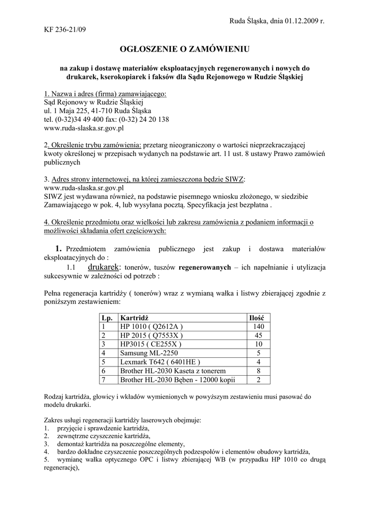 Ruda Śląska, dnia 01.12.2009 r. KF 236-21/09 OGŁOSZENIE O ZAMÓWIENIU na zakup i dostawę materiałów eksploatacyjnych regenerowanych i nowych do drukarek, kserokopiarek i faksów dla Sądu Rejonowego w Rudzie Śląskiej 1. Nazwa i adres (firma) zamawiającego: Sąd Rejonowy w Rudzie Śląskiej ul. 1 Maja 225, 41-710 Ruda Śląska tel. (0-32)34 49 400 fax: (0-32) 24 20 138 www.ruda-slaska.sr.gov.pl 2. Określenie trybu zamówienia: przetarg nieograniczony o wartości nieprzekraczającej kwoty określonej w przepisach wydanych na podstawie art. 11 ust. 8 ustawy Prawo zamówień publicznych 3. Adres strony internetowej, na której zamieszczona będzie SIWZ: www.ruda-slaska.sr.gov.pl SIWZ jest wydawana również, na podstawie pisemnego wniosku złożonego, w siedzibie Zamawiającego w pok. 4, lub wysyłana pocztą. Specyfikacja jest bezpłatna . 4. Określenie przedmiotu oraz wielkości lub zakresu zamówienia z podaniem informacji o możliwości składania ofert częściowych: 1. Przedmiotem zamówienia publicznego jest zakup i dostawa materiałów eksploatacyjnych do : 1.1 drukarek: tonerów, tuszów regenerowanych – ich napełnianie i utylizacja sukcesywnie w zależności od potrzeb : Pełna regeneracja kartridży ( tonerów) wraz z wymianą wałka i listwy zbierającej zgodnie z poniższym zestawieniem: Lp. 1 2 3 4 5 6 7 Kartridż HP 1010 ( Q2612A ) HP 2015 ( Q7553X ) HP3015 ( CE255X ) Samsung ML-2250 Lexmark T642 ( 6401HE ) Brother HL-2030 Kaseta z tonerem Brother HL-2030 Bęben - 12000 kopii Ilość 140 45 10 5 4 8 2 Rodzaj kartridża, głowicy i wkładów wymienionych w powyższym zestawieniu musi pasować do modelu drukarki. Zakres usługi regeneracji kartridży laserowych obejmuje: 1. przyjęcie i sprawdzenie kartridża, 2. zewnętrzne czyszczenie kartridża, 3. demontaż kartridża na poszczególne elementy, 4. bardzo dokładne czyszczenie poszczególnych podzespołów i elementów obudowy kartridża, 5. wymianę wałka optycznego OPC i listwy zbierającej WB (w przypadku HP 1010 co drugą regenerację), 6. 7. 8. 9. 10. 11. 12. 13. w razie konieczności wymiana innych zużytych podzespołów (opcjonalnie), uzupełnienie kartridża, założenie plomby, montaż kartridża, końcowy test wydruku (do wglądu dla zamawiającego), czyszczenie końcowe, test skuteczności zabezpieczenia (szczelność), pakowanie. 1.2 drukarek: fabrycznie nowych lub równoważnych w oryginalnych opakowaniach zamkniętych hermetycznie przez producenta Lp. 1 Kartridż HP3015 ( CE255X ) Ilość 10 1.3 kserokopiarek i faksów: tonerów, kaset z tonerem fabrycznie nowych i nierefabrykowanych, lub równoważnych w oryginalnych opakowaniach zamkniętych hermetycznie przez producenta Lp. 1 Kartridż / toner Toner do kserokopiarki Ilość 9 Develop ineo 250 2 Toner do kserokopiarki 2 Konica Minolta Bizhub 250 Lp. 1 2 Kaseta z tonerem Kaseta z tonerem do Faxu Panasonic KX- FL513/613 KX-FA83E Kaseta z tonerem do Faxu Panasonic KX -MB 773 KX-FAT92 Ilość 6 10 do siedziby Sądu Rejonowego w Rudzie Śląskiej przy ul. 1 Maja 225 w wymienionym powyżej asortymencie i podanych ilościach . Na potrzeby niniejszego postępowania ustala się, że: - za nowe – uznaje się materiały eksploatacyjne nieużywane, nie regenerowane, nie napełniane powtórnie, na aktualnej gwarancji producenta. Wskaźnik poziomu atramentu sprzętu prawidłowo współpracuje z oryginalnymi lub równoważnymi materiałami eksploatacyjnymi: - za nierefabrykowane uznaje się materiały eksploatacyjne nie napełniane powtórnie, w oryginalnych opakowaniach fabrycznych; - za oryginalne uznaje się materiały eksploatacyjne wyprodukowane przez producenta sprzętu; - za toner ( kartridż) uznaje się wkład drukujący do drukarek laserowych, kserokopiarek i faksów. 2. Dostawca materiałów eksploatacyjnych do drukarek, kserokopiarek i faksów odbiera zużyte tonery i dokonuje utylizacji zgodnie z obowiązującymi przepisami (w przypadku drukarek ma to odniesienie do tych tonerów , które nie nadają się do dalszej eksploatacji – regeneracji). W przypadku zabrudzenia drukarek przez nieszczelność tonera Wykonawca zobowiązuje się wykonać bezpłatne czyszczenie drukarki i dostarczyć w zamian toner wolny od wad na własny koszt. 4. Dostawca zagwarantuje, że materiały eksploatacyjne są wolne od usterek materiałowych. W przypadku stwierdzenia wady uniemożliwiającej wykorzystanie produktu, dostawca nieodpłatnie wymieni go na produkt wolny od wad. 5. Wymagania techniczne dotyczące materiałów eksploatacyjnych: 5.1 Zamawiający dopuszcza możliwość przedstawienia w ofercie asortymentu równoważnego (innego niż podany „z nazwy” przez Zamawiającego w opisie przedmiotu zamówienia) pod warunkiem, że będzie o takich samych lub lepszych parametrach technicznych, jakościowych, funkcjonalnych oraz użytkowych 5.2. W przypadku zaoferowania materiałów eksploatacyjnych równoważnych Wykonawca zobowiązany jest do przyjęcia na siebie zobowiązania, iż w przypadku awarii urządzeń spowodowanych zastosowaniem równoważnika zobowiązuje się do dokonania naprawy na własny koszt i przyjęcia odpowiedzialności za straty, które poniesie w takim przypadku Zamawiający (np. związane z utratą gwarancji). 5.3. Ponadto oferowane równoważne i regenerowane materiały eksploatacyjne muszą spełniać warunek bezkonfliktowej pracy z danym urządzeniem w stopniu nie mniejszym niż w wskazany z symbolu oryginału, a w szczególności dotyczy to wydajności danego tonera, która nie może być mniejsza niż w materiałach oryginalnych. 5.4 Oferowane nowe materiały eksploatacyjne muszą być objęte minimum 2 letnią gwarancją liczoną od daty dostarczenia do zamawiającego. Natomiast gwarancja na poprawne działanie zregenerowanych przez Wykonawcę tonerów udzielana jest na cały okres eksploatacji , aż do wyczerpania środka barwiącego. 3. 6. Z uwagi na różnorodny asortyment zamówienie zostało podzielone na części tj: Część