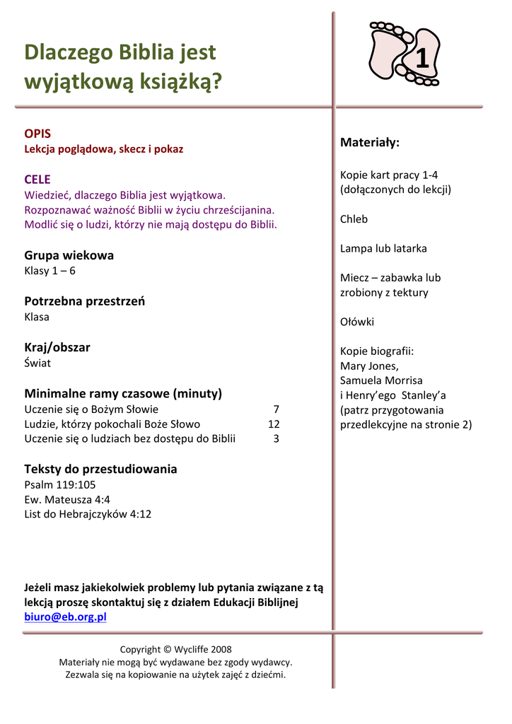 Dlaczego Biblia jest wyjątkową książką? Materiały: OPIS Lekcja poglądowa, skecz i pokaz CELE Wiedzieć, dlaczego Biblia jest wyjątkowa. Rozpoznawać ważność Biblii w życiu chrześcijanina. Modlić się o ludzi, którzy nie mają dostępu do Biblii. Grupa wiekowa Klasy 1 – 6 Potrzebna przestrzeń Klasa Kraj/obszar Świat Minimalne ramy czasowe (minuty) Uczenie się o Bożym Słowie Ludzie, którzy pokochali Boże Słowo Uczenie się o ludziach bez dostępu do Biblii 1 7 12 3 Teksty do przestudiowania Psalm 119:105 Ew. Mateusza 4:4 List do Hebrajczyków 4:12 Jeżeli masz jakiekolwiek problemy lub pytania związane z tą lekcją proszę skontaktuj się z działem Edukacji Biblijnej [email protected] Copyright © Wycliffe 2008 Materiały nie mogą być wydawane bez zgody wydawcy. Zezwala się na kopiowanie na użytek zajęć z dziećmi. Kopie kart pracy 1-‐4 (dołączonych do lekcji) Chleb Lampa lub latarka Miecz – zabawka lub zrobiony z tektury Ołówki Kopie biografii: Mary Jones, Samuela Morrisa i Henry’ego Stanley’a (patrz przygotowania przedlekcyjne na stronie 2) Przygotowania do zajęć Pobierz i wydrukuj historie o Mary Jones, Samuelu Morrisie i Henrym Stanley’u ze strony internetowej: http://www.bsm.org.pl/files/pdf/Lekcja1Biografie.pdf Skopiuj je (jedna biografia na 3-‐5 uczniów). Skopiuj dla każdego dziecka karty pracy 1-‐4. http://www.bsm.org.pl/files/pdf/L1karty.pdf Na środku każdego stołu umieść ołówki. Bieżąca prośba modlitewna o ludzi bez dostępu do Biblii znajduje się na stronie internetowej: www.wycliffe.org/Pray/BiblelessPeoplesPrayerProject.aspx Zajęcia Zwróć uwagę uczniów na rekwizyty przedstawiające chleb, światło i miecz. Zadaj dzieciom następujące pytania i pozwól im na nie odpowiedzieć: Dlaczego chleb jest ważny? Dlaczego światło jest równie ważne? W jaki sposób można używać miecza? Po kilku odpowiedziach dzieci, kontynuuj. Czy wiecie co wspólnego mają ze sobą wszystkie te rzeczy? Gdy kilkoro uczniów poda już swoje pomysły, przejdź do kart pracy 1-‐4. Następnie poproś ochotników by przeczytali tekst zawarty w „chmurkach” na karcie pracy 2. Materiały: Chleb Światło Miecz Karty pracy 1-‐2 Biblie Ołówki Zadaj dzieciom następujące pytania: Czy odkryliście co chleb, światło i miecz mają ze sobą wspólnego? W jakim sensie są one takie same? Daj uczniom możliwość odpowiedzi, po czym kontynuuj. Zgadza się. Biblia jest jak wszystkie te rzeczy. Ona karmi nas jak chleb. Daje nam światło, jak lampa. Daje nam siłę, jak miecz. My naprawdę bardzo potrzebujemy tego wszystkiego, co daje nam Biblia! Wszystkie te opisy pochodzą właśnie z Biblii. Spróbujcie dopasować każdy z opisów do wersetu, z którego on pochodzi. Potrzebuję paru ochotników, by sprawdzili wersety wymienione na karcie pracy 2. Lekcja 1 – Dlaczego Biblia jest niezwykłą książką? str. 2 Zachęć ochotników, by przeczytali swoje wersety. Wspólnie z uczniami dopasuj wersety do odpowiednich obrazków. Poproś uczniów by rysując linie połączyli odpowiadające sobie wersety i obrazki. (chleb – Ew. Mat 4:4, światło – Ps. 119:105, miecz – Hebr. 4:12) Zapytaj uczniów: Czy wiecie jak wyjątkowa jest Biblia? Użyjcie swojej wyobraźni i weź udział w podróży do Centrum Badawczego WordSpring i odkryjcie sami. Poświęć trochę czasu by przyjrzeć się karcie pracy 1, przedyskutuj: Co zauważyliście? Jak myślicie, dlaczego chłopiec znajdujący się obok książki mówi, że ona jest żywa? Tak, to jest Słowo Boże. Werset z Listu do Hebrajczyków mówi, że Słowo Boże jest żywe. Kto przeczyta fakty o Biblii zamieszczone na niebieskich stronicach Biblii na dole tej kolorowej strony? Wybierz ochotnika. Gdy skończy czytać, zadaj pytanie umieszczone na końcu strony, zapytaj: Jak myślicie, dlaczego Biblia jest najbardziej znaną książką na świecie? Napiszcie swoje odpowiedzi na końcu tej strony. Kiedy skończycie pisać, zwróćcie się do swojego sąsiada (albo porozmawiajcie z innymi osobami przy waszym stole) i podzielcie się tym, co napisaliście. Materiały: Biografie Karty pracy 2 i 3 Ołówki LUDZIE, KTÓRZY POKOCHALI BOŻE SŁOWO Powiedz dzieciom: Teraz rozdam każdej grupie biografię lub historię osoby, która pokochała Biblię. Każda z tych osób pokazała miłość do Bożego Słowa w szczególny dla siebie sposób. Każda z grup przedstawi historię osoby, którą jej przydzielę. W czasie przygotowywania scenki skupcie się głównie na tym, żeby pokazać w jaki sposób dana osoba wyraziła swą miłość do Biblii. Zanim rozdam wam historie, spójrzcie na karty pracy 2 i 3 jeszcze raz. Widzicie pytania zamieszczone obok obrazków przedstawia-‐ jących Mary Jones, Samuela Morrisa i Henry’ego Stanley’a? Wasze skecze powinny zawierać odpowiedzi na pytania znajdujące się obok waszych postaci. Macie jakieś pytania? Rozdaj biografie dzieciom podzielonym na około czteroosobowe grupki. Daj grupom 5 – 10 minut na przygotowanie skeczy. Lekcja 1 – Dlaczego Biblia jest niezwykłą książką? str. 3 Gdy minie czas przygotowywania skeczy, zaproś grupy do przedstawienia swoich scenek pozostałym uczestnikom. Gdy przedstawienia dobiegną końca, powiedz: Dziękuję wszystkim! Myślę, że każdy z nas będzie umiał odpowiedzieć na pytania zawarte na kartach pracy 2 i 3. Przeczytaj pytania na stronach 2 i 3 i razem z uczniami przedyskutuj odpowiedzi. Poinstruuj dzieci: Opowiedzcie swojemu sąsiadowi, jak Biblia odmienia wasze życie. Daj dzieciom trochę czasu, by podzieliły się swoimi opowieściami, po czym zapytaj: Kto jest na tyle odważny, by opowiedzieć nam wszystkim, jak Biblia zmienia jego życie? Niech kilku ochotników podzieli się swoimi opowieściami. UCZENIE SIĘ O LUDZIACH BEZ DOSTĘPU DO BIBLII Powiedz uczniom: Nauczyliśmy się już, dlaczego Boże Słowo jest wyjątkowe i czemu go potrzebujemy. Czy możecie wyobrazić sobie, że nie jesteście w 