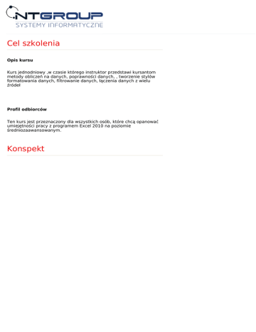 Cel szkolenia Opis kursu Kurs jednodniowy ,w czasie którego instruktor przedstawi kursantom metody obliczeń na danych, poprawności danych, , tworzenie stylów formatowania danych, filtrowanie danych, łączenia danych z wielu źródeł Profil odbiorców Ten kurs jest przeznaczony dla wszystkich osób, które chcą opanować umiejętności pracy z programem Excel 2010 na poziomie średniozaawansowanym. Konspekt Po ukończeniu szkolenia , kursanci opanują wiedze z zakresu: •Nazwane zakresy •Tworzenie formuł obliczających wartości. •Podsumowywanie danych, które spełnia określone warunki. •Znalezienie i poprawienia błędów w obliczeniach. •Definiowanie stylów. •Zmiany wyglądu danych na podstawie jego wartości. •Reguły poprawności danych •Manipulowanie danymi w arkuszu. •Określenia prawidłowych nazw zakresu. •Sortowanie danych arkusza. •Organizowanie danych w poziomie. •Wyszukiwanie informacji w arkuszu. • Szablony skoroszytów. •Łączenie danych z innych arkuszy i skoroszytów. •Konsolidowanie wielu zestawów danych w jednego skoroszytu. •Grupowanie kilku zestawów danych. Program szkolenia Moduł 1: Wykonywanie obliczeń na danych Moduł ten opisuje, jak rozpoznać i nazwać grupy komórek, które zawierają podobne dane, tworzyć formuł w celu wykonywania obliczeń na danych, używać formatowania warunkowego, wyszukiwania błędów w formułach Lekcje •Nazwane zakresy •Tworzenie formuł obliczających wartości •Podsumowywanie danych, które spełnia określone warunki •Znajdowanie i poprawianie błędów w obliczeniach Laboratorium: Nazwane zakresy •Tworzenie nazwanych zakresów Laboratorium: Tworzenie formuł obliczających wartości •Tworzenie i poprawianie formuł; tworzenie formuł, które odwołują się do tabela programu Excel; Używanie odwołań względnych i bezwzględnych Laboratorium: Podsumowywanie danych, które spełnia określone warunki •Tworzenie formuł warunkowych które spełniają określone kryteria; tworzenie formuł które wyliczają średnią lub sumę z danych arkusza Laboratorium: Znajdowanie i poprawianie błędów w obliczeniach •Używanie Inspekcji formuł w programie Excel do identyfikacji i poprawianie błędów w formule Po ukończeniu tego modułu, studenci będą mogli: •Usprawnić metody odwołania się do grup danych w arkuszach. •Tworzyć i poprawiać formuł. Moduł 2: Tworzenie stylów i formatowania danych Moduł ten wyjaśnia, jak określić i zapisać formaty aby ponownie ich użyć, zastosować formatowanie danych, zmienić wygląd danych przy użyciu formatowania warunkowego. Lekcje •Definiowanie stylów •Używanie formatów danych •Zmiana wyglądu danych na podstawie ich wartości Laboratorium: Definiowanie stylów •Tworzenie stylu i zastosowanie nowych stylów danych Laboratorium: Formaty danych •Format data i numeru telefonu, formaty walut Laboratorium: Zmiana wyglądu danych na podstawie ich wartości •Tworzenie formatów warunkowych w celu zmiany wyglądu danych w komórkach arkusza Po ukończeniu tego modułu, studenci będą mogli: •Tworzyć stylów i stosować do danych. •Usprawnić odczytywanie danych. •Zmienić wyświetlanie danych na podstawie ich wartości. Moduł 3: Wyświetlanie określonych danych przy użyciu filtrów Moduł ten wyjaśnia, jak utworzyć filtr do manipulowania wyświetlanych danych oraz tworzenia reguł sprawdzania poprawności danych. Lekcje •Definiowanie zestawów prawidłowe wartości dla zakresów komórek •Manipulowania danymi w arkuszu •Limitowanie danych, który pojawia się na ekranie Twoje Laboratorium: Filtrowanie danych •Tworzenie standardowych filtrów; Tworzenie filtru wyszukiwania Laboratorium: Manipulowania danymi w arkuszu •Usuwanie duplikatów; Tworzenie formuły AGREGACJA; wyszukiwanie wartości niepowtarzalnej Laboratorium: Definiowanie reguł poprawności danych •Tworzenie reguł sprawdzania poprawności danych; dodawanie danych; modyfikacja reguł Po ukończeniu tego modułu, studenci będą mogli: •Filtrować dane, które pojawia się na ekranie. •Manipulowanie danych listy. •Tworzenie reguły sprawdzania poprawności Moduł 4: Sortowanie i sumy częściowe Moduł ten opisuje jak zmienić kolejność danych w arkuszu, obliczać sumy częściowe, organizować dane w grupy i wyszukiwać szczegółowe dane w arkuszu. Lekcje •Sortowanie danych arkusza •Sumy częściowe • Wyszukiwanie szczegółowych danych w arkuszu Laboratorium: Sortowanie danych arkusza •Sortowania arkusza danych; zmienianie kolejności danych, w których stosowane są kryteria sortowania; sortowanie danych za pomocą listy niestandardowej; sortowanie danych według koloru Laboratorium: Organizowanie danych w konspekcie •Dodawanie i modyfikowanie sum częściowych do arkusza; Laboratorium: Wyszukiwanie szczegółowych danych w arkuszu •Tworzenie funkcji Wyszukaj.pionowo Po ukończeniu tego modułu, studenci będą mogli: •Sortować dane za pomocą jednego lub więcej kryteriów. •Obliczać sum częściowych. •Organizować danych w konspekcie. •Wyszukiwać danych w arkuszu kalkulacyjnym. Moduł 5: Łączenie danych z wielu źródeł Moduł ten opisuje jak zapisać skoroszyt jako szablon, łączyć do danych z innymi skoroszytami i arkuszami, konsolidować dane z wielu arkuszy w jednym arkuszu Lekcje •Tworzenie szablonów •Łączenie danych z innych arkuszy i skoroszytów •Konsolidacja wielu zestawów danych do jednego skoroszytu •Grupowanie wielu zestawów danych Laboratorium: Tworzenie szablonów •Tworzenie skoroszytu z szablonu; Stworzenie szablonu z arkusza Laboratorium: Łączenie danych pomiędzy arkuszami i skoroszytami •Tworzenie, usuwanie, modyfikacji łączy danych Laboratorium: Konsolidacja wielu zakresów danych do jednego skoroszytu •Zdefiniować zakresów konsolidacji danych i podsumowanie wyników Laboratorium: Grupowanie wielu zestawów danych •Zapisanie i analiza obsz