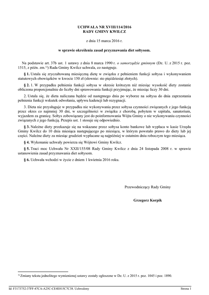 UCHWAŁA NR XVIII/114/2016 RADY GMINY KWILCZ z dnia 15 marca 2016 r. w sprawie określenia zasad przyznawania diet sołtysom. Na podstawie art. 37b ust. 1 ustawy z dnia 8 marca 1990 r. o samorządzie gminnym (Dz. U. z 2015 r. poz. 1515, z późn. zm.1)) Rada Gminy Kwilcz uchwala, co następuje. § 1. Ustala się zryczałtowaną miesięczną dietę w związku z pełnieniem funkcji sołtysa i wykonywaniem statutowych obowiązków w kwocie 150 zł (słownie: sto pięćdziesiąt złotych). § 2. 1. W przypadku pełnienia funkcji sołtysa w okresie krótszym niż miesiąc wysokość diety zostanie obliczona proporcjonalnie do liczby dni sprawowania funkcji przyjmując, że miesiąc liczy 30 dni. 2. Ustala się, że dieta naliczana będzie od następnego dnia po wyborze na sołtysa do dnia zaprzestania pełnienia funkcji wskutek odwołania, upływu kadencji lub rezygnacji. 3. Dieta nie przysługuje w przypadku nie wykonywania przez sołtysa czynności związanych z jego funkcją przez okres co najmniej 30 dni, w szczególności w związku z chorobą, pobytem w szpitalu, sanatorium, wyjazdem za granicę. Sołtys zobowiązany jest do poinformowania Wójta Gminy o nie wykonywaniu czynności związanych z jego funkcją. Przepis ust. 1 stosuje się odpowiednio. § 3. Należne diety przekazuje się na wskazane przez sołtysa konto bankowe lub wypłaca w kasie Urzędu Gminy Kwilcz do 10 dnia miesiąca następującego po miesiącu, w którym powstało prawo do diety lub jej części. Należne diety za miesiąc grudzień wypłacane są najpóźniej w ostatnim dniu roboczym tego miesiąca. § 4. Wykonanie uchwały powierza się Wójtowi Gminy Kwilcz. § 5. Traci moc Uchwała Nr XXII/155/08 Rady Gminy Kwilcz z dnia 24 listopada 2008 r. w sprawie ustanowienia zasad przyznawania diet sołtysom. § 6. Uchwała wchodzi w życie z dniem 1 kwietnia 2016 roku. Przewodniczący Rady Gminy Grzegorz Korpik 1) Zmiany tekstu jednolitego wymienionej ustawy zostały ogłoszone w Dz. U. z 2015 r. poz. 1045 i poz. 1890. Id: F3173752-37FF-47CA-A25C-CE4E815C7C38. Uchwalony Strona 1 Uzasadnienie Na podstawie art. 36 ust. 1 ustawy z dnia 8 marca 1990 r. o samorządzie gminnym (tekst jednolity Dz. U. z 2015 r. poz. 1515 ze zm.), organem wykonawczym w sołectwie jest sołtys. Zgodnie natomiast z art. 37b ust. 1 ustawy o samorządzie gminnym Rada Gminy może ustanowić zasady, na jakich przewodniczącemu organu wykonawczego jednostki pomocniczej będzie przysługiwała dieta oraz zwrot kosztów podróży służbowej. Sołtysi pełnią swoje funkcje społecznie. Z pełnieniem funkcji sołtysa, działającego bezpośrednio w terenie, związane jest ponoszenie kosztów. Zalicza się do nich m.in. udział w sesjach Rady Gminy, posiedzeniach Komisji Rady, spotkaniach z Wójtem, Zebraniach Wiejskich itp. Dieta powinna stanowić formę rekompensaty i zwrot wydatków, jakie sołtys ponosi w związku z wykonywaniem czynności w ramach sprawowanej funkcji, które to czynności szczegółowo wymienione są w statucie sołectwa. Poprzednie regulacje prawne dotyczące diet sołtysów obowiązują od 2008 roku, stąd zasadnym staje się podjęcie przedmiotowej uchwały w zaproponowanym brzmieniu. Skutki finansowe podjęcia niniejszej uchwały rocznie wynoszą: [(150 zł - 125 zł) x 17 sołectw] x 12 miesięcy = 5.100 zł. Wójt Gminy Stanisław Mannek Id: F3173752-37FF-47CA-A25C-CE4E815C7C38. Uchwalony Strona 1