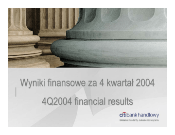 Capitalisation and Shareholders Kapitalizacja i Akcjonariusze BHW, PLN 40 70 65 60 30 55 25 50 45 BHW WIG WIG, tys pkt WIG, M pts 40 J-04 za akcję /per share (31.12.2004) 20 15 10 M-04 M-04 J-04 S-04 Kapitalizacja na 31/12/2004 – 8,4 mld PLN Capitalisation at 31/12/2004 – 8,4 MMM PLN 2 64,1 PLN 35 N-04 Akcjonariat / Shareholding IFA 14% Others 11% COIC 75% Skumulowany zysk netto 450 400 350 300 250 200 150 100 50 0 Cumulative Net Profit mln PLN CAGR 27% Najwyższy wynik finansowy netto od momentu fuzji The highest net income since the merger 2001 2002 2003 2004 Wysoka i stabilna dynamika wzrostu Przeprowadzane restrukturyzacje przynoszą efekty High and stable growth dynamics The implemented restructuring brings effects 3 Źródło: Sprawozdania finansowe Banku, dane w mln PLN Balance Sheet - Assets Bilans - Aktywa 36,1 -6,1% 33.9 7.4 18% 8.8 -13% 9.7 Kasa i należności od Sektora finansowego Należności (sektor niefinansowy i publiczny) Dłużne papiery wartościowe 11.2 10.7 Pozostałe aktywa Debt securities -32% 6.8 30.09.04 Sprzedaż portfela papierów wartościowych Utrzymująca się płynność przedsiębiorstw odsuwa popyt na finansowanie kredytem Wzrost wolumenu instrumentów pochodnych 4 Źródło: Sprawozdania finansowe Banku, dane w mln PLN Source: Bank’s Financial Disclosures, data in MM PLN Cash and due from financial sector Due from non- financial and public sector 19% 7.3 Other assets 8.1 31.12.04 Debt securities portfolio partial sale Sustained corporate liquidity postpones demand for loan financing Increase in derivatives volume Balance Sheet - Liabilities Bilans - Pasywa Zobowiązania wobec Banku Centralnego i sektora finansowego Zobowiązania wobec sektora finansowego i publicznego 36.1 -6,1% 5.2 -25% 33,9 3.9 Due to Financial Sector 18.1 -5% 17.3 Other Liabilities Pozostałe zobowiązania Kapitały własne 6.8 -4% 6.5 6.0 3% 6.2 PLN billion 30.09.04 Mniejsze depozyty klientowskie - mniejszy ekwiwalent złotowy depozytów walutowych; depozyty złotowe wzrosły Zmniejszenie depozyty banków – początki niedopłynności sektora bankowego? 5 Customer Deposits Źródło: Sprawozdania finansowe Banku, dane w mln PLN Source: Bank’s Financial Disclosures, data in MM PLN Equity & Retained Earnings 31.12.04 Decrease in deposits - decrease in Zloty translation of foreign currency deposits; Zloty based deposits increased Lower bank deposits – first signs of banking sector low liquidity? Skumulowany zysk netto 500 400 2004 Wzrost zysku netto: +1,3% 4kw- 3 kw +41% 2004 - 2003 300 mln PLN MM PLN 420,2 296.6 98,3 41% 97 200 145,5 100 0 Cumulative Net Income 79,4 2004 Net Income rise: +1,3% 4Q - 3Q +41% 2004 - 2003 2003 1Q04 2Q04 3Q04 2004 Nacisk na sprzedaż wiązaną produktów Implementacja nowej struktury organizacyjnej bankowości komercyjnej Restrukturyzacja zatrudnienia i sieci oddziałów CitiBusiness – nowe pakiety produktowe CitiFinancial – dynamiczna akwizycja klientów 6 Źródło: Sprawozdania finansowe Banku, dane w mln PLN Source: Bank’s Financial Disclosures, data in MM PLN Pro-active cross-selling of products Introduction of new structure for commercial bank Staff and branch network restructuring CitiBusiness – new product packages CitiFinancial – dynamic client acquisition Rachunek wyników Profit & Loss Account 3kw04 4kw04 Wynik na działalności bankowej 493,6 501,5 Profit on banking activity Pozostała działalność operacyjna (10,0) (4,5) Other operating income Koszty działania banku i amortyzacja (358,0) (369,5) Direct expenses and depreciation 3,7 (12,3) Net cost of credit (37,6) (31,2) Taxes Udziały w zyskach 5,4 14,3 Equity Accounting ZYSK NETTO 97,0 98,3 NET PROFIT mln PLN Różnica wartości rezerw Podatki Zmiany wyniku w 4 kwartale 2004 roku to efekt: Wzrostu przychodów prowizyjnych i operacji finansowych Kosztów zwolnień grupowych oraz rozwoju sieci oddziałów części detalicznej i CitiFinancial Drivers influencing 4Q results: Increased results in fees and financial operations Group lay-offs and retail and CitiFinancial branch expansion costs 7 Źródło: Sprawozdania finansowe Banku, dane w mln PLN Source: Bank’s Financial Disclosures, data in MM PLN MM PLN 500 400 300 Skumulowany Zysk Netto Cumulative Net Profit mln PLN MM PLN 420.2 296.6 41% 200 100 0 2003 2004 Wynik na działalności 493,5 bankowej +1,6% -10% Przychody odsetkowe 251 501,5 228 Interest Income Przychody prowizyjne Wynik z pozycji wymiany Fee Income +11% 150 Pozostałe przychody 62.2 30 3Q '04 Sprzedaż papierów dłużnych SP spowodowała Wzrost przychodów z operacji finansowych Spadek przychodów odsetkowych Wzrost przychodów prowizyjnych głównie dzięki: Dynamice prowizji od produktów detalicznych Większemu udziałowi DM BH w obrotach giełdy Wynik z tytułu wymiany ??? 8 Profit on banking activity Źródło: Sprawozdania finansowe Banku, dane w mln PLN Source: Bank’s Financial Disclosures, data in MM PLN 167 -12% 55.2 +73% 52 FX income Other 4Q '04 Sale of Treasury securities triggered Increase of profits on financial operations Decrease of Interest income Increase of fee income thanks to: Retail products fee growth Higher DM BH share in stock exchange trading FX income ????? Koszty działania General Expenses 333,7 323,5 +3% Koszty odpraw i programu motywacyjnego Severane and equity compensation Koszty działania Direct costs Koszty pod kontrolą mimo zdarzeń jednorazowych Costs under control despite one-off events 3Q04 Koszty odpraw w ramach zwolnień grupowych Rozwój sieci oddziałów Program motywacyjny akcjami Citigorup 9 Źródło: Sprawozdania finansowe Banku, dane w mln PLN Source: Bank’s Financial Disclosures, data in MM PLN 4Q04 Severance payments for group lay-offs Branch network expansion Equity compensation program Rezerwy celowe i portfel kredytowy Loan provisions and portfolio 961 Rozwiązania rezerw 1,048 Release of provisions 671 Różnica wartości rezerw (444) (12) Net provisioning cost (188) Odpisy na rezerwy (1,115) 