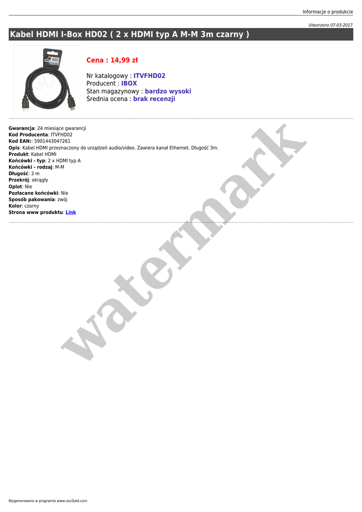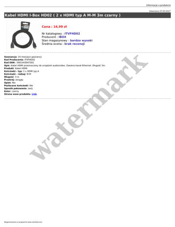 Informacje o produkcie Utworzono 07-03-2017 Kabel HDMI I-Box HD02 ( 2 x HDMI typ A M-M 3m czarny ) Cena : 14,99 zł Nr katalogowy : ITVFHD02 Producent : IBOX Stan magazynowy : bardzo wysoki Średnia ocena : brak recenzji w at er m ar k Gwarancja: 24 miesiące gwarancji Kod Producenta: ITVFHD02 Kod EAN:: 5901443047261 Opis: Kabel HDMI przeznaczony do urządzeń audio/video. Zawiera kanał Ethernet. Długość 3m. Produkt: Kabel HDMI Końcówki - typ: 2 x HDMI typ A Końcówki - rodzaj: M-M Długość: 3 m Przekrój: okrągły Oplot: Nie Pozłacane końcówki: Nie Sposób pakowania: zwój Kolor: czarny Strona www produktu: Link Wygenerowano w programie www.oscGold.com