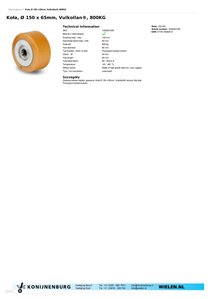Strona głowna / Koła, Ø 150 x 65mm, Vulkollan®, 800KG Koła, Ø 150 x 65mm, Vulkollan®, 800KG Technical Information SKU 100456152E Bieżnia z niebrudzącej Średnica koła / rolki 150 mm Szerokość bieżni koła / rolki 65 mm Nośność 800 kg Hub diameter 66 mm Typ łożyska / otwór w kole Precyzyjne łożyska kulowe Otwór - Ø 20 mm Hub length 65 mm Twardość bieżni 92° Shore A Temperature -40 / +85 °C Wheel centre Made of high grade cast iron, very rugged Tyre / rim connection vulconized Szczegóły Zestawy kołowe ciężkie, spawane: Koła Ø 150 x 65mm, Vulkollan®, korpus: litej stali, Precyzyjne łożyska kulowe Serie: 100.45L Article number: 100456152E EAN: 8718116082514