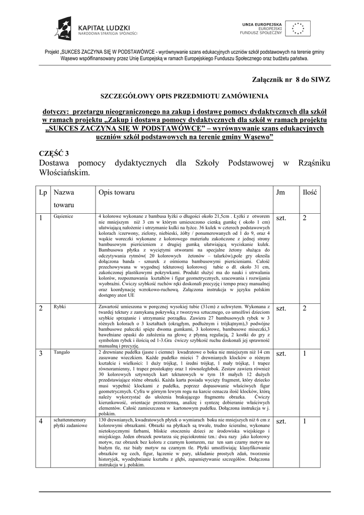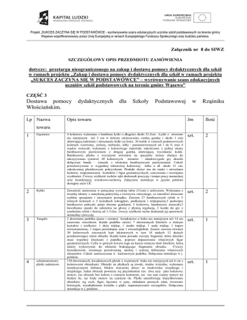 Projekt „SUKCES ZACZYNA SIĘ W PODSTAWÓWCE - wyrównywanie szans edukacyjnych uczniów szkół podstawowych na terenie gminy Wąsewo współfinansowany przez Unię Europejską w ramach Europejskiego Funduszu Społecznego oraz budŜetu państwa. Załącznik nr 8 do SIWZ SZCZEGÓŁOWY OPIS PRZEDMIOTU ZAMÓWIENIA dotyczy: przetargu nieograniczonego na zakup i dostawę pomocy dydaktycznych dla szkół w ramach projektu „Zakup i dostawa pomocy dydaktycznych dla szkół w ramach projektu „SUKCES ZACZYNA SIĘ W PODSTAWÓWCE” – wyrównywanie szans edukacyjnych uczniów szkół podstawowych na terenie gminy Wąsewo” CZĘŚĆ 3 Dostawa pomocy Włościańskim. Lp Nazwa dydaktycznych dla Szkoły Podstawowej w Rząśniku Opis towaru Jm Ilość towaru 1 Gąsienice 4 kolorowe wykonane z bambusa łyŜki o długości około 21,5cm . ŁyŜki z otworem nie mniejszym niŜ 3 cm w którym umieszczono cienką gumkę ( około 1 cm) ułatwiającą nałoŜenie i utrzymanie kulki na łyŜce. 36 kulek w czterech podstawowych kolorach /czerwony, zielony, niebieski, Ŝółty / ponumerowanych od 1 do 9, oraz 4 wąskie woreczki wykonane z kolorowego materiału zakończone z jednej strony bambusowym pierścieniem z drugiej gumką ułatwiającą wyciskanie kulek. Bambusowa płytka z wyciętymi otworami na specjalne Ŝetony słuŜąca do odczytywania rytmów( 20 kolorowych Ŝetonów – talarków),pole gry określa dołączona banda - sznurek z ośmioma bambusowymi pierścieniami. Całość przechowywana w wygodnej tekturowej kolorowej tubie o dł. około 31 cm, zakończonej plastikowymi pokrywkami. Produkt słuŜyć ma do nauki i utrwalania kolorów, rozpoznawania kształtów i figur geometrycznych, szacowania i rozwijania wyobraźni. Ćwiczy szybkość ruchów ręki doskonali precyzję i tempo pracy manualnej oraz koordynację wzrokowo-ruchową. Załączona instrukcja w języku polskim dostępny atest UE szt. 2 2 Rybki szt. 2 3 Tangalo szt. 1 4 schattenmemory płytki zadaniowe Zawartość umieszona w poręcznej wysokiej tubie (31cm) z uchwytem. Wykonana z twardej tektury z zamykaną pokrywką z tworzywa sztucznego, co umoŜliwi dzieciom szybkie sprzątanie i utrzymanie porządku. Zawiera 27 bambusowych rybek w 3 róŜnych kolorach o 3 kształtach (okrągłym, podłuŜnym i trójkątnym),3 podwójne bambusowe pałeczki spięte dwoma gumkami, 3 kolorowe, bambusowe miseczki,3 bawełniane opaski do załoŜenia na głowę z płynną regulacją, 2 kostki do gry z symbolem rybek i ilością od 1-3.Gra ćwiczy szybkość ruchu doskonali jej sprawność manualną i precyzję. 2 drewniane pudełka (jasne i ciemne) kwadratowe o boku nie mniejszym niŜ 14 cm zasuwane wieczkiem. KaŜde pudełko mieści 7 drewnianych klocków o róŜnym kształcie i wielkości: 1 duŜy trójkąt, 1 średni trójkąt, 1 mały trójkąt, 1 trapez równoramienny, 1 trapez prostokątny oraz 1 równoległobok. Zestaw zawiera równieŜ 30 kolorowych sztywnych kart tekturowych w tym 18 małych 12 duŜych przedstawiające róŜne obrazki. KaŜda karta posiada wycięty fragment, który dziecko musi wypełnić klockami z pudełka, poprzez dopasowanie właściwych figur geometrycznych. Cyfra w górnym lewym rogu na karcie oznacza ilość klocków, którą naleŜy wykorzystać do ułoŜenia brakującego fragmentu obrazka. Ćwiczy kierunkowość, orientacje przestrzenną, analizę i syntezę dobieranie właściwych elementów. Całość zamieszczona w kartonowym pudełku. Dołączona instrukcja w j. polskim. 130 drewnianych, kwadratowych płytek o wymiarach boku nie mniejszych niŜ 6 cm z kolorowymi obrazkami. Obrazki na płytkach są trwałe, trudno ścieralne, wykonane nietoksycznymi farbami, bliskie otoczeniu dzieci ze środowiska wiejskiego i miejskiego. Jeden obrazek powtarza się pięciokrotnie tzn.: dwa razy jako kolorowy motyw, raz obrazek bez koloru z czarnym konturem, raz ten sam czarny motyw na białym tle, raz biały motyw na czarnym tle. Płytki umoŜliwiają: klasyfikowanie obrazków wg cech, figur, łączenie w pary, układanie prostych zdań, tworzenie historyjek, wyodrębnianie kształtu z głębi, zapamiętywanie szczegółów. Dołączona instrukcja w j. polskim. szt. 1 Projekt „SUKCES ZACZYNA SIĘ W PODSTAWÓWCE - wyrównywanie szans edukacyjnych uczniów szkół podstawowych na terenie gminy Wąsewo współfinansowany przez Unię Europejską w ramach Europejskiego Funduszu Społecznego oraz budŜetu państwa. 5 schattenmemory plansza zadaniowa DuŜe, Ŝółte, drewniane, pudełko o wymiarach nie mniejszych niŜ wys.9, dł. 40, gł.17 cm z 5 szufladami o dł. nie mniejszej niŜ 17 cm, tak, aby móc pomieścić 26 płytek. W przedniej części szuflady znajduje się poręczna gałka o róŜnej kolorystyce z symbolem uśmiechniętej buźki, wyznaczająca ułoŜenie ciągu rytmicznego oraz róŜnorodnych zadań. Pudełko umoŜliwia utrzymanie porządku. Plansza jest integralną częścią do płytek zadaniowych schatenmemo. 160 obrazków umieszczonych na 20 szablonach. Szablony o długości i szer. Nie mniejszej niŜ 29,5cm i 6 cm , wykonane z masywnego, elastycznego tworzywa sztucznego. Posiadają numerację od 1 do 10 zaznaczoną na specjalnie wystającej wypustce. Cztery szablony mają zawsze ten sam numer. Na kaŜdym szablonie po jednej i drugiej stronie znajdują się po 4 pojedyncze, wyraźne z charakterystycznymi szczegółami obrazki oznaczające róŜne pojęcia m.in. owoce, warzywa, figury, liczby, przedmioty codziennego oraz róŜnorodne pojęcia takie jak: nad, pod, pełny, pusty, stary, młody, w środku, na zewnątrz. Dołączona instrukcja w j. polskim. Drewniane, kwadratowe pudełko o wymiarach nie mniejszych niŜ 29 x 29 x 5 cm z 16 okrągłymi otworami i do nich 16 drewnianymi przykrywkami. Otwory umoŜliwiają umieszczanie płaskich elementów. Plansza pozwala na przeprowadzenie zadań z zakresu płynności wzrokowej, szukania podobieństw i szczegółów oraz zajęć o róŜnej tematyce np.: rozróŜnianie zapac