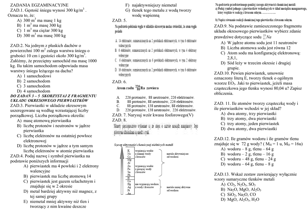 ZADANIA EGZAMINACYJNE ZAD.1. Gęstość śniegu wynosi 300 kg/m3 . Oznacza to, Ŝe: A) 300 m3 ma masę 1 kg B) 1 m3 ma masę 300 kg C) 1 m3 ma cięŜar 300 kg D) 300 m3 ma masę 300 kg ZAD.2. Na jednym z płaskich dachów o powierzchni 100 m2 zalega warstwa śniegu o grubości 10 cm i gęstości około 300 kg/m3. ZałóŜmy, Ŝe przeciętny samochód ma masę 1000 kg. Ilu takim samochodom odpowiada masa warstwy śniegu leŜącego na dachu? A) 1 samochodowi B) 2 samochodom C) 3 samochodom D) 4 samochodom F) najaktywniejszy niemetal G) tlenek tego metalu z wodą tworzy wodę wapienną ZAD. 5. ZAD. 6. DO ZADAŃ 3 – 5 SKORZYSTAJ Z FRAGMENTU UKŁADU OKRESOWEGO PIERWIASTKÓW ZAD.3. Pierwiastki w układzie okresowym uszeregowane są według wzrastającej liczby porządkowej. Liczba porządkowa określa: A) masę atomową pierwiastka B) liczbę protonów i neutronów w jądrze pierwiastka C) liczbę elektronów na ostatniej powłoce elektronowej D) liczbę protonów w jądrze a tym samym liczbę elektronów w atomie pierwiastka ZAD.4. Podaj nazwę i symbol pierwiastka na podstawie poniŜszych informacji A) pierwiastek ma 4 powłoki i 2 elektrony walencyjne B) pierwiastek ma liczbę atomową 14 C) pierwiastek jest gazem szlachetnym i znajduje się w 2 okresie D) metal bardziej aktywny niŜ magnez, z tej samej grupy E) niemetal mniej aktywny niŜ tlen i tworzący z nim kwaśne deszcze ZAD. 7. Narysuj wzór kwasu fosforowego(V) ZAD. 8. ZAD.9. Na podstawie zamieszczonego fragmentu układu okresowego pierwiastków wybierz zdanie 23 prawdziwe dotyczące sodu 11 Na A) W jądrze atomu sodu jest 11 neutronów B) Liczba atomowa sodu jest równa 12 C) Atom sodu ma konfigurację elektronową: 2,8,1, D) Sód leŜy w trzecim okresie i drugiej grupie. ZAD.10. Pewien pierwiastek, umownie oznaczony literą E, tworzy tlenek o ogólnym wzorze EO3. Jaki to pierwiastek, jeŜeli masa cząsteczkowa jego tlenku wynosi 80,04 u? Zapisz obliczenia. ZAD. 11. Ile atomów tworzy cząsteczkę wody i ile pierwiastków wchodzi w jej skład? A) dwa atomy, trzy pierwiastki B) trzy atomy, dwa pierwiastki C) trzy atomy, jeden pierwiastek D) dwa atomy, dwa pierwiastki ZAD.12. Ile gramów wodoru i ile gramów tlenu znajduje się w 72 g wody? ( MH = 1 u, MO = 16u) A) wodoru – 8 g, tlenu – 64 g B) wodoru – 2 g, tlenu – 16 g C) wodoru – 48 g, tlenu – 24 g D) wodoru – 64 g, tlenu – 8 g ZAD.13. WskaŜ zestaw zawierający wyłącznie wzory sumaryczne tlenków metali A) CO2, N2O5, SO3 B) Na2O, MgO, Al2O3 C) SiO2, Na2O, CO D) MgO, Al2O3, H2O ZAD. 14. W pewnym kwasie tlenowym stosunek masy wodoru do masy niemetalu i do masy tlenu jest równy 1 : 6 : 24. Kwasem tym jest A) kwas węglowy B) kwas siarkowy(IV) C) kwas azotowy(V) D) kwas siarkowy(VI) ZAD. 21. śelazo moŜna otrzymać z rud przez redukcję jego tlenku węglem. Który zapis równania reakcji jest prawidłowy? A) Fe2O3 + C → 3 Fe + CO2 B) Fe2O3 + 3 C → 2 Fe + CO2 C) Fe2O3 + 2 C → 2 Fe + 2 CO2 D) 2 Fe2O3 + 3 C → 4 Fe + 3 CO2 ZAD.15. Atom azotu 147 N zawiera A) 14 protonów, 14 neutronów, 14 elektronów B) 7 protonów, 14 neutronów, 7 elektronów C) 14 protonów, 7 neutronów, 14 elektronów D) 7 protonów, 7 neutronów, 7 elektronów ZAD.22. Prawo okresowości brzmi: A) właściwości pierwiastków nie powtarzają się B) właściwości pierwiastków powtarzają się periodycznie, wraz ze wzrastającą liczbą porządkową C) pierwiastki powstają w sposób okresowy D) okres połowicznego rozpadu kaŜdego pierwiastka jest taki sam ZAD. 16. WskaŜ wzór tlenku azotu, w którym azot jest czterowartościowy A) N2O B) N2O3 C) NO2 D) N2O5 ZAD. 17. Szklana płytka umieszczona nisko nad płomieniem świecy pokrywa się czarną substancją. Tą substancją jest A) para wodna B) tlenek węgla(IV) C) tlenek węgla(II) D) sadza (węgiel) ZAD.18. Pierwiastkiem leŜącym w trzecim okresie układu okresowego, którego atom posiada 4 elektrony walencyjne jest A) beryl B) glin C) magnez D) krzem ZAD.19. Jądro atomowe izotopu pewnego pierwiastka ma masę 14 u i zawiera 8 neutronów. Jest to jądro izotopu A) boru B) azotu C) węgla D) tlenu ZAD. 20. Który z zestawów substancji zawiera tylko metale? A) węgiel, siarka, cynk B) brom, Ŝelazo, węgiel C) lit, magnez, Ŝelazo D) Ŝelazo, magnez, fluor ZAD.23. Izotopy to A) atomy tego samego pierwiastka róŜniące się liczbą porządkową B) atomy tego samego pierwiastka róŜniące się liczbą masową C) atomy dwóch róŜnych pierwiastków D) atomy tego samego pierwiastka ZAD. 24. Protonem nazywamy A) cząstkę elementarną o ładunku –1 i masie 1u B) cząstkę elementarną o masie 1u i ładunku 0 C) cząstkę elementarną o ładunku +1 i masie 1u D) cząstkę elementarną o masie 0,1u i ładunku +1 ZAD. 25. Prawo stałości składu mówi A) w danym związku chemicznym stosunek mas pierwiastków jest stały i charakterystyczny dla tego związku B) w danym związku chemicznym stosunek mas pierwiastków zaleŜy od wartościowości pierwiastków C) w danym związku chemicznym stosunek mas atomów pierwiastków jest zmienny D) Ŝadna odpowiedź nie jest poprawna ZAD.25. Liczba masowa A oznacza A) liczbę elektronów w jądrze B) liczbę neutronów w jądrze C) liczbę protonów i neutronów w jądrze D) liczbę protonów w jądrze ZAD. 26. Powietrze to A) pierwiastek chemiczny B) związek chemiczny C) mieszanina jednorodna D) mieszanina niejednorodna ZAD. 27. Reakcja endoenergetyczna to taka, w której A) następuje wydzielanie energii na róŜne sposoby B) następuje pobranie energii na róŜne sposoby C) następuje wydzielanie lub pobranie energii na róŜne sposoby D) wszystkie odpowiedzi są poprawne ZAD. 28. Która substancja nie jest związkiem chemicznym? A) tlenek węgla(II) B) woda C) brąz D) cukier ZAD. 29. Produktem syntezy wody jest A) tlen B) wodór C) tlen i wodór D) woda ZAD. 30. WskaŜ właściwości fizyczne tlenu A) podtrzymuje palenie i jest gazem B) bezwonny i przezroczysty C) gaz o gęstości większ