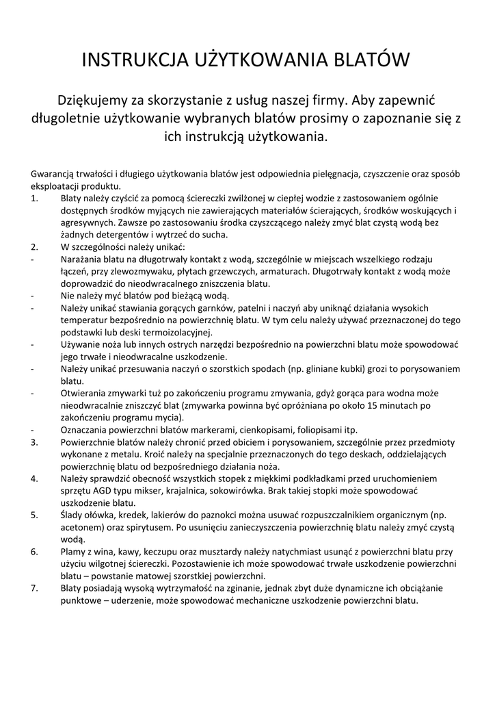 INSTRUKCJA UŻYTKOWANIA BLATÓW Dziękujemy za skorzystanie z usług naszej firmy. Aby zapewnić długoletnie użytkowanie wybranych blatów prosimy o zapoznanie się z ich instrukcją użytkowania. Gwarancją trwałości i długiego użytkowania blatów jest odpowiednia pielęgnacja, czyszczenie oraz sposób eksploatacji produktu. 1. Blaty należy czyścić za pomocą ściereczki zwilżonej w ciepłej wodzie z zastosowaniem ogólnie dostępnych środków myjących nie zawierających materiałów ścierających, środków woskujących i agresywnych. Zawsze po zastosowaniu środka czyszczącego należy zmyć blat czystą wodą bez żadnych detergentów i wytrzeć do sucha. 2. W szczególności należy unikać: Narażania blatu na długotrwały kontakt z wodą, szczególnie w miejscach wszelkiego rodzaju łączeń, przy zlewozmywaku, płytach grzewczych, armaturach. Długotrwały kontakt z wodą może doprowadzić do nieodwracalnego zniszczenia blatu. Nie należy myć blatów pod bieżącą wodą. Należy unikać stawiania gorących garnków, patelni i naczyń aby uniknąć działania wysokich temperatur bezpośrednio na powierzchnię blatu. W tym celu należy używać przeznaczonej do tego podstawki lub deski termoizolacyjnej. Używanie noża lub innych ostrych narzędzi bezpośrednio na powierzchni blatu może spowodować jego trwałe i nieodwracalne uszkodzenie. Należy unikać przesuwania naczyń o szorstkich spodach (np. gliniane kubki) grozi to porysowaniem blatu. Otwierania zmywarki tuż po zakończeniu programu zmywania, gdyż gorąca para wodna może nieodwracalnie zniszczyć blat (zmywarka powinna być opróżniana po około 15 minutach po zakończeniu programu mycia). Oznaczania powierzchni blatów markerami, cienkopisami, foliopisami itp. 3. Powierzchnie blatów należy chronić przed obiciem i porysowaniem, szczególnie przez przedmioty wykonane z metalu. Kroić należy na specjalnie przeznaczonych do tego deskach, oddzielających powierzchnię blatu od bezpośredniego działania noża. 4. Należy sprawdzić obecność wszystkich stopek z miękkimi podkładkami przed uruchomieniem sprzętu AGD typu mikser, krajalnica, sokowirówka. Brak takiej stopki może spowodować uszkodzenie blatu. 5. Ślady ołówka, kredek, lakierów do paznokci można usuwać rozpuszczalnikiem organicznym (np. acetonem) oraz spirytusem. Po usunięciu zanieczyszczenia powierzchnię blatu należy zmyć czystą wodą. 6. Plamy z wina, kawy, keczupu oraz musztardy należy natychmiast usunąć z powierzchni blatu przy użyciu wilgotnej ściereczki. Pozostawienie ich może spowodować trwałe uszkodzenie powierzchni blatu – powstanie matowej szorstkiej powierzchni. 7. Blaty posiadają wysoką wytrzymałość na zginanie, jednak zbyt duże dynamiczne ich obciążanie punktowe – uderzenie, może spowodować mechaniczne uszkodzenie powierzchni blatu.