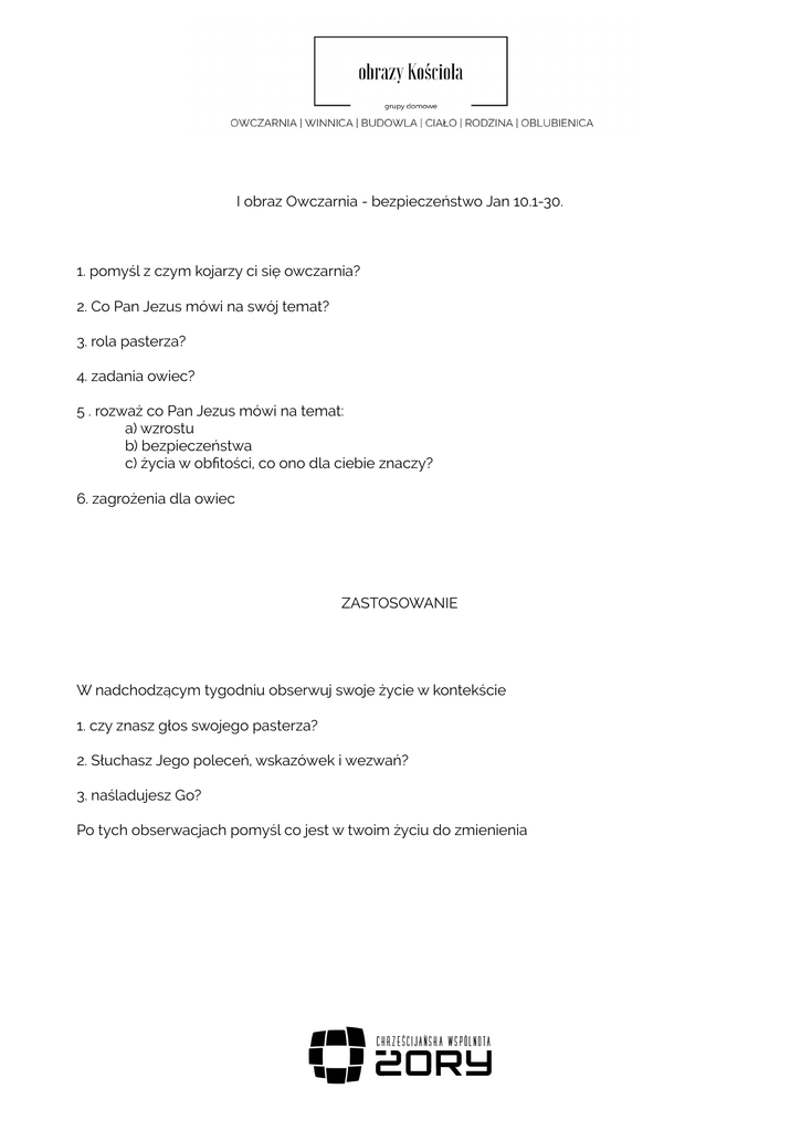 I obraz Owczarnia - bezpieczeństwo Jan 10.1-30. 1. pomyśl z czym kojarzy ci się owczarnia? 2. Co Pan Jezus mówi na swój temat? 3. rola pasterza? 4. zadania owiec? 5 . rozważ co Pan Jezus mówi na temat: a) wzrostu b) bezpieczeństwa c) życia w obfitości, co ono dla ciebie znaczy? 6. zagrożenia dla owiec ZASTOSOWANIE W nadchodzącym tygodniu obserwuj swoje życie w kontekście 1. czy znasz głos swojego pasterza? 2. Słuchasz Jego poleceń, wskazówek i wezwań? 3. naśladujesz Go? Po tych obserwacjach pomyśl co jest w twoim życiu do zmienienia