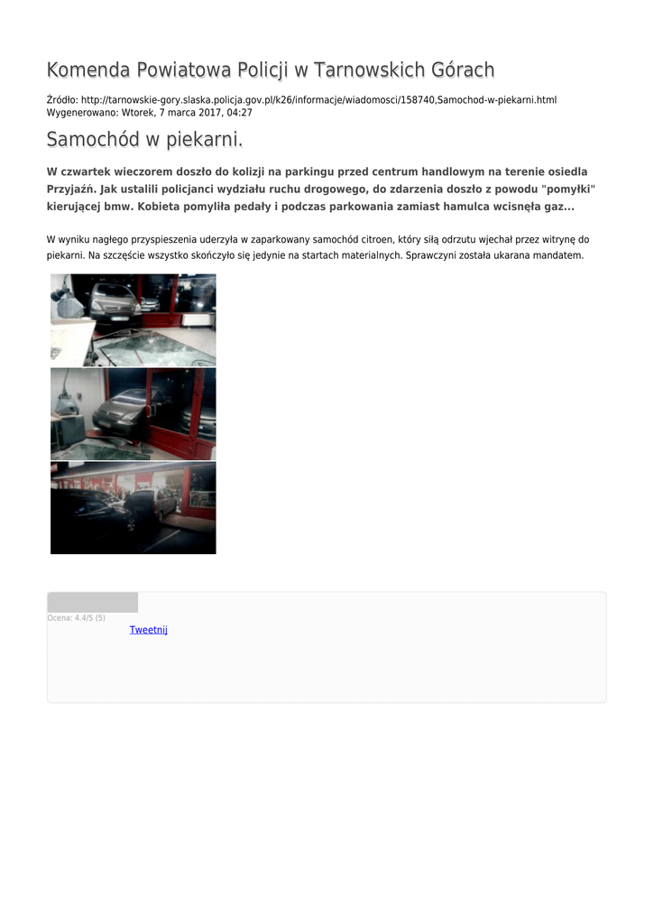 Komenda Powiatowa Policji w Tarnowskich Górach Źródło: http://tarnowskie-gory.slaska.policja.gov.pl/k26/informacje/wiadomosci/158740,Samochod-w-piekarni.html Wygenerowano: Wtorek, 7 marca 2017, 04:27 Samochód w piekarni. W czwartek wieczorem doszło do kolizji na parkingu przed centrum handlowym na terenie osiedla Przyjaźń. Jak ustalili policjanci wydziału ruchu drogowego, do zdarzenia doszło z powodu "pomyłki" kierującej bmw. Kobieta pomyliła pedały i podczas parkowania zamiast hamulca wcisnęła gaz... W wyniku nagłego przyspieszenia uderzyła w zaparkowany samochód citroen, który siłą odrzutu wjechał przez witrynę do piekarni. Na szczęście wszystko skończyło się jedynie na startach materialnych. Sprawczyni została ukarana mandatem. Ocena: 4.4/5 (5) Tweetnij