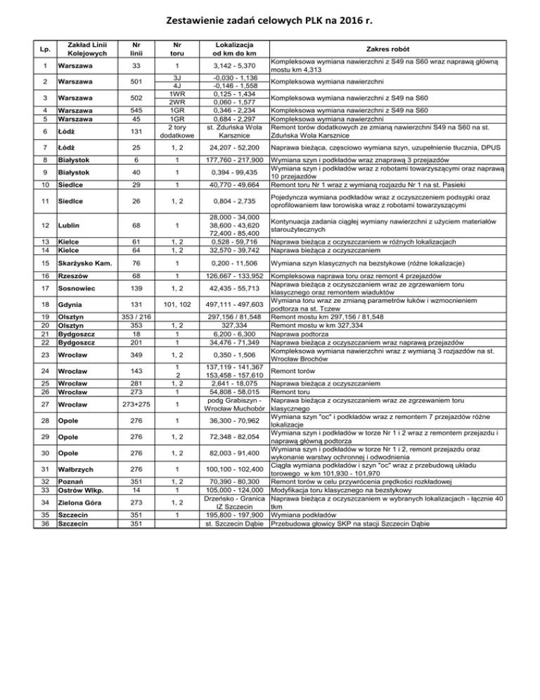 Zestawienie zadań celowych PLK na 2016 r. Lp. Zakład Linii Kolejowych Nr linii Nr toru Lokalizacja od km do km 1 3,142 - 5,370 3J 4J 1WR 2WR 1GR 1GR 2 tory dodatkowe .-0,030 - 1,136 .-0,146 - 1,558 0,125 - 1,434 0,060 - 1,577 0,346 - 2,234 0,684 - 2,297 st. Zduńska Wola Karsznice Zakres robót Kompleksowa wymiana nawierzchni z S49 na S60 wraz naprawą główną mostu km 4,313 1 Warszawa 33 2 Warszawa 501 3 Warszawa 502 4 5 Warszawa Warszawa 545 45 6 Łódź 131 7 Łódź 25 1, 2 24,207 - 52,200 Naprawa bieżąca, częsciowo wymiana szyn, uzupełnienie tłucznia, DPUS 8 Białystok 6 1 177,760 - 217,900 9 Białystok 40 1 0,394 - 99,435 10 Siedlce 29 1 40,770 - 49,664 Wymiana szyn i podkładów wraz znaprawą 3 przejazdów Wymiana szyn i podkładów wraz z robotami towarzyszącymi oraz naprawą 10 przejazdów Remont toru Nr 1 wraz z wymianą rozjazdu Nr 1 na st. Pasieki 11 Siedlce 26 1, 2 0,804 - 2,735 12 Lublin 68 1 13 14 Kielce Kielce 61 64 15 Skarżysko Kam. 16 Kompleksowa wymiana nawierzchni Kompleksowa wymiana nawierzchni z S49 na S60 Kompleksowa wymiana nawierzchni z S49 na S60 Kompleksowa wymiana nawierzchni Remont torów dodatkowych ze zmianą nawierzchni S49 na S60 na st. Zduńska Wola Karsznice Pojedyncza wymiana podkładów wraz z oczyszczeniem podsypki oraz oprofilowaniem ław torowiska wraz z robotami towarzyszącymi Kontynuacja zadania ciągłej wymiany nawierzchni z użyciem materiałów staroużytecznych 1, 2 1, 2 28,000 - 34,000 38,600 - 43,620 72,400 - 85,400 0,528 - 59,716 32,570 - 39,742 76 1 0,200 - 11,506 Wymiana szyn klasycznych na bezstykowe (różne lokalizacje) Rzeszów 68 1 126,667 - 133,952 17 Sosnowiec 139 1, 2 42,435 - 55,713 18 Gdynia 131 101, 102 497,111 - 497,603 19 20 21 22 Olsztyn Olsztyn Bydgoszcz Bydgoszcz 353 / 216 353 18 201 1, 2 1 1 297,156 / 81,548 327,334 6,200 - 6,300 34,476 - 71,349 23 Wrocław 349 1, 2 0,350 - 1,506 24 Wrocław 143 25 26 Wrocław Wrocław 281 273 1 2 1, 2 1 27 Wrocław 273+275 1 137,119 - 141,367 153,458 - 157,610 2,641 - 18,075 54,808 - 58,015 podg Grabiszyn Wrocław Muchobór 28 Opole 276 1 29 Opole 276 1, 2 30 Opole 276 1, 2 31 Wałbrzych 276 1 32 33 Poznań Ostrów Wlkp. 351 14 1, 2 1 34 Zielona Góra 273 1, 2 35 36 Szczecin Szczecin 351 351 1 Naprawa bieżąca z oczyszczaniem w różnych lokalizacjach Naprawa bieżąca z oczyszczaniem Kompleksowa naprawa toru oraz remont 4 przejazdów Naprawa bieżąca z oczyszczaniem wraz ze zgrzewaniem toru klasycznego oraz remontem wiaduktów Wymiana toru wraz ze zmianą parametrów łuków i wzmocnieniem podtorza na st. Tczew Remont mostu km 297,156 / 81,548 Remont mostu w km 327,334 Naprawa podtorza Naprawa bieżąca z oczyszczaniem wraz naprawą przejazdów Kompleksowa wymiana nawierzchni wraz z wymianą 3 rozjazdów na st. Wrocław Brochów Remont torów Naprawa bieżąca z oczyszczaniem Remont toru Naprawa bieżąca z oczyszczaniem wraz ze zgrzewaniem toru klasycznego Wymiana szyn "oc" i podkładów wraz z remontem 7 przejazdów różne 36,300 - 70,962 lokalizacje Wymiana szyn i podkładów w torze Nr 1 i 2 wraz z remontem przejazdu i 72,348 - 82,054 naprawą główną podtorza Wymiana szyn i podkładów w torze Nr 1 i 2, remont przejazdu oraz 82,003 - 91,400 wykonanie warstwy ochronnej i odwodnienia Ciągła wymiana podkładów i szyn "oc" wraz z przebudową układu 100,100 - 102,400 torowego w km 101,930 - 101,970 70,390 - 80,300 Remont torów w celu przywrócenia prędkości rozkładowej 105,000 - 124,000 Modyfikacja toru klasycznego na bezstykowy Drzeńsko - Granica Naprawa bieżąca z oczyszczaniem w wybranych lokalizacjach - łącznie 40 IZ Szczecin tkm 195,800 - 197,900 Wymiana podkładów st. Szczecin Dąbie Przebudowa głowicy SKP na stacji Szczecin Dąbie