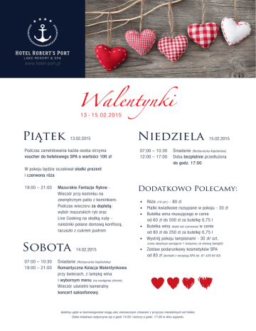 www.hotel-port.pl 13 - 15.02.2015 Piątek 13.02.2015 Podczas zameldowania każda osoba otrzyma voucher do hotelowego SPA o wartości 100 zł Niedziela 07:00 – 10:30 12:00 – 17:00 15.02.2015 Śniadanie (Restauracka Kapitańska) Doba bezpłatnie przedłużona do godz. 17:00 W pokoju będzie oczekiwał słodki prezent i czerwona róża 19:00 – 21:00 Mazurskie Fantazje Rybne Wieczór przy kominku na zewnętrznym patio z kominkiem. Podczas wieczoru za dopłatą: wybór mazurskich ryb oraz Live Cooking na słodką nutę naleśniki polane domową konfiturą, racuszki z cukrem pudrem Dodatkowo Polecamy: • • • • • Sobota 07:00 – 10:30 19:00 – 21:00 Róże (10 szt.) - 80 zł Płatki kwiatkowe rozsypane w pokoju - 30 zł Butelka wina musującego w cenie od 60 zł do 500 zł za butelkę 0,75 l Butelka wina (białe lub czerwone) w cenie od 80 zł do 250 zł za butelkę 0,75 l Wystrój pokoju lampionami - 30 zł/ szt. (cena obejmuje wynajęcie 1 lampionu ze świecą teelight) 14.02.2015 • Zestaw podarunkowy kosmetyków SPA od 80 zł (kontakt z recepcją SPA tel. 87 429 84 82) Śniadanie (Restauracka Kapitańska) Romantyczna Kolacja Walentynkowa przy świecach, z lampką wina i wybornym menu (na następnej stronie). Wieczór uświetni kameralny koncert saksofonowy. Godziny ujęte w harmonogramie mogą ulec nieznacznym zmianom z przyczyn niezależnych od hotelu. Doba hotelowa rozpoczyna się o godz 14:00 i kończy o godz. 17:00 w dniu wyjazdu. www.hotel-port.pl 14.02.2015 godz. 19:00 - 21:00 Restauracja Kapitańska Gravlax z łososia skropiony koniakiem i cytrusami podany na sałacie z rukoli, oliwek, kaparów i suszonych pomidorów Krem z cukinii w dwóch odsłonach z lekką nutą papryczki peperoni, oliwy czosnkowej i chrupkimi grzankami Polędwiczki wieprzowe owinięte chrupiącym bekonem podane na musie z kuropatwy z pieczonymi ziemniakami i zielonymi szparagami Malinowy sorbet skropiony miodem pitnym z nutą mięty podany na marynowanych wiśniach Kawa/ Herbata Woda mineralna z miętą i cytryną Ochagavia Medialuna Cabernet Merlot (150 ml) lub Ochagavia Medialuna Sauvignon Semillon (150 ml)