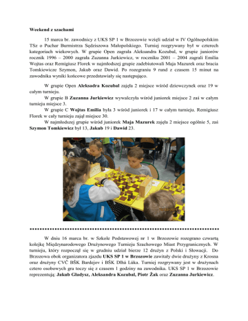Weekend z szachami 15 marca br. zawodnicy z UKS SP 1 w Brzozowie wzięli udział w IV Ogólnopolskim TSz o Puchar Burmistrza Sędziszowa Małopolskiego. Turniej rozgrywany był w czterech kategoriach wiekowych. W grupie Open zagrała Aleksandra Kozubal, w grupie juniorów rocznik 1996 – 2000 zagrała Zuzanna Jurkiewicz, w roczniku 2001 – 2004 zagrali Emilia Wojtas oraz Remigiusz Florek w najmłodszej grupie zadebiutowali Maja Mazurek oraz bracia Tomkiewicze Szymon, Jakub oraz Dawid. Po rozegraniu 9 rund z czasem 15 minut na zawodnika wyniki końcowe przedstawiały się następująco. W grupie Open Aleksadra Kozubal zajęła 2 miejsce wśród dziewczynek oraz 19 w całym turnieju. W grupie B Zuzanna Jurkiewicz wywalczyła wśród juniorek miejsce 2 zaś w całym turnieju miejsce 3. W grupie C Wojtas Emilia była 3 wśród juniorek i 17 w całym turnieju. Remigiusz Florek w cały turnieju zajął miejsce 30. W najmłodszej grupie wśród juniorek Maja Mazurek zajęła 2 miejsce ogólnie 5, zaś Szymon Tomkiewicz był 13, Jakub 19 i Dawid 23. W dniu 16 marca br. w Szkole Podstawowej nr 1 w Brzozowie rozegrano czwartą kolejkę Międzynarodowego Drużynowego Turnieju Szachowego Miast Przygranicznych. W turnieju, który rozpoczął się w grudniu udział bierze 12 drużyn z Polski i Słowacji. Do Brzozowa obok organizatora zjazdu UKS SP 1 w Brzozowie zawitały dwie drużyny z Krosna oraz drużyny CVČ BŠK Bardejov i BŠK Dlhá Lúka. Turniej rozgrywany jest w drużynach cztero osobowych gra toczy się z czasem 1 godziny na zawodnika. UKS SP 1 w Brzozowie reprezentują: Jakub Gładysz, Aleksandra Kozubal, Piotr Żak oraz Zuzanna Jurkiewicz. O to wyniki poszczególnych pojedynków: KKSz Urania MOSiR I Krosno - CVČ BŠK Bardejov – 3:1 KKSz Urania MOSiR II Krosno - BŠK Dlhá Lúka – 1:3 CVČ BŠK Bardejov - KKSz Urania MOSiR II Krosno – 3:1 BŠK Dlhá Lúka – UKS SP 1 Brzozów – 3,5:0,5 UKS SP 1 Brzozów - CVČ BŠK Bardejov – 1,5:2,5 KKSz Urania MOSiR I Krosno - BŠK Dlhá Lúka – 2,5:1,5 Wojciech Kozubal Fot. A. Mazurek www.ry-sa.pl
