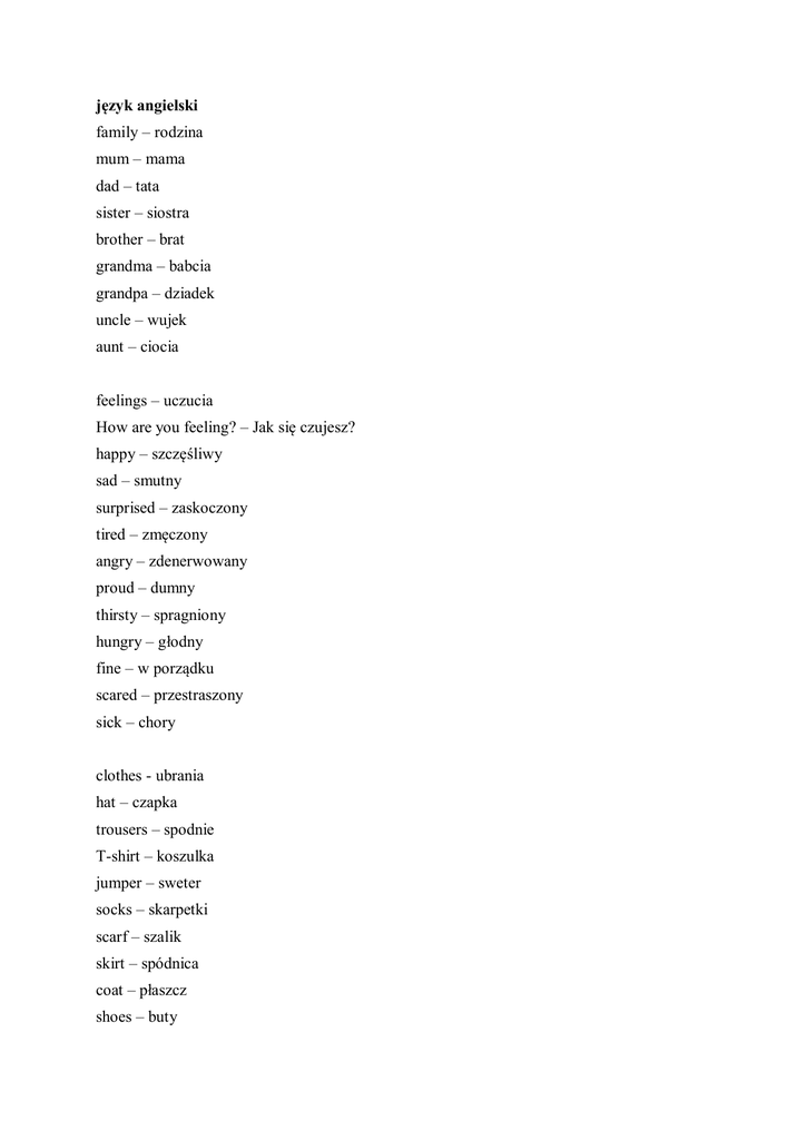 język angielski family – rodzina mum – mama dad – tata sister – siostra brother – brat grandma – babcia grandpa – dziadek uncle – wujek aunt – ciocia feelings – uczucia How are you feeling? – Jak się czujesz? happy – szczęśliwy sad – smutny surprised – zaskoczony tired – zmęczony angry – zdenerwowany proud – dumny thirsty – spragniony hungry – głodny fine – w porządku scared – przestraszony sick – chory clothes - ubrania hat – czapka trousers – spodnie T-shirt – koszulka jumper – sweter socks – skarpetki scarf – szalik skirt – spódnica coat – płaszcz shoes – buty washing hands – mycie rąk eating fruit – jedzenie owoców drinking milk – picie mleka brushing teeth – mycie zębów