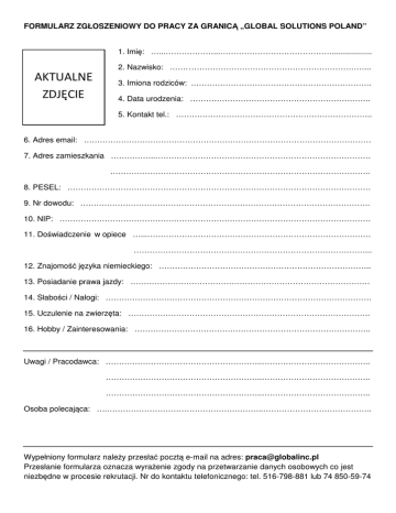 FORMULARZ ZGŁOSZENIOWY DO PRACY ZA GRANICĄ „GLOBAL SOLUTIONS POLAND” 1. Imię: …...………………...…………………………………….................. 2. Nazwisko: ……. …………………………………………………………... AKTUALNE ZDJĘCIE 3. Imiona rodziców: .…………………………………………………………. 4. Data urodzenia: ………………………………………………………….. 5. Kontakt tel.: ……………………………………………………………….. 6. Adres email: ……………………………………………………………………………………………… 7. Adres zamieszkania ……………..……………………………………………………………………… …………………………………………………………………………………….. 8. PESEL: …………………………………………………………………………………………………… 9. Nr dowodu: ………………………………………………………………………………………………. 10. NIP: ……………………………………………………………………………………………………… 11. Doświadczenie w opiece …...………………………………………………………………………… ……………………………………………………………………………... 12. Znajomość języka niemieckiego: …………………………………………………………………….. 13. Posiadanie prawa jazdy: ……………………………………………………………………………… 14. Słabości / Nałogi: ………………………………………………………………………………………. 15. Uczulenie na zwierzęta: ………………………………………………………………………………. 16. Hobby / Zainteresowania: …………………………………………………………………………….. Uwagi / Pracodawca: …………………………………………………..………………………………….. …………………………………………………..………………………………….. …………………………………………………..………………………………….. Osoba polecająca: ….…………………………………………………..………………………………….. Wypełniony formularz należy przesłać pocztą e-mail na adres: [email protected] Przesłanie formularza oznacza wyrażenie zgody na przetwarzanie danych osobowych co jest niezbędne w procesie rekrutacji. Nr do kontaktu telefonicznego: tel. 516-798-881 lub 74 850-59-74