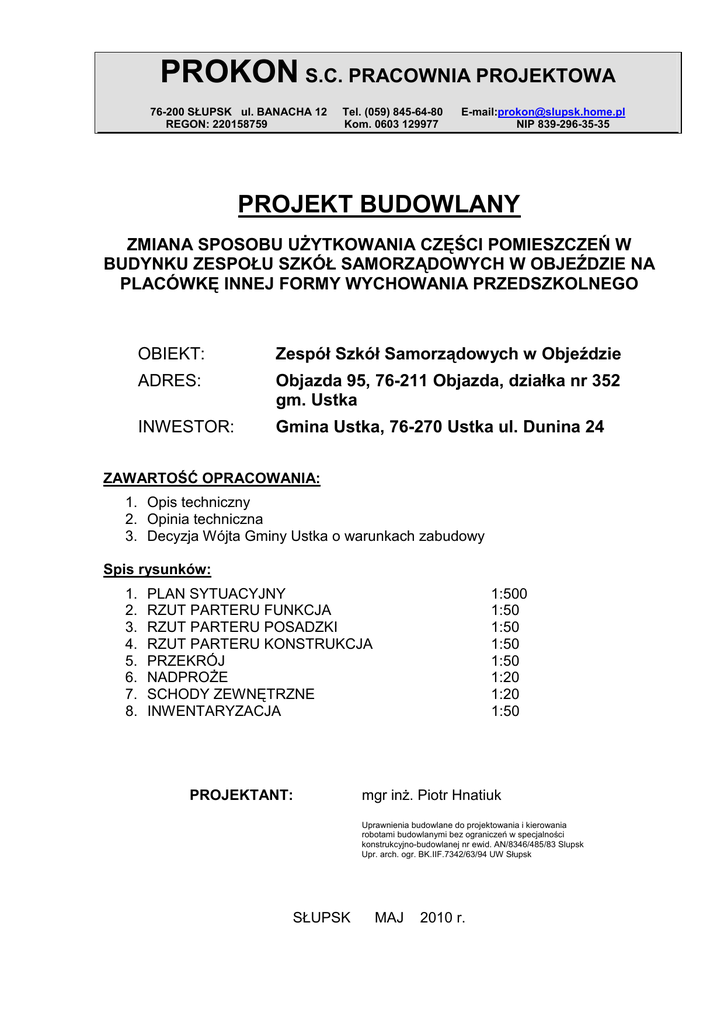 PROKON S.C. PRACOWNIA PROJEKTOWA 76-200 SŁUPSK ul. BANACHA 12 REGON: 220158759 Tel. (059) 845-64-80 Kom. 0603 129977 E-mail:[email protected] NIP 839-296-35-35 PROJEKT BUDOWLANY ZMIANA SPOSOBU UŻYTKOWANIA CZĘŚCI POMIESZCZEŃ W BUDYNKU ZESPOŁU SZKÓŁ SAMORZĄDOWYCH W OBJEŹDZIE NA PLACÓWKĘ INNEJ FORMY WYCHOWANIA PRZEDSZKOLNEGO OBIEKT: Zespół Szkół Samorządowych w Objeździe ADRES: Objazda 95, 76-211 Objazda, działka nr 352 gm. Ustka INWESTOR: Gmina Ustka, 76-270 Ustka ul. Dunina 24 ZAWARTOŚĆ OPRACOWANIA: 1. Opis techniczny 2. Opinia techniczna 3. Decyzja Wójta Gminy Ustka o warunkach zabudowy Spis rysunków: 1. 2. 3. 4. 5. 6. 7. 8. PLAN SYTUACYJNY RZUT PARTERU FUNKCJA RZUT PARTERU POSADZKI RZUT PARTERU KONSTRUKCJA PRZEKRÓJ NADPROŻE SCHODY ZEWNĘTRZNE INWENTARYZACJA PROJEKTANT: 1:500 1:50 1:50 1:50 1:50 1:20 1:20 1:50 mgr inż. Piotr Hnatiuk Uprawnienia budowlane do projektowania i kierowania robotami budowlanymi bez ograniczeń w specjalności konstrukcyjno-budowlanej nr ewid. AN/8346/485/83 Slupsk Upr. arch. ogr. BK.IIF.7342/63/94 UW Słupsk SŁUPSK MAJ 2010 r. OPIS TECHNICZNY 1.0 DANE OGÓLNE Nazwa inwestycji: Adaptacja istniejących pomieszczeń na placówkę innej formy wychowania przedszkolnego Adres: Objazda 95, 76-211 Objazda, działka nr 352 gm. Ustka Gmina Ustka, 76-270 Ustka ul. Dunina 24 Inwestor: 1.1 PODSTAWA OPRACOWANIA 1. 2. 3. 4. 5. 6. 7. 8. 9. Zlecenie oraz program uzgodniony z inwestorem. Inwentaryzacja budowlana Mapa sytuacyjno-wysokościowa w skali 1:500 Decyzja Wójta Gminy Ustka o warunkach zabudowy Nr G.BD. 7331-46/10 z dnia 07 czerwca 2010r. Rozporządzenie Ministra Infrastruktury z dnia 12 kwietnia 2002 r. w sprawie warunków technicznych, jakim powinny odpowiadać budynki i ich usytuowanie ( Dz.U. Nr 75, poz. 690, z 2002 r. z późniejszymi zmianami ); Rozporządzenie Ministra Edukacji Narodowej z dnia 10.01.2008r w sprawie rodzajów innych form wychowania przedszkolnego, warunków tworzenia i organizowania tych form oraz sposobu ich działania Dz. U. 7, poz. 38 z 2008r. z późniejszymi zmianami); Rozporządzenie ministra spraw wewnętrznych i administracji z dnia 16 czerwca 2003 r. w sprawie ochrony przeciwpożarowej budynków, innych obiektów budowlanych i terenów; Rozporządzenie ministra spraw wewnętrznych i administracji z dnia 16 czerwca 2003 r. w sprawie uzgadniania projektu budowlanego pod względem ochrony przeciwpożarowej; Orzeczenia techniczne dotyczące możliwości przebudowy pomieszczeń z roku 2010; 1.2 PRZEDMIOT OPRACOWANIA Niniejsza dokumentacja stanowi projekt budowlany branży budowlanotechnologicznej adaptacji istniejących pomieszczeń na zespół wychowania przedszkolnego lub punkt przedszkolny w budynku Zespołu Szkół Samorządowych w Objeździe. 2.0 PROBLEMATYKA PLANU SYTUACYJNEGO 2.1 STAN ISTNIEJĄCY Przedmiotowe pomieszczenia znajdują się w parterze jednokondygnacyjnego (w tej części), podpiwniczonego budynku szkolnego w Objeździe 95. 2 Zespół budynków szkolnych został wybudowany w latach 90-tych. Adaptowane pomieszczenia zlokalizowane są w bezpośrednim sąsiedztwie pomieszczeń stołówki szkolnej, posiadają niezależne wejście zewnętrzne. Wcześniej pomieszczenia wykorzystywane były na lokal mieszkalny dla nauczyciela. Stan techniczny budynku dobry. Ściany bez zarysowań w dobrym stanie technicznym. Stropy w dobrym stanie technicznym bez zarysowań. Stolarka okienna i drzwiowa do wymiany. Budynek posiada instalację wod.-kan., elektryczną, kotłownię dla całego budynku, instalację c.o. oraz instalację ciepłej i zimnej wody. Wysokość netto pomieszczeń wynosi 3,12 do 3,14 m 2.2 STAN PROJEKTOWANY Projektuje się adaptację pomieszczeń na placówkę innej formy wychowania przedszkolnego (zespół wychowania przedszkolnego lub punkt przedszkolny). Dla potrzeb projektowanej funkcji przewiduje się włączenie do lokalu dwóch pomieszczeń zbędnych dla stołówki i wydzielenie: śluzy oddzielającej stołówkę od zespołu pomieszczeń placówki przedszkolnej, salę przedszkolną, zespół sanitarny, magazyn leżaków, pomieszczenie porządkowe, szatnię, wiatrołap, komunikację. Przebudowa istniejących pomieszczeń obejmować będzie: • • • • • • • rozbiórkę części istniejących ścianek działowych, wykonanie trzech otworów w ścianach celem połączenia istniejących pomieszczeń, wykonanie nowych ścianek działowych, wykonanie instalacji wewnętrznych (wodociągowej, kanalizacyjnej, instalacji grzejnikowej, elektrycznej), wykonanie warstw wykończeniowych posadzek, wykonanie tynków, malowanie ścian i sufitów, wykonanie zmywalnych, nienasiąkliwych okładzin ścian w pomieszczeniach sanitarnych Projektowane pomieszczenia zostaną wyposażone w urządzenia sanitarne i technologiczne. W pomieszczeniach znajduje się woda zimna i ciepła z instalacji wewnętrznej w budynku, ścieki odprowadzane będą do istniejącej w budynku kanalizacji sanitarnej. Lokal zaopatrzony jest w energię elektryczną, wszystkie urządzenia i odbiorniki energii będą podłączone pod jeden układ pomiarowy. Licznik energii usytuowany jest na tablicy rozdzielczej znajdującej się wiatrołapie budynku. Ogrzewanie z istniejącej instalacji c.o. w budynku zaopatrywanej w ciepło z kotłowni na opał stały. We wszystkich pomieszczeniach zaprojektowano wentylację grawitacyjną kanałową lub mechaniczną. 3 3.0 PROGRAM FUNKCJONALNO – UŻYTKOWY 3.1 OPIS OGÓLNY Projektuje się adaptację pomieszczeń na placówkę wychowania przedszkolnego (zespół wychowania przedszkolnego lub punkt przedszkolny). Celem ich istnienia jest zapewnienie dziecku wiedzy i umiejętności potrzebnych do rozpoczęcia nauki w szkole a tym samym wyrównanie szans edukacyjnych. W sali przedszkolnej po uwzględnieniu norm powierzchniowych może przebywać do 5 godzin dziennie 24 dzieci, jeżeli pobyt dziecka przekracza 5 godzin lub jest zapewniane leżakowanie - 20 dzieci. Zaprojektowano dwa wejścia zewnętrzne w t