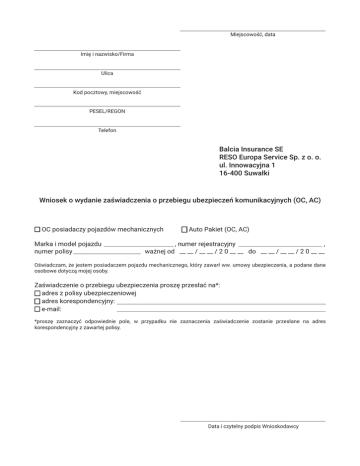 Miejscowość, data Imię i nazwisko/Firma Ulica Kod pocztowy, miejscowość PESEL/REGON Telefon Balcia Insurance SE RESO Europa Service Sp. z o. o. ul. Innowacyjna 1 16-400 Suwałki Wniosek o wydanie zaświadczenia o przebiegu ubezpieczeń komunikacyjnych (OC, AC) � OC posiadaczy pojazdów mechanicznych Marka i model pojazdu numer polisy � Auto Pakiet (OC, AC) , numer rejestracyjny , ważnej od __ __ / __ __ / 2 0 __ __ do __ __ / __ __ / 2 0 __ __ Oświadczam, że jestem posiadaczem pojazdu mechanicznego, który zawarł ww. umowy ubezpieczenia, a podane dane osobowe dotyczą mojej osoby. Zaświadczenie o przebiegu ubezpieczenia proszę przesłać na*: � adres z polisy ubezpieczeniowej � adres korespondencyjny: � e-mail: *proszę zaznaczyć odpowiednie pole, w przypadku nie zaznaczenia zaświadczenie zostanie przesłane na adres korespondencyjny z zawartej polisy. Data i czytelny podpis Wnioskodawcy