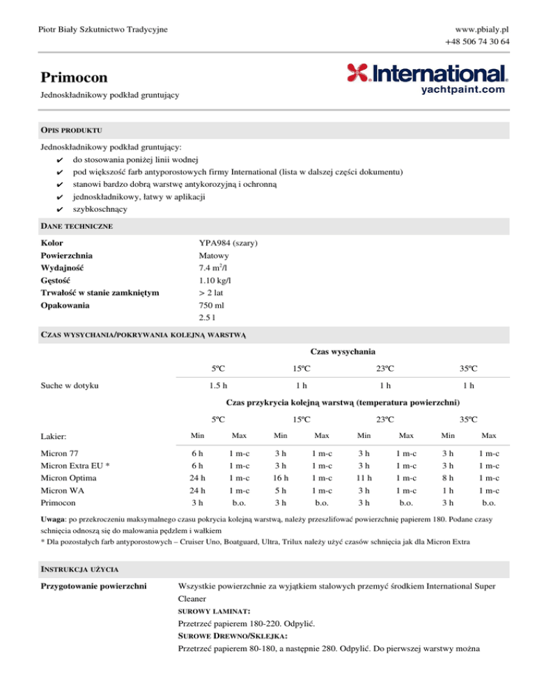 Piotr Biały Szkutnictwo Tradycyjne www.pbialy.pl +48 506 74 30 64 Primocon Jednoskładnikowy podkład gruntujący OPIS PRODUKTU Jednoskładnikowy podkład gruntujący: ✔ do stosowania poniżej linii wodnej ✔ pod większość farb antyporostowych firmy International (lista w dalszej części dokumentu) ✔ stanowi bardzo dobrą warstwę antykorozyjną i ochronną ✔ jednoskładnikowy, łatwy w aplikacji ✔ szybkoschnący DANE TECHNICZNE Kolor Powierzchnia Wydajność Gęstość Trwałość w stanie zamkniętym Opakowania YPA984 (szary) Matowy 7.4 m2/l 1.10 kg/l > 2 lat 750 ml 2.5 l CZAS WYSYCHANIA/POKRYWANIA KOLEJNĄ WARSTWĄ Czas wysychania Suche w dotyku 5ºC 15ºC 23ºC 35ºC 1.5 h 1h 1h 1h Czas przykrycia kolejną warstwą (temperatura powierzchni) 5ºC 15ºC 23ºC 35ºC Lakier: Min Max Min Max Min Max Min Max Micron 77 6h 1 m-c 3h 1 m-c 3h 1 m-c 3h 1 m-c Micron Extra EU * 6h 1 m-c 3h 1 m-c 3h 1 m-c 3h 1 m-c Micron Optima 24 h 1 m-c 16 h 1 m-c 11 h 1 m-c 8h 1 m-c Micron WA 24 h 1 m-c 5h 1 m-c 3h 1 m-c 1h 1 m-c Primocon 3h b.o. 3h b.o. 3h b.o. 3h b.o. Uwaga: po przekroczeniu maksymalnego czasu pokrycia kolejną warstwą, należy przeszlifować powierzchnię papierem 180. Podane czasy schnięcia odnoszą się do malowania pędzlem i wałkiem * Dla pozostałych farb antyporostowych – Cruiser Uno, Boatguard, Ultra, Trilux należy użyć czasów schnięcia jak dla Micron Extra INSTRUKCJA UŻYCIA Przygotowanie powierzchni Wszystkie powierzchnie za wyjątkiem stalowych przemyć środkiem International Super Cleaner SUROWY LAMINAT: Przetrzeć papierem 180-220. Odpylić. SUROWE DREWNO/SKLEJKA: Przetrzeć papierem 80-180, a następnie 280. Odpylić. Do pierwszej warstwy można Piotr Biały Szkutnictwo Tradycyjne www.pbialy.pl +48 506 74 30 64 stosować rozpuszczalnik (5-10%), co pozwoli to na głębszą penetrację. ALUMINIUM: Odtłuścić przy pomocy Super Cleaner. Przetrzeć papierem 24-120. Gruntować farbą odpowiednią do stosowanego systemu jak najszybciej (maksymalnie po 8 godzinach). STAL OCYNKOWANA: Odtłuścić przy pomocy Super Cleaner. Przetrzeć papierem 24-120. Dokładnie oczyścić i odpylić. Gruntować farbą odpowiednią do stosowanego systemu. STAL: Odtłuścić przy pomocy Super Cleaner. Oczyścić do poziomu Sa 2 ½. Pierwsza warstwa Primocon powinna być rozcieńczona 10-15% Thinner no 3. OŁÓW: Odtłuścić przy pomocy Super Cleaner. Przetrzeć papierem 120. Gruntować farbą odpowiednią do stosowanego systemu. POWIERZCHNIE UPRZEDNIO MALOWANE FARBĄ ANTYPOROSTOWĄ: W dobrym stanie: usunąć luźne części farby, Umyć czystą wodą. Wysuszyć Malowanie: W złym stanie: całkowicie usunąć z użyciem International Interstrip Minimalna liczba warstw: laminat – 1, drewno/sklejka – 3, stal, aluminium, ołów, stal cynkowana – 5. Nie stosować w temperaturze < 5ºC. Ważne: Nie stosować pod produkty dwuskładnikowe! Nie malować wprost z puszki. Pozostawianie otwartej puszki znacząco skraca czas przydatności do użycia, dodatkowo łatwo zanieczyścić jej zawartość. Nie pozostawiaj powierzchni drewna niezabezpieczonej na dłuższy czas. Poziom wilgotności materiału może ulec zmianie i utrudnić lakierowanie Do użytku poniżej linii wodnej Nie malować w pełnym słońcu Używaj wyłącznie zalecanych rozpuszczalników Temperatury: Inne: Zakres temperatur użycia Primocon: ✔ Primocon: 5-35ºC ✔ temperatura otoczenia: 5-35ºC ✔ temperatura powierzchni: 5-35ºC ✔ wilgotność względna: < 80% Przed użyciem wstrząsnąć Metody nakładania: pędzel, wałek, natrysk Rozpuszczalnik: Thinner no 3 Uwaga: tłumaczenie zawiera najbardziej potrzebne szkutnikowi informacje. W sprawie pełnej informacji technicznej, środowiskowej oraz bezpieczeństwa proszę skorzystać z oryginalnych kart technicznych na www.yachtpaint.com