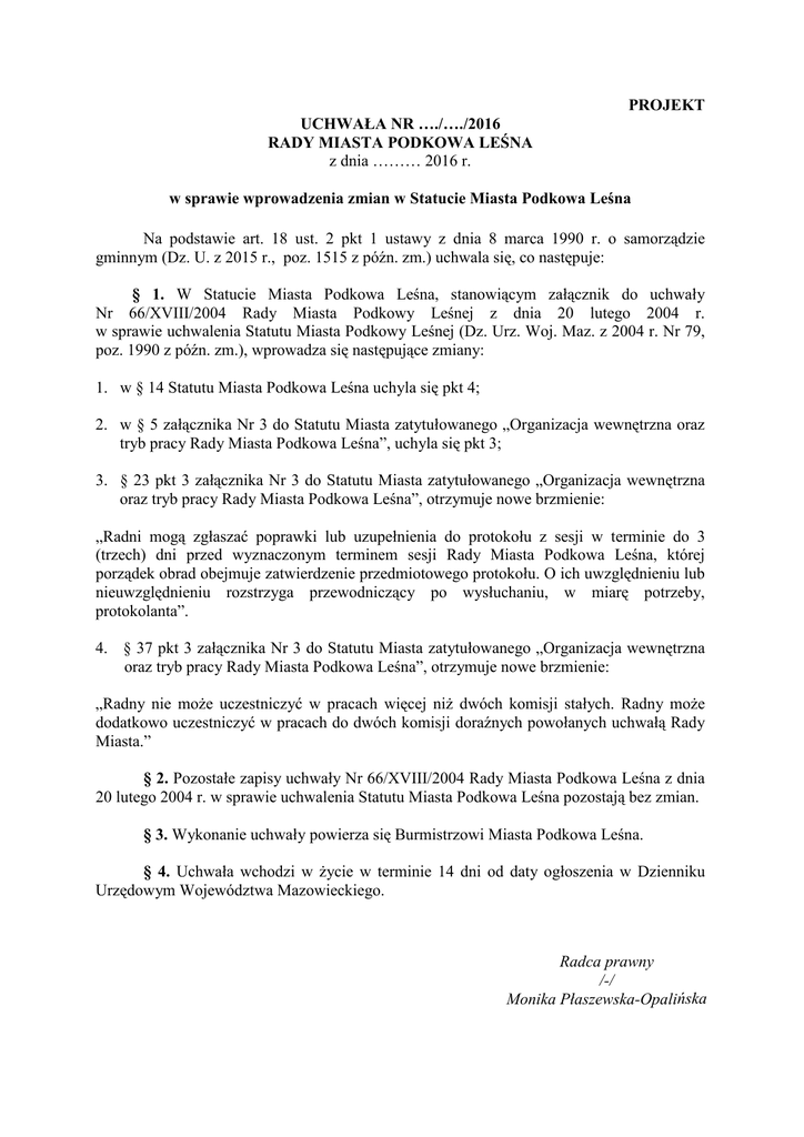 PROJEKT UCHWAŁA NR …./…./2016 RADY MIASTA PODKOWA LEŚNA z dnia ……… 2016 r. w sprawie wprowadzenia zmian w Statucie Miasta Podkowa Leśna Na podstawie art. 18 ust. 2 pkt 1 ustawy z dnia 8 marca 1990 r. o samorządzie gminnym (Dz. U. z 2015 r., poz. 1515 z późn. zm.) uchwala się, co następuje: § 1. W Statucie Miasta Podkowa Leśna, stanowiącym załącznik do uchwały Nr 66/XVIII/2004 Rady Miasta Podkowy Leśnej z dnia 20 lutego 2004 r. w sprawie uchwalenia Statutu Miasta Podkowy Leśnej (Dz. Urz. Woj. Maz. z 2004 r. Nr 79, poz. 1990 z późn. zm.), wprowadza się następujące zmiany: 1. w § 14 Statutu Miasta Podkowa Leśna uchyla się pkt 4; 2. w § 5 załącznika Nr 3 do Statutu Miasta zatytułowanego „Organizacja wewnętrzna oraz tryb pracy Rady Miasta Podkowa Leśna”, uchyla się pkt 3; 3. § 23 pkt 3 załącznika Nr 3 do Statutu Miasta zatytułowanego „Organizacja wewnętrzna oraz tryb pracy Rady Miasta Podkowa Leśna”, otrzymuje nowe brzmienie: „Radni mogą zgłaszać poprawki lub uzupełnienia do protokołu z sesji w terminie do 3 (trzech) dni przed wyznaczonym terminem sesji Rady Miasta Podkowa Leśna, której porządek obrad obejmuje zatwierdzenie przedmiotowego protokołu. O ich uwzględnieniu lub nieuwzględnieniu rozstrzyga przewodniczący po wysłuchaniu, w miarę potrzeby, protokolanta”. 4. § 37 pkt 3 załącznika Nr 3 do Statutu Miasta zatytułowanego „Organizacja wewnętrzna oraz tryb pracy Rady Miasta Podkowa Leśna”, otrzymuje nowe brzmienie: „Radny nie może uczestniczyć w pracach więcej niż dwóch komisji stałych. Radny może dodatkowo uczestniczyć w pracach do dwóch komisji doraźnych powołanych uchwałą Rady Miasta.” § 2. Pozostałe zapisy uchwały Nr 66/XVIII/2004 Rady Miasta Podkowa Leśna z dnia 20 lutego 2004 r. w sprawie uchwalenia Statutu Miasta Podkowa Leśna pozostają bez zmian. § 3. Wykonanie uchwały powierza się Burmistrzowi Miasta Podkowa Leśna. § 4. Uchwała wchodzi w życie w terminie 14 dni od daty ogłoszenia w Dzienniku Urzędowym Województwa Mazowieckiego. Radca prawny /-/ Monika Płaszewska-Opalińska UZASADNIENIE do projektu uchwały w sprawie zmian w Statucie Miasta Podkowa Leśna W związku z rozpoczęciem procesu aktualizacji Statutu Miasta Podkowa Leśna uchwalonego w roku 2004, mając na uwadze konieczność dostosowania go do zmieniających się przepisów prawa oraz usprawnienia organizacji pracy Rady Miasta, wydaje się zasadne wprowadzenie zmian przedstawionych w projekcie uchwały. Kwestie terminów zwoływania sesji rad gmin zostały określone w art. 20 ustawy z dnia 8 marca 1990 r. o samorządzie gminnym (Dz. U. z 2015 r., poz. 1515). Modyfikacje ustawy są niedopuszczalne. Samorządy mogą w statutach precyzować przepisy ustaw, ale tylko jeżeli te pozostawiają na to miejsce. W związku z tym obecny zapis w Statucie Miasta stoi wprost w sprzeczności z ustawą o samorządzie gminnym. Ponadto należy stwierdzić, że minimalny 14 dniowy termin na wprowadzenie do porządku obrad sesji projektów uchwał w sprawie zmian budżetu miasta jest olbrzymim utrudnieniem w pracy. Zmiany budżetu wynikają na ogół z bieżącej, dynamicznej sytuacji (rozstrzygnięcie przetargów, pojawiająca się możliwość startowania w konkursie o dotacje itp.) i wymagają szybkiego działania. Natomiast w przypadku wcześniej planowanych zmian budżetu, zmiany te będą przekazywane z wyprzedzeniem. Dodatkowo wyjaśniam, że tryb prac nad projektem uchwały budżetowej Miasta Podkowa Leśna oraz rozpatrywania sprawozdań z wykonania budżetu został określony w uchwale Rady Miasta Podkowa Leśna Nr 213/XLIV/2010 z dnia 8.11.2010 r. Kwestie planów gospodarczych np. strategia miasta, plany zagospodarowania przestrzennego podlegają odrębnym trybom procedowania. Kwestie wygaśnięcia mandatu radnych regulują przepisy ustawy z dnia 5 stycznia 2011 r. Kodeks wyborczy (Dz. U. Nr 21, poz. 112 z późn. zm.)- zapisy Statutu w tym zakresie są w związku z tym bezzasadne. Pozostałe proponowane zmiany mają na celu usprawnienie organizacji pracy Rady Miasta. Wskazane zmiany poprzedzają procedurę aktualizacji i dostosowania Statutu Miasta do obowiązujących zapisów prawnych jako aktu prawa miejscowego. Wnosimy o podjęcie uchwały i wprowadzenie zaproponowanych zmian. Przewodniczący Rady Miasta Podkowa Leśna /-/ Grzegorz Smoliński Burmistrz Miasta Podkowa Leśna /-/ Artur Tusiński