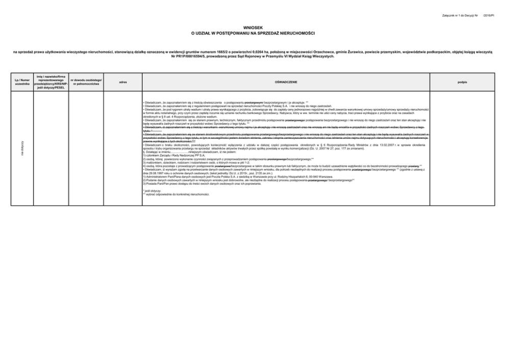 Załącznik nr 1 do Decyzji Nr /2016/PI WNIOSEK O UDZIAŁ W POSTĘPOWANIU NA SPRZEDAŻ NIERUCHOMOŚCI na sprzedaż prawa użytkowania wieczystego nieruchomości, stanowiącą działkę oznaczoną w ewidencji gruntów numerem 1665/2 o powierzchni 0,0264 ha, położoną w miejscowości Orzechowce, gminie Żurawica, powiecie przemyskim, województwie podkarpackim, objętej księgą wieczystą Nr PR1P/00016594/5, prowadzoną przez Sąd Rejonowy w Przemyślu VI Wydział Ksiąg Wieczystych. nie dotyczy Lp./ Numer uczestnika imię i nazwisko/firma reprezentowanego nr dowodu osobistego/ przedsiębiorcy/KRS/NIPnr pełnomocnictwa jeśli dotyczy/PESEL OŚWIADCZENIE adres • Oświadczam, że zapoznałam/em się z treścią obwieszczenia o postępowaniu przetargowym/ bezprzetargowym i je akceptuje. ** • Oświadczam, że zapoznałam/em się z regulaminem postępowań na sprzedaż nieruchomości Poczty Polskiej S.A. i nie wnoszę do niego zastrzeżeń. • Oświadczam, że pod rygorem utraty wadium i utraty prawa wynikającego z przybicia, zobowiązuje się do zapłaty ceny jednorazowo najpóźniej w chwili zawarcia warunkowej umowy sprzedaży/umowy sprzedaży nieruchomości w formie aktu notarialnego, przy czym przez zapłatę rozumie się uznanie rachunku bankowego Sprzedawcy. Nabywca, który w ww. terminie nie uiści ceny nabycia, traci prawa wynikające z przybicia oraz na zasadach określonych w § 8 ust. 4 Rozporządzenia, złożone wadium. • Oświadczam, że zapoznałam/em się ze stanem prawnym, technicznym, faktycznym przedmiotu postępowania przetargowego/ postępowania bezprzetargowego i nie wnoszę do niego zastrzeżeń oraz ten stan akceptuję i nie będę wysuwał/a żadnych roszczeń w przyszłości wobec Sprzedawcy z tego tytułu. ** • Oświadczam, iż zapoznałam/em się z treścią i warunkami warunkowej umowy najmu i je akceptuję i nie wnoszę zastrzeżeń oraz nie wnoszę ani nie będę wnosił/a w przyszłości żadnych roszczeń wobec Sprzedawcy z tego tytułu. * • Oświadczam, że zapoznałam/em się ze stanem środowiskowym przedmiotu postępowania przetargowego/bezprzetargowego i nie wnoszę do niego zastrzeżeń oraz ten stan akceptuję i nie będę wysuwał/a żadnych roszczeń w przyszłości wobec Sprzedawcy z tego tytułu, w tym w szczególności jestem świadom istnienia, zakresu i stopnia zanieczyszczenia nieruchomości oraz istnienia umów najmu dotyczących nieruchomości i akceptuję konsekwencje prawne wynikające z tych okoliczności.*** • Oświadczam o braku okoliczności, powodujących konieczność wyłączenia z udziału w dalszej części postępowania określonych w § 6 Rozporządzenia Rady Ministrów z dnia 13.02.2007 r. w sprawie określenia sposobu i trybu organizowania przetargu na sprzedaż składników aktywów trwałych przez spółkę powstałą w wyniku komercjalizacji (Dz. U. 2007 Nr 27, poz. 177 ze zmianami). tj. Działając w imieniu.......................niniejszym oświadczam, iż nie jestem: 1) członkiem Zarządu i Rady Nadzorczej PP S.A; 2) osobą, której powierzono wykonanie czynności związanych z przeprowadzeniem postępowania przetargowego/bezprzetargowego;** 3) małżonkiem, dzieckiem, rodzicem i rodzeństwem osób, o których mowa w pkt 1-2; 4) osobą, która pozostaje z prowadzącym postępowanie przetargowe/bezprzetargowe w takim stosunku prawnym lub faktycznym, że może to budzić uzasadnione wątpliwości co do bezstronności prowadzącego przetarg.** • Oświadczam, iż wyrażam zgodę na przetwarzanie danych osobowych zawartych w niniejszym wniosku, dla potrzeb niezbędnych do realizacji procesu postępowania przetargowego/ bezprzetargowego ** (zgodnie z ustawą z dnia 29.08.1997 roku o ochronie danych osobowych; (tekst jednolity: Dz.U. z 2015r., poz. 2135 ze zm.). 1) Administratorem Pani/Pana danych osobowych jest Poczta Polska S.A. z siedzibą w Warszawie przy ul. Rodziny Hiszpańskich 8, 00-940 Warszawa. 2) Podanie danych osobowych zawartych w niniejszym wniosku jest dobrowolne, ale niezbędne do realizacji procesu postępowania przetargowego/ bezprzetargowego** 3) Posiada Pani/Pan prawo dostępu do treści swoich danych osobowych oraz ich poprawiania. * jeśli dotyczy. ** wybrać odpowiednie do konkretnej nieruchomości. podpis