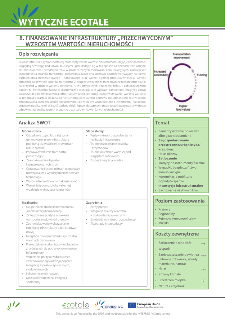 WYTYCZNE ECOTALE 8. FINANSOWANIE INFRASTRUKTURY „PRZECHWYCONYM” WZROSTEM WARTOŚCI NIERUCHOMOŚCI Opis rozwiązania Bliskość infrastruktury transportowej może wpływać na wartość nieruchomości, dając jednej lokalizacji względną przewagę nad innymi miejscami i przekładając się w ten sposób na bezpośrednie korzyści dla mieszkańców i przedsiębiorców w postaci różnych możliwości komunikacyjnych skutkujących oszczędnością kosztów transportu i parkowania. Może ona stanowić czynnik wpływający na rozwój budownictwa mieszkaniowego i handlowego oraz wzrost ogólnej produktywności w wyniku obniżenia całkowitych kosztów transportu. Z drugiej strony może mieć również niekorzystne skutki, na przykład w postaci wzrostu natężenia ruchu prywatnych pojazdów, hałasu i zanieczyszczenia powietrza. Potencjalne korzyści ekonomiczne wynikające z większej dostępności mogłyby zostać wykorzystane do sfinansowania infrastruktury dzięki koncepcji „przechwytywania” wzrostu wartości. W ten sposób wartość dodana do nieruchomości w wyniku poprawy dostępności nie jest w całości zatrzymywana przez właścicieli nieruchomości, ale musi być współdzielona z inwestorami, najczęściej organami publicznymi. Wartość dodana dzięki lepszej dostępności może zostać oszacowana w drodze odpowiedniej analizy regresji w oparciu o wartości rynkowe różnych nieruchomości. Analiza SWOT Temat Mocne strony • Odzyskanie części lub całej sumy generowanej przez infrastrukturę publiczną dla właścicieli prywatnych (value capture) • Poprawa w zakresie transportu publicznego • Zaangażowanie obywateli i zainteresowanych stron • Opracowanie i ocena różnych scenariuszy rozwoju także z wykorzystaniem nowych technologii • Wprowadzenie działań w zakresie opłat • Wzrost świadomości obywatelskiej w zakresie wykorzystania gruntów Słabe strony • Wpływ sytuacji gospodarczej na realizację infrastruktury • Trudne oszacowanie kosztów i przychodów • Trudne określanie wartości pod względem ilościowym • Trudna integracja wiedzy Możliwości • Uzupełnienie działaniami w kierunku „minimalizacji/kompensacji” • Zintegrowana polityka w zakresie transportu, środowiska i gruntów • Zoptymalizowane wykorzystanie istniejącej infrastruktury, a nie budowa nowej • Integracja nowej infrastruktury i działań w ramach planowania • Przekształcenia urbanizacyjne obszarów znajdujących się pod wypływem nowej infrastruktury • Wspieranie polityki rządu na rzecz zrównoważonego rozwoju poprzez integrację aspektów społecznych, środowiskowych • i ekonomicznych rozwoju • Możliwość wspierania integracji społecznej Zagrożenia • Ramy prawne • Integracja między władzami a podmiotami prywatnymi • Zależność od sytuacji gospodarczej • Akceptacja interesariuszy • Zanieczyszczenie powietrza albo gazy cieplarniane • Zagospodarowanie przestrzenne/urbanistyka/ krajobraz • Hałas uliczny • Zatłoczenie • Tradycyjne instrumenty fiskalne • Wypadki, bezpieczeństwo komunikacyjne • Komunikacja publiczna dopłaty/wsparcie • Inwestycje infrastrukturalne • Zachowanie użytkowników Poziom zastosowania • • • • Krajowy Regionalny Rejonowy/metropolitalny Miejski Koszty zewnętrzne • Zatłoczenie i niedobór ++ • Wypadki • Zanieczyszczenie powietrza +/– (zdrowie człowieka, szkody materialne, natura) • Hałas +/– • Zmiany klimatu • Przestrzeń miejska +/– • Natura i krajobraz + This project is co-financed by the ERDF and made possible by the INTERREG IVC programme WYTYCZNE ECOTALE Sugestie metodologiczne Składnik kosztów Koszt zewnętrzny Elementy kosztów Funkcja/nośnik kosztów czas podróży (cel, środek transportu, długość przejazdów pasażerskich, środek transportu oraz rodzaj towaru do transportu) rodzaj infrastruktury bezpieczeństwo wielkość i skład strumienia ruchu Zatłoczenie wydłużenie czasu podróży x wartość i niedobór czasu x wielkość ruchu uciążliwość koszt wzrasta nieznacznie wraz z ruchem i w zależności od sytuacji (czas-miejsce) meteo- i topografia mają wpływ na stężenie zanieczyszczeń koszt zanieczyszczenia gleby i wody Przestrzeń miejska Zmotoryzowany ruch w obszarach miejskich ma różny wpływ na niezmotoryzowanych uczestników ruchu (pieszych, rowerzystów, itp.). koszt rekompensaty w celu zapewnienia różnorodności biologicznej rodzaj infrastruktury szkody w budynkach poziom ruchu szkody w rolnictwie szkody dla zdrowia człowieka lokalizacja - narażenie gęstość zaludnienia i osiedli rodzaj silnika - zasilanie paliwem cechy kierowców poziom irytacji zależy od poziomu ruchu liczba mieszkańców i gęstość zaludnienia szkody w ekosystemach irytacja wpływ na zdrowie utrata wartości nieruchomości wskaźniki hałasu koszty separacji dla pieszych czas narażenia koszty wynikające z niedoboru Potrzebne dane stosunek prędkość/ przepływ Istotne kwestie dot. wyceny stosunek prędkość/ przepływ elastyczność popytu marginalne koszty wartość czasu społeczne poziom przepustowości w czasie koszt zwiększenia ciągłości biologicznej Koszty zanieczyszczenia powietrza są powodowane przez emisję Zanieczysz- cząstek stałych (PM), NOx, SO2 i VOC. Koszty zanieczyszczenia powczenie ietrza są także generowane przez powietrza przemysł, rolnictwo i gospodarstwa domowe. Hałas może być zdefiniowany jako niepożądany dźwięk, który powoduje fizjologiczne lub psychiczne szkody dla ludzi. Zaleca Hałas się wzięcie pod uwagę grupy wrażliwe, takie jak dzieci i osoby starsze. WTP/WTA w celu oszacowania wartości czasu w przypadku zatłoczenia rodzaj sieci (miejska, międzymiastowa, metropolitalna liczba pasów) spadek wartości dodatkowe koszty paliwa koszty środowiskowe opóźnienie bezpośrednie i wywołane koszt alternatywny Przyroda i krajobraz Proponowane techniki szacowania WTP w celu oszacowania kosztów zwi
