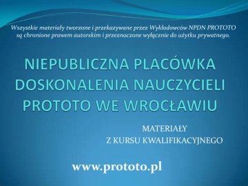 Wszystkie materiały tworzone i przekazywane przez Wykładowców NPDN PROTOTO są chronione prawem autorskim i przeznaczone wyłącznie do użytku prywatnego. MATERIAŁY Z KURSU KWALIFIKACYJNEGO www.prototo.pl Socjometria dr Michał Gułowski Pozwala uzyskać informację na temat: 1. Różnych stanów charakteryzujących zespół np. spójność 2. O miejscu i pozycji, jakie zajmuje jednostka w zespole Badanie socjometryczne polega na zadaniu pytania każdemu członkowi grupy, kogo obdarza uczuciami sympatii, szacunku, zaufania czy wrogości. Np. Nauczyciel rozdaje kartki, lub wcześniej ma przygotowany arkusz. Należy je podpisać. Polecenie: Wyobraź sobie, że możesz zabrać na … (zabawę, wycieczkę) 3 osoby z klasy. Wybrałbyś… Kryterium socjologiczne: zawiera w sobie wszystkie pytania dotyczące chęci współpracy i wspólnej realizacji zadań. Pytanie: Z kim chciałbyś pracować na działce? Kryterium psychologiczne: zawiera w sobie wszystkie pytania dotyczące chęci wspólnej zabawy, przebywania razem czy rozmawiania. Pytanie: Z kim chciałbyś porozmawiać o swoich kłopotach i zmartwieniach? • • • • • • Kryterium odnoszące się do kontaktów społecznych: Siedzenia razem w jednej ławce Wspólnego odrabiania lekcji Organizowania wycieczki Wspólnego przygotowania jakiegoś problemu do przedstawienia na lekcji Udziału w grach sportowych Organizowania zabawy Istotne jest odpowiednie wprowadzenie uczniów. Powinni poznać przyczynę pytania o swoje preferencje – realistyczne. Otrzymane wyniki wykorzystane mogą zostać w dwojaki sposób: analizy danych charakteryzujących cały zespół (grupę) lub analizy danych charakteryzujące pozycję dziecka w zespole. Socjogram kołowy Sporządza się w celu graficznego przedstawienia układu wzajemnych wyborów. Budowany na zasadzie koncentrycznej: osoby otrzymujące największą liczbę wyborów znajdują się bliżej środka koła, najrzadziej wybierani- daleko na zewnątrz. Należy oddzielić płeć badanych w celu orientowania się w zakresie stosunków między dziewczętami, a chłopcami. Prezentacja wyników W przykładowych socjogramach stosuje się następujące oznaczenia: a) Dziewczyna (okrąg), chłopiec (trójkąt) b) Wybór jednostronny (zielona strzałka), wybór dwustronny (fioletowa) Kryterium: PRZYWÓDCA "Kto z klasy Twoim zdaniem powinien być prawą ręką wychowawcy i kto jeszcze powinien pracować w samorządzie klasowym?" Socjogram zwykły. Jego zaletą jest to, że możemy wykonać go bez uprzedniego wykonania tabeli, rysujemy tylko znaczki, symbolizujące uczniów i łączące je strzałki. W trakcie odczytywania kartek wypełnionych przez uczniów. Zalety Kierunek i waga wyboru są bardzo czytelne Wyraźnie widać rodzaje kontaktów między dziewczętami i chłopcami Bez trudu można skoncentrować się na przeanalizowaniu powiązań i pozycji poszczególnych uczniów Możliwe jest wykrycie podgrup lub paczek, osób popularnych tzw. gwiazd socjometrycznych i osób izolowanych. Gdy socjogram dopuszcza wybór osób spoza klasy, wtedy może wskazać osoby marginesowe, które lokowały swoje wybory poza klasą. Nie należy informować informacjach. uczniów o zebranych