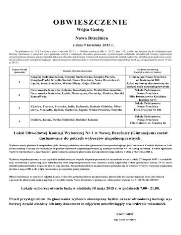 OBWIESZCZENIE Wójta Gminy Nowa Brzeźnica z dnia 9 kwietnia 2015 r. Na podstawie art. 16 § 1 ustawy z dnia 5 stycznia 2011 r. — Kodeks wyborczy (Dz. U. Nr 21, poz. 112, z późn. zm.) podaje się do wiadomości publicznej informację o numerach oraz granicach stałych i odrębnych obwodów głosowania, wyznaczonych siedzibach obwodowych komisji wyborczych utworzonych na obszarze gminy (miasta), lokalach obwodowych komisji wyborczych dostosowanych do potrzeb wyborców niepełnosprawnych oraz o możliwości głosowania korespondencyjnego i głosowania przez pełnomocnika w wyborach Prezydenta Rzeczypospolitej Polskiej, zarządzonych na dzień 10 maja 2015 r. Numer obwodu głosowania 1 2 3 4 Siedziba obwodowej komisji wyborczej (adres) Granice obwodu głosowania Kruplin Radomszczański, Kruplin Barbarówka, Kruplin-Parcela, Kruplin-Piaski, Kruplin Średni, Nowa Brzeźnica, Nowa Brzeźnica ul. Łączki, Stara Brzeźnica, Ważne Młyny, Gojsc, Płaczki Gimnazjum Nowa Brzeźnica ul. Kościuszki 100 Lokal wyborczy dostosowany do potrzeb osób niepełnosprawnych Dworszowice Kościelne Kolonia, Konstantynów, Pieńki Dworszowskie, Szkoła Podstawowa Dworszowice Kościelne, Łążek, Płaszczyzna, Orczuchy, Madera, Stoczki, Nowa Brzeźnica Filia Dworszowice Kościelne ZimnaWoda Kolonia Nr74 Szkoła Podstawowa Kuźnica, Trzebca, Prusicko, Jedle, Kaflarnia, Kolonia Gidelska, MiroNowa Brzeźnica szowy, Moczydła, Rybaki, Rzędowie, Zapole, Wólka Prusicka, Wierzba Filia Prusicko Nr 101 Dubidze, Janów, Pieńki Dubidzkie, Dubidze Kolonia Szkoła Podstawowa Nowa Brzeźnica Filia Dubidze ul. Szkolna 16 Lokal Obwodowej Komisji Wyborczej Nr 1 w Nowej Brzeźnicy (Gimnazjum) został dostosowany do potrzeb wyborców niepełnosprawnych. Wyborca może głosować korespondencyjnie. Komisją właściwą do celów głosowania korespondencyjnego jest Obwodowa Komisja Wyborcza, która ma siedzibę w lokalu dostosowanym do potrzeb wyborców niepełnosprawnych, tj. komisja wyborcza Nr 1 w Nowej Brzeźnicy. Termin zgłoszenia wójtowi (burmistrzowi, prezydentowi) gminy (miasta) zamiaru głosowania korespondencyjnego upływa w dniu 27 kwietnia 2015 r. Wyborca niepełnosprawny o znacznym lub umiarkowanym stopniu niepełnosprawności w rozumieniu ustawy z dnia 27 sierpnia 1997 r. o rehabilitacji zawodowej i społecznej oraz zatrudnianiu osób niepełnosprawnych oraz wyborca, który najpóźniej w dniu głosowania kończy 75 lat, może udzielić pełnomocnictwa do głosowania w jego imieniu. Akt pełnomocnictwa do głosowania sporządza się na wniosek wyborcy wniesiony najpóźniej do dnia 4 maja 2015 r. do wójta (burmistrza, prezydenta) gminy (miasta). Bliższe informacje w sprawach rejestru i spisu wyborców, pełnomocnictwa do głosowania, głosowania korespondencyjnego oraz zaświadczeń o prawie do głosowania można uzyskać w Urzędzie Gminy Nowa Brzeźnica w pokoju nr 4 lub pod nr telefonu 34/ 3119670; 34/ 3119677. Lokale wyborcze otwarte będą w niedzielę 10 maja 2015 r. w godzinach 7.00 - 21.00. Przed przystąpieniem do głosowania wyborca obowiązany będzie okazać obwodowej komisji wyborczej dowód osobisty lub inny dokument ze zdjęciem umożliwiający stwierdzenie tożsamości. WÓJT GMINY mgr Jacek Jarząbek
