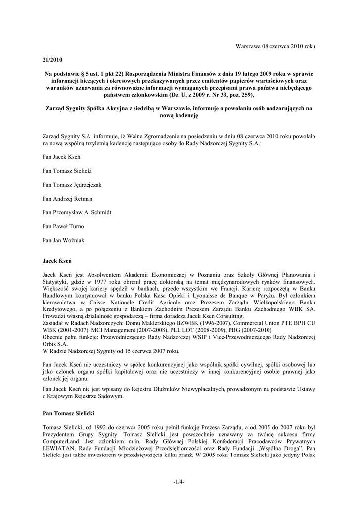 Warszawa 08 czerwca 2010 roku 21/2010 Na podstawie § 5 ust. 1 pkt 22) Rozporządzenia Ministra Finansów z dnia 19 lutego 2009 roku w sprawie informacji bieŜących i okresowych przekazywanych przez emitentów papierów wartościowych oraz warunków uznawania za równowaŜne informacji wymaganych przepisami prawa państwa niebędącego państwem członkowskim (Dz. U. z 2009 r. Nr 33, poz. 259), Zarząd Sygnity Spółka Akcyjna z siedzibą w Warszawie, informuje o powołaniu osób nadzorujących na nową kadencję Zarząd Sygnity S.A. informuje, iŜ Walne Zgromadzenie na posiedzeniu w dniu 08 czerwca 2010 roku powołało na nową wspólną trzyletnią kadencję następujące osoby do Rady Nadzorczej Sygnity S.A.: Pan Jacek Kseń Pan Tomasz Sielicki Pan Tomasz Jędrzejczak Pan Andrzej Retman Pan Przemysław A. Schmidt Pan Paweł Turno Pan Jan Woźniak Jacek Kseń Jacek Kseń jest Absolwentem Akademii Ekonomicznej w Poznaniu oraz Szkoły Głównej Planowania i Statystyki, gdzie w 1977 roku obronił pracę doktorską na temat międzynarodowych rynków finansowych. Większość swojej kariery spędził w bankach, przede wszystkim we Francji. Karierę rozpoczętą w Banku Handlowym kontynuował w banku Polska Kasa Opieki i Lyonaisse de Banque w ParyŜu. Był członkiem kierownictwa w Caisse Nationale Credit Agricole oraz Prezesem Zarządu Wielkopolskiego Banku Kredytowego, a po połączeniu z Bankiem Zachodnim Prezesem Zarządu Banku Zachodniego WBK SA. Prowadzi własną działalność gospodarczą – firma doradcza Jacek Kseń Consulting. Zasiadał w Radach Nadzorczych: Domu Maklerskiego BZWBK (1996-2007), Commercial Union PTE BPH CU WBK (2001-2007), MCI Management (2007-2008), PLL LOT (2008-2009), PBG (2007-2010) Obecnie pełni funkcje: Przewodniczącego Rady Nadzorczej WSIP i Vice-Przewodniczącego Rady Nadzorczej Orbis S.A. W Radzie Nadzorczej Sygnity od 15 czerwca 2007 roku. Pan Jacek Kseń nie uczestniczy w spółce konkurencyjnej jako wspólnik spółki cywilnej, spółki osobowej lub jako członek organu spółki kapitałowej oraz nie uczestniczy w innej konkurencyjnej osobie prawnej jako członek jej organu. Pan Jacek Kseń nie jest wpisany do Rejestru DłuŜników Niewypłacalnych, prowadzonym na podstawie Ustawy o Krajowym Rejestrze Sądowym. Pan Tomasz Sielicki Tomasz Sielicki, od 1992 do czerwca 2005 roku pełnił funkcję Prezesa Zarządu, a od 2005 do 2007 roku był Prezydentem Grupy Sygnity. Tomasz Sielicki jest powszechnie uznawany za twórcę sukcesu firmy ComputerLand. Jest członkiem m.in. Rady Głównej Polskiej Konfederacji Pracodawców Prywatnych LEWIATAN, Rady Fundacji MłodzieŜowej Przedsiębiorczości oraz Rady Fundacji „Wspólna Droga”. Pan Sielicki jest takŜe inwestorem w przedsięwzięcia kilku branŜ. W 2005 roku Tomasz Sielicki jako jedyny Polak -1/4- znalazł się wśród 25. osobowości wyróŜnionych w rankingu „Stars of Europe 2005”, europejskiej edycji prestiŜowego tygodnika BusinessWeek. Ranking „Stars of Europe” wskazał na 25 postaci ze świata polityki, biznesu i mody, które są „liderami zmian w zjednoczonej Europie”. W kwietniu 2006 roku otrzymał prestiŜową nagrodę polskiego środowiska teleinformatycznego, przyznaną przez Polską Izbę Informatyki i Telekomunikacji. Nagroda ta przyznawana jest osobom, które szczególnie zasłuŜyły się dla rozwoju rynku informatycznego i telekomunikacyjnego. Zasiada w radach nadzorczych Agora SA, Budimex SA. W Radzie Nadzorczej Sygnity od 15 czerwca 2007 roku. Pan Tomasz Sielicki nie prowadzi innej działalności wykonywanej poza przedsiębiorstwem emitenta, nie uczestniczy w spółce konkurencyjnej jako wspólnik spółki cywilnej, spółki osobowej lub jako członek organu spółki kapitałowej oraz nie uczestniczy w innej konkurencyjnej osobie prawnej jako członek jej organu. Pan Tomasz Sielicki nie jest wpisany do Rejestru DłuŜników Niewypłacalnych, prowadzonym na podstawie Ustawy o Krajowym Rejestrze Sądowym. Tomasz Jędrzejczak Pan Tomasz Jędrzejczak jest absolwentem Wydziału Elektroniki Politechniki Łódzkiej. Tytuł Charterem Financial Analyst uzyskał w 1999 r. Posiada licencję doradcy inwestycyjnego nr 8 oraz licencję maklera papierów wartościowych nr 84. Z rynkiem kapitałowym związany od 1991 r. Od 1994 pracował w Banku Handlowym, gdzie współtworzył działalność zarządzania aktywami w COK. Od listopada 1999r. Wiceprezes Zarządu Handlowy Zarządzanie Aktywami SA. Od października 2001 r. pełnił równieŜ obowiązki Wiceprezesa Zarządu Towarzystwa Funduszy Inwestycyjnych Banku Handlowego SA. W Radzie Nadzorczej Sygnity zasiada od 11 czerwca 2008 roku. Obecnie Pan Tomasz Jędrzejczak pełni funkcję Prezesa Zarządu Towarzystwa Funduszy Inwestycyjnych Legg Mason SA oraz Prezesa Zarządu Legg Mason Zarządzanie Aktywami SA. Pan Tomasz Jędrzejczak nie uczestniczy w spółce konkurencyjnej jako wspólnik spółki cywilnej, spółki osobowej lub jako członek organu spółki kapitałowej oraz nie uczestniczy w innej konkurencyjnej osobie prawnej jako członek jej organu. Pan Tomasz Jędrzejczak nie jest wpisany do Rejestru DłuŜników Niewypłacalnych, prowadzonym na podstawie Ustawy o Krajowym Rejestrze Sądowym. Andrzej Retman Pan Andrzej Retman jest absolwentem Wydziału Elektroniki Politechniki Gdańskiej. Swoją karierę rozpoczął w 1992 roku podczas prac w zespole tworzącym pierwsze jednolite systemy rozliczeń międzybankowych „SYBIR” i „ELIXIR”. W latach 1994-1997 brał udział w budowaniu Biura Maklerskiego Banku Gdańskiego. W roku 1998 został powołany na stanowisko Prezesa Zarządu Domu Maklerskiego Banku Współpracy Europejskiej w Warszawie. W latach 1999-2008 jako dyrektor zarządzający, potem Wiceprezes Zarządu oraz Prezes Zarządu zbudował silną pozycję spółki OptiX, która w tym okresie stała się rozpoznawalną marką na klientów IT. W latach 2008-2009 Wiceprezes Zarządu Asseco System S.A. Obecnie Prezes Zarządu RAM