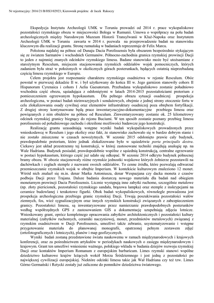 Nr rejestracyjny: 2016/21/B/HS3/02923; Kierownik projektu: dr Jacek Rakoczy Ekspedycja Instytutu Archeologii UMK w Toruniu prowadzi od 2014 r. prace wykopaliskowe pozostałości rzymskiego obozu w miejscowości Bologa w Rumunii. Umowa o współpracy na polu badań archeologicznych między Narodowym Muzeum Historii Transylwanii w Kluż-Napoka oraz Instytutem Archeologii UMK w Toruniu zawarta w 2014 r. pozwala na przeprowadzenie badań na stanowisku kluczowym dla realizacji grantu. Stronę rumuńską w badaniach reprezentuje dr Felix Marcu. Położona najdalej na północ od Dunaju Dacia Porolissensis była obszarem bezpośrednio stykającym się ze światem Sarmatów i wschodnich Germanów. Północno-zachodnia granica rzymskiej prowincji Dacji to jeden z najmniej znanych odcinków rzymskiego limesu. Badane stanowisko może być utożsamiane z starożytnym Resculum, miejscem stacjonowania rzymskich oddziałów wojsk pomocniczych, których zadaniem była straż w położonych w okolicznych górach posterunkach, będących ostatnią nieprzebadaną częścią limesu rzymskiego w Europie. Celem projektu jest rozpoznanie charakteru rzymskiego osadnictwa w rejonie Resculum. Obóz powstał w pierwszej dekadzie II w. i był użytkowany do końca III w. Jego garnizon stanowiły cohors II Hispanorum Cyrenaica i cohors I Aelia Gaesatorum. Przebadana wykopaliskowo zostanie południowo wschodnia część obozu, sąsiadująca z odsłoniętymi w latach 2014-2015 pozostałościami pretorium z pomieszczeniem ogrzewanym hypokaustum. Dla pełnego obrazu sytuacji osadniczej prospekcja archeologiczna, w postaci badań nieinwazyjnych i sondażowych, obejmie z jednej strony otoczenie fortu w celu zlokalizowania osady cywilnej oraz elementów infrastruktury osadniczej poza obrębem fortyfikacji. Z drugiej strony kontynuowane będą prace inwentaryzacyjno-dokumentacyjne przebiegu limesu oraz powiązanych z nim obiektów na północ od Resculum. Zinwentaryzowany zostanie ok. 25 kilometrowy odcinek rzymskiej granicy biegnący do rejonu Buciumi. W ten sposób zostanie poznany przebieg limesu porolissensis od południowego zachodu i określone możliwości badawcze jego konstrukcji. Realizację grantu uzasadniają wstępne wyniki badań wykopaliskowych prowadzonych przez wnioskodawcę w Resulum i jego okolicy oraz fakt, że stanowisko zachowało się w bardzo dobrym stanie i nie zostało zniszczone w czasach nowożytnych. W sezonie 2015 odsłonięto prawie cały budynek, prawdopodobnie pretorium, które jednak zlokalizowane było w sąsiedztwie porta principalis dextra. Ciekawy jest układ przestrzenny tej konstrukcji, w której zastosowane techniki znajdują analogię np. na Wale Hadriana. Budynek posiadał, prawdopodobnie wspólne z sąsiednią konstrukcją, centralne ogrzewanie w postaci hypokaustum, którego część już udało się odkopać. W sezonie 2014 odkryto budynek północnej bramy obozu. W obozie stacjonowały różne rzymskie jednostki wojskowe których żołnierze pozostawili na dachówkach i cegłach stemple z nazwami swoich oddziałów. To cenne źródła, które pozwalają odtwarzać przemieszczanie rzymskich wojsk w obrębie Imperium. W kontekście kulturowym znaleziono 12 monet. Wśród nich znalazł się m.in. denar Marka Antoniusza, denar Wespazjana czy dacka moneta z czasów podboju Dacji przez Trajana. Dalsze badania dostarczą nowego materiału dla badań nad obiegiem monetarnym prowincji Dacia Porolissensis. Licznie występują inne zabytki ruchome, szczególnie metalowe (np. złoty pierścionek, pozostałości rzymskiego sandała, brązowa lampka) oraz stemple z inskrypcjami na ceramice budowlanej i terakotowe figurki. Obok badań wykopaliskowych, równolegle prowadzona jest prospekcja archeologiczna przebiegu granic rzymskiej Dacji. Trwają poszukiwania pozostałości wałów ziemnych, fos, wież sygnalizacyjnym oraz innych rzymskich konstrukcji związanych z zabezpieczeniem granicy. Pozostałości limesu, są inwentaryzowane przez namierzanie prawdopodobnych posterunków według współrzędnych GPS z zastosowaniem GIS a dokumentację uzupełniają zdjęcia lotnicze. Wnioskowany grant, oprócz kompletnego opracowania zabytków architektonicznych i pozostałości kultury materialnej (zabytków ruchomych, ceramiki naczyniowej, monet, przedmiotów metalowych) związanej z rzymskim osadnictwem w Dacji Porolissensis, umożliwi także zebranie, usystematyzowanie i wstępne przygotowanie materiału do planowanej monografii, opatrzonej pełnym zestawem zdjęć (ortofotograficznych i lotniczych), planów i map geofizycznych. Wyniki badań zostaną przedstawione światu naukowemu w ramach międzynarodowych i krajowych konferencji, oraz za pośrednictwem artykułów w periodykach naukowych o zasięgu międzynarodowym i krajowym. Grant ten umożliwi wniesienie ważnego, polskiego wkładu w badania dziejów rozwoju rzymskiej Dacji oraz kontaktów Imperium Romanum z europejskim barbaricum. Limes rzymski stanowi wspólne dziedzictwo kulturowe krajów leżących wokół Morza Śródziemnego i jest jedną z pozostałości po największej cywilizacji europejskiej. Niektóre odcinki limesu takie jak Wał Hadriana czy też tzw. Limes Górno Germański i Retycki zostały już zaliczone do pomników dziedzictwa światowego.