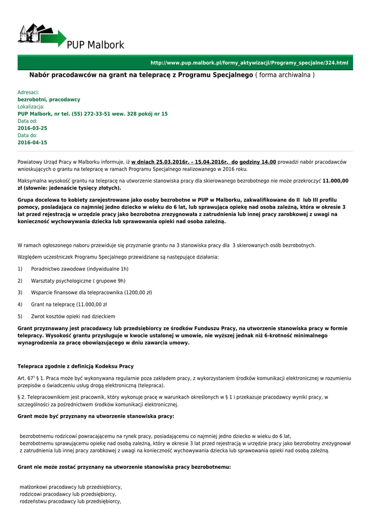 PUP Malbork http://www.pup.malbork.pl/formy_aktywizacji/Programy_specjalne/324.html Nabór pracodawców na grant na telepracę z Programu Specjalnego ( forma archiwalna ) Adresaci: bezrobotni, pracodawcy Lokalizacja: PUP Malbork, nr tel. (55) 272-33-51 wew. 328 pokój nr 15 Data od: 2016-03-25 Data do: 2016-04-15 Powiatowy Urząd Pracy w Malborku informuje, iż w dniach 25.03.2016r. – 15.04.2016r. do godziny 14.00 prowadzi nabór pracodawców wnioskujących o grantu na telepracę w ramach Programu Specjalnego realizowanego w 2016 roku. Maksymalna wysokość grantu na telepracę na utworzenie stanowiska pracy dla skierowanego bezrobotnego nie może przekroczyć 11.000,00 zł (słownie: jedenaście tysięcy złotych). Grupa docelowa to kobiety zarejestrowane jako osoby bezrobotne w PUP w Malborku, zakwalifikowane do II lub III profilu pomocy, posiadająca co najmniej jedno dziecko w wieku do 6 lat, lub sprawująca opiekę nad osoba zależną, która w okresie 3 lat przed rejestracją w urzędzie pracy jako bezrobotna zrezygnowała z zatrudnienia lub innej pracy zarobkowej z uwagi na konieczność wychowywania dziecka lub sprawowania opieki nad osoba zależną. W ramach ogłoszonego naboru przewiduje się przyznanie grantu na 3 stanowiska pracy dla 3 skierowanych osób bezrobotnych. Względem uczestniczek Programu Specjalnego przewidziane są następujące działania: 1) Poradnictwo zawodowe (indywidualne 1h) 2) Warsztaty psychologiczne ( grupowe 9h) 3) Wsparcie finansowe dla telepracownika (1200,00 zł) 4) Grant na telepracę (11.000,00 zł 5) Zwrot kosztów opieki nad dzieckiem Grant przyznawany jest pracodawcy lub przedsiębiorcy ze środków Funduszu Pracy, na utworzenie stanowiska pracy w formie telepracy. Wysokość grantu przysługuje w kwocie ustalonej w umowie, nie wyższej jednak niż 6-krotność minimalnego wynagrodzenia za pracę obowiązującego w dniu zawarcia umowy. Telepraca zgodnie z definicją Kodeksu Pracy Art. 675 § 1. Praca może być wykonywana regularnie poza zakładem pracy, z wykorzystaniem środków komunikacji elektronicznej w rozumieniu przepisów o świadczeniu usług drogą elektroniczną (telepraca). § 2. Telepracownikiem jest pracownik, który wykonuje pracę w warunkach określonych w § 1 i przekazuje pracodawcy wyniki pracy, w szczególności za pośrednictwem środków komunikacji elektronicznej. Grant może być przyznany na utworzenie stanowiska pracy: bezrobotnemu rodzicowi powracającemu na rynek pracy, posiadającemu co najmniej jedno dziecko w wieku do 6 lat, bezrobotnemu sprawującemu opiekę nad osobą zależną, który w okresie 3 lat przed rejestracją w urzędzie pracy jako bezrobotny zrezygnował z zatrudnienia lub innej pracy zarobkowej z uwagi na konieczność wychowywania dziecka lub sprawowania opieki nad osobą zależną. Grant nie może zostać przyznany na utworzenie stanowiska pracy bezrobotnemu: małżonkowi pracodawcy lub przedsiębiorcy, rodzicowi pracodawcy lub przedsiębiorcy, rodzeństwu pracodawcy lub przedsiębiorcy, dziecku własnemu lub przysposobionemu: pracodawcy lub przedsiębiorcy, ich małżonkowi oraz rodzeństwu. Na jaki okres należy zatrudnić osobę bezrobotną w ramach grantu na telepracę? Stosownie do zawartej ze starostą umowy, zobowiązany będziesz utrzymać zatrudnienie skierowanej osoby bezrobotnej przez okres 12 miesięcy w pełnym wymiarze czasu pracy lub przez okres 18 miesięcy w połowie wymiaru czasu pracy. Zgodnie z art. 36 ust. 5 lit. f ustawy z dnia 20 kwietnia 2004r. o promocji zatrudnienia i instytucjach rynku pracy (t.j. Dz. U. z 2015r. poz. 149 z późn. zm.) Powiatowy Urząd Pracy nie przyjąć oferty pracy, w szczególności jeżeli pracodawca w okresie 365 dni przed dniem zgłoszenia oferty pracy został ukarany lub skazany prawomocnym wyrokiem za naruszenie przepisów prawa pracy albo jest objęty postępowaniem dotyczącym naruszenia przepisów prawa pracy. Informacje dodatkowe dotyczące naboru 1. Przy wskazaniu we wniosku kandydatki konieczne jest złożenie dodatkowo formularza zgłoszeniowego do Ścieżki III przez osobę bezrobotną. 2. Wnioski, które wpłyną przed lub po wskazanym wyżej terminie oraz wnioski niekompletne nie będą rozpatrywane. 3. W przypadku wniosków nadsyłanych pocztą lub przesyłką kurierską o przyjęciu wniosku decyduje data faktycznego wpływu wniosku do siedziby Powiatowego Urzędu Pracy w Malborku. 4. Wniosek wraz z wymaganymi załącznikami (załączniki należy potwierdzić za zgodność z oryginałem poprzez umieszczenie na każdej stronie klauzuli: „potwierdzam zgodność z oryginałem” wraz z aktualną datą i podpisem) należy składać w siedzibie Powiatowego Urzędu Pracy w Malborku, przy Al. Armii Krajowej 70, 82 – 200 Malbork, pokój nr 12, I piętro (Sekretariat). 5. Do wniosku należy dołączyć wypełniony druk krajowej oferty pracy. 6. Wnioski, które przejdą pozytywnie ocenę formalną, będą rozpatrywane w terminie do 30 dni od dnia zakończenia naboru wniosków, w trybie konkursowym, przez komisję powołaną przez Dyrektora PUP, według n/w kryteriów: Spójność przedstawionej specyfikacji zakupów z tworzonym stanowiskiem pracy, rozeznanie rynku Zakres obowiązków odpowiadający formie telepracy Proponowana forma zabezpieczenia zwrotu otrzymanego grantu Deklarowana forma i długość zatrudnienia Opinia pośrednika pracy 1. Dla każdego wniosku komisja może przyznać maksymalnie 100 pkt. Po dokonaniu oceny merytorycznej wszystkich wniosków powstanie lista rankingowa na podstawie, której najwyżej ocenione wnioski otrzymają grant na telepracę na utworzenie stanowiska pracy dla skierowanego bezrobotnego. Nie jest możliwe przyznanie dofinansowania w przypadku gdy wniosek otrzyma mniej niż 60% maksymalnej liczby punktów tj. 60. W celu uzyskania bliższych informacji prosimy o kontakt z pracownikami Powiatowego Urzędu Pracy w Malborku pod nr tel. (055) 272-33-51 wew. 328 lub w siedzibie Urzędu pokój nr 15. Wni
