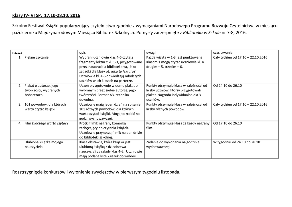 Klasy IV- VI SP, 17.10-28.10. 2016 Szkolny Festiwal Książki popularyzujący czytelnictwo zgodnie z wymaganiami Narodowego Programu Rozwoju Czytelnictwa w miesiącu październiku Międzynarodowym Miesiącu Bibliotek Szkolnych. Pomysły zaczerpnięte z Biblioteka w Szkole nr 7-8, 2016. nazwa 1. Piękne czytanie 2. Plakat o autorze, jego twórczości, wybranych bohaterach 3. 101 powodów, dla których warto czytać książki 4. Film Dlaczego warto czytać? 5. Ulubiona książka mojego nauczyciela opis Wybrani uczniowie klas 4-6 czytają fragmenty lektur z kl. 1-3, przygotowane przez nauczyciela bibliotekarza, jako zagadki dla klasy pt. Jaka to lektura? Uczniowie kl. 4-6 odwiedzają młodszych uczniów w ich klasach na parterze. Uczeń przygotowuje w domu plakat o wybranym przez siebie autorze, jego twórczości. Format A3, technika dowolna. Uczniowie mają jeden dzień na spisanie 101 różnych powodów, dla których warto czytać książki. Mogą to zrobić na godz. wychowawczej. Krótki filmik nagrany komórką zachęcający do czytania książek. Uczniowie przynoszą filmik na pen drivie do biblioteki szkolnej. Klasa obstawia, która książka jest ulubioną książką z dzieciństwa nauczycieli ze szkoły klas 4-6. Uczniowie mają podaną listę książek do wyboru. uwagi Każda wizyta w 1-3 jest punktowana. Klasom 1 mogą czytać uczniowie kl. 4 , drugim – 5, trzecim – 6. czas trwania Cały tydzień od 17.10 – 22.10.2016 Punkty otrzymuje klasa w zależności od liczby uczniów, którzy przygotowali plakat. Nagroda indywidualna dla 3 uczniów. Punkty otrzymuje klasa w zależności od liczby różnych powodów. Od 24.10 do 26.10 Cały tydzień od 17.10 – 22.10.2016 Punkty otrzymuje klasa za każdy nagrany Od 17.10 do 26.10 film. Zadanie do wykonania na godzinie wychowawczej. Rozstrzygnięcie konkursów i wyłonienie zwycięzców w pierwszym tygodniu listopada. W tygodniu od 24.10 do 28.10.