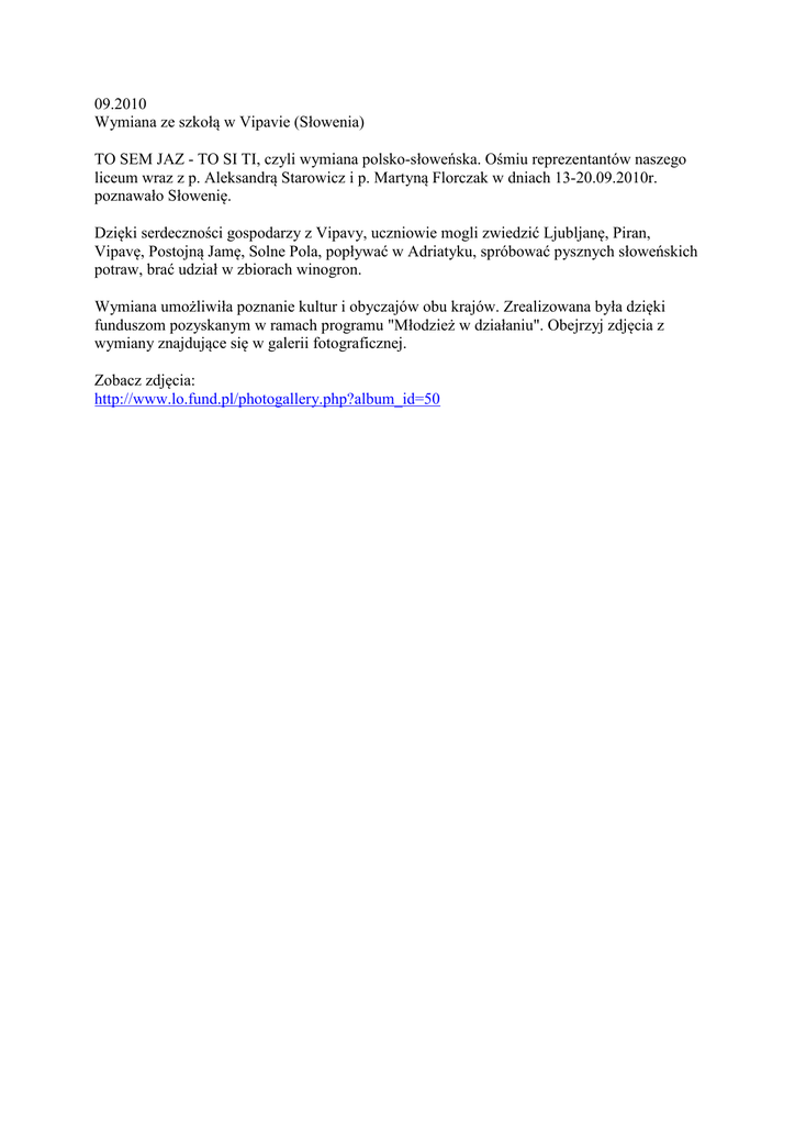 09.2010 Wymiana ze szkołą w Vipavie (Słowenia) TO SEM JAZ - TO SI TI, czyli wymiana polsko-słoweńska. Ośmiu reprezentantów naszego liceum wraz z p. Aleksandrą Starowicz i p. Martyną Florczak w dniach 13-20.09.2010r. poznawało Słowenię. Dzięki serdeczności gospodarzy z Vipavy, uczniowie mogli zwiedzić Ljubljanę, Piran, Vipavę, Postojną Jamę, Solne Pola, popływać w Adriatyku, spróbować pysznych słoweńskich potraw, brać udział w zbiorach winogron. Wymiana umożliwiła poznanie kultur i obyczajów obu krajów. Zrealizowana była dzięki funduszom pozyskanym w ramach programu "Młodzież w działaniu". Obejrzyj zdjęcia z wymiany znajdujące się w galerii fotograficznej. Zobacz zdjęcia: http://www.lo.fund.pl/photogallery.php?album_id=50