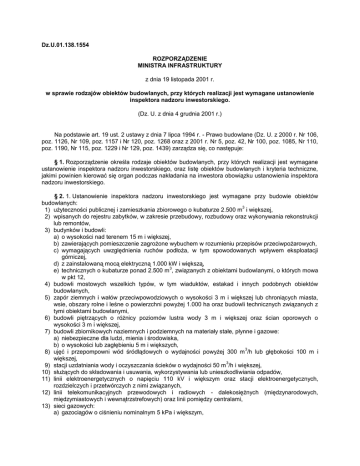 Dz.U.01.138.1554 ROZPORZ DZENIE MINISTRA INFRASTRUKTURY z dnia 19 listopada 2001 r. w sprawie rodzajów obiektów budowlanych, przy których realizacji jest wymagane ustanowienie inspektora nadzoru inwestorskiego. (Dz. U. z dnia 4 grudnia 2001 r.) Na podstawie art. 19 ust. 2 ustawy z dnia 7 lipca 1994 r. - Prawo budowlane (Dz. U. z 2000 r. Nr 106, poz. 1126, Nr 109, poz. 1157 i Nr 120, poz. 1268 oraz z 2001 r. Nr 5, poz. 42, Nr 100, poz. 1085, Nr 110, poz. 1190, Nr 115, poz. 1229 i Nr 129, poz. 1439) zarz dza si , co nast puje: § 1. Rozporz dzenie okre la rodzaje obiektów budowlanych, przy których realizacji jest wymagane ustanowienie inspektora nadzoru inwestorskiego, oraz list obiektów budowlanych i kryteria techniczne, jakimi powinien kierować si organ podczas nakładania na inwestora obowi zku ustanowienia inspektora nadzoru inwestorskiego. § 2. 1. Ustanowienie inspektora nadzoru inwestorskiego jest wymagane przy budowie obiektów budowlanych: 3 1) u yteczno ci publicznej i zamieszkania zbiorowego o kubaturze 2.500 m i wi kszej, 2) wpisanych do rejestru zabytków, w zakresie przebudowy, rozbudowy oraz wykonywania rekonstrukcji lub remontów, 3) budynków i budowli: a) o wysoko ci nad terenem 15 m i wi kszej, b) zawieraj cych pomieszczenie zagro one wybuchem w rozumieniu przepisów przeciwpo arowych, c) wymagaj cych uwzgl dnienia ruchów podło a, w tym spowodowanych wpływem eksploatacji górniczej, d) z zainstalowan moc elektryczn 1.000 kW i wi ksz , 3 e) technicznych o kubaturze ponad 2.500 m , zwi zanych z obiektami budowlanymi, o których mowa w pkt 12, 4) budowli mostowych wszelkich typów, w tym wiaduktów, estakad i innych podobnych obiektów budowlanych, 5) zapór ziemnych i wałów przeciwpowodziowych o wysoko ci 3 m i wi kszej lub chroni cych miasta, wsie, obszary rolne i le ne o powierzchni powy ej 1.000 ha oraz budowli technicznych zwi zanych z tymi obiektami budowlanymi, 6) budowli pi trz cych o ró nicy poziomów lustra wody 3 m i wi kszej oraz cian oporowych o wysoko ci 3 m i wi kszej, 7) budowli zbiornikowych naziemnych i podziemnych na materiały stałe, płynne i gazowe: a) niebezpieczne dla ludzi, mienia i rodowiska, b) o wysoko ci lub zagł bieniu 5 m i wi kszych, 3 8) uj ć i przepompowni wód ródl dowych o wydajno ci powy ej 300 m /h lub gł boko ci 100 m i wi kszej, 3 9) stacji uzdatniania wody i oczyszczania cieków o wydajno ci 50 m /h i wi kszej, 10) słu cych do składowania i usuwania, wykorzystywania lub unieszkodliwiania odpadów, 11) linii elektroenergetycznych o napi ciu 110 kV i wi kszym oraz stacji elektroenergetycznych, rozdzielczych i przetwórczych z nimi zwi zanych, 12) linii telekomunikacyjnych przewodowych i radiowych - dalekosi nych (mi dzynarodowych, mi dzymiastowych i wewn trzstrefowych) oraz linii pomi dzy centralami, 13) sieci gazowych: a) gazoci gów o ci nieniu nominalnym 5 kPa i wi kszym, b) gazoci gów o ci nieniu nominalnym do 5 kPa i rednicach przewodów wi kszych ni 150 mm, z wyj tkiem przył czy gazowych o ci nieniu nie wi kszym ni 400 kPa, c) obiektów tłoczni gazu, d) obiektów stacji gazowych, wyposa onych co najmniej w dwa ci gi redukcyjne, 14) ruroci gów oraz obiektów i urz dze z nimi zwi zanych: a) ciepłowniczych: – tradycyjnych o rednicy 310 mm i wi kszej, – preizolowanych o rednicy 200 mm i wi kszej, b) wodoci gowych o rednicy 200 mm i wi kszej oraz kanalizacyjnych o rednicy 400 mm i wi kszej, c) innych transportuj cych czynnik płynny lub gazowy niebezpieczny dla ludzi, mienia i rodowiska, 15) dróg krajowych, wojewódzkich i powiatowych oraz zwi zanych z nimi bezpo rednio obiektów budowlanych, w tym tuneli drogowych i innych budowli, 16) kanałów eglugi ródl dowej oraz melioracyjnych, 17) sieci melioracyjnych na obszarze powy ej 100 ha, 18) kanałów energetycznych, 19) dróg szynowych, wraz z przeznaczonymi do prowadzenia ruchu budynkami, budowlami i urz dzeniami, 20) urz dze transportowych linowych i linowo-terenowych słu cych do publicznego przewozu osób w celach turystyczno-sportowych, 21) budowli pola naziemnego ruchu lotniczego na lotniskach. 2. Ustanowienie inspektora nadzoru inwestorskiego jest wymagane tak e przy realizacji obiektów budowlanych, niewymienionych w ust. 1, podlegaj cych ocenie oddziaływania na rodowisko, okre lonych w przepisach o zagospodarowaniu przestrzennym oraz o ochronie i kształtowaniu rodowiska. § 3. Ustanowienie inspektora nadzoru inwestorskiego jest wymagane równie przy realizacji obiektów budowlanych lub ich cz ci, które zawieraj : 1) ustroje konstrukcyjne, takie jak powłoki, łupiny, tarcze, łuki i kopuły oraz linowe wisz ce bez wzgl du na ich rozpi to ć, a tak e fundamenty inne ni proste ławy i stopy fundamentowe posadowione bezpo rednio na stabilnym gruncie no nym, 2) elementy konstrukcyjne: a) o rozpi to ci 12 m i wi kszej, wysi gu 3 m i wi kszym lub o wysoko ci jednej kondygnacji 6 m i wi kszej, 2 b) poddane obci eniu u ytkowemu 5 kN/m i wi kszemu, obci eniu zmiennemu ruchomemu, a tak e zwymiarowane z uwzgl dnieniem wpływów dynamicznych, termicznych, skurczów materiałowych lub ruchów podpór, c) spr ane na budowie lub na miejscu ich wbudowania w obiekcie budowlanym, a tak e poddane zabezpieczeniu ci gien spr aj cych i ich urz dze kotwi cych. § 4. Wła ciwy organ, w decyzji o pozwoleniu na budow albo w decyzji o pozwoleniu na wznowienie robót budowlanych, nakłada obowi zek ustanowienia inspektora nadzoru inwestorskiego okre lonej specjalno ci, z powołaniem odpowiedniego dla danego obiektu przepisu rozporz dzenia. § 5. Rozporz dzenie wchodzi w ycie po upływie 14 dni od dnia ogłoszenia.