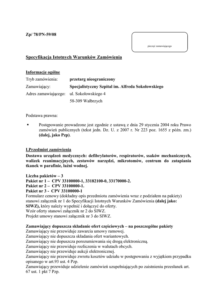 Zp/ 78/PN-59/08 pieczęć zamawiającego Specyfikacja Istotnych Warunków Zamówienia Informacje ogólne Tryb zamówienia: przetarg nieograniczony Zamawiający: Specjalistyczny Szpital im. Alfreda Sokołowskiego Adres zamawiającego: ul. Sokołowskiego 4 58-309 Wałbrzych Podstawa prawna: Postępowanie prowadzone jest zgodnie z ustawą z dnia 29 stycznia 2004 roku Prawo zamówień publicznych (tekst jedn. Dz. U. z 2007 r. Nr 223 poz. 1655 z późn. zm.) (dalej, jako Pzp). I.Przedmiot zamówienia Dostawa urządzeń medycznych: defibrylatorów, respiratorów, ssaków mechanicznych, walizek reanimacyjnych, zestawów narzędzi, mikrotomów, centrum do zatapiania tkanek w parafinie, łaźni wodnej. Liczba pakietów – 3 Pakiet nr 1 – CPV 33100000-1, 33182100-0, 33170000-2. Pakiet nr 2 – CPV 33100000-1. Pakiet nr 3 - CPV 33100000-1 Formularz cenowy (dokładny opis przedmiotu zamówienia wraz z podziałem na pakiety) stanowi załącznik nr 1 do Specyfikacji Istotnych Warunków Zamówienia (dalej jako: SIWZ), który naleŜy wypełnić i dołączyć do oferty. Wzór oferty stanowi załącznik nr 2 do SIWZ. Projekt umowy stanowi załącznik nr 3 do SIWZ. Zamawiający dopuszcza składanie ofert częściowych – na poszczególne pakiety Zamawiający nie przewiduje zawarcia umowy ramowej. Zamawiający nie dopuszcza składania ofert wariantowych. Zamawiający nie dopuszcza porozumiewania się drogą elektroniczną. Zamawiający nie przewiduje rozliczenia w walutach obcych. Zamawiający nie przewiduje aukcji elektronicznej. Zamawiający nie przewiduje zwrotu kosztów udziału w postępowaniu z wyjątkiem przypadku opisanego w art.93 ust. 4 Pzp. Zamawiający przewiduje udzielenie zamówień uzupełniających po zaistnieniu przesłanek art. 67 ust. 1 pkt 7 Pzp. II. Miejsce realizacji zamówienia Siedziba Zamawiającego. III. Termin realizacji zamówienia Do 6 tygodni od daty podpisania umowy IV. Wymagania od Wykonawców O zamówienie mogą ubiegać się Wykonawcy, którzy: - spełniają wymogi art. 22 ust. 1 Pzp, - nie podlegają wykluczeniu z postępowania na podstawie art. 24 Pzp, - akceptują wzór umowy i w razie wygrania przetargu podpiszą go bez zastrzeŜeń, - akceptują SIWZ, - akceptują termin płatności minimum 30 dni, liczony od dnia dostarczenia faktury Zamawiającemu, - zapewniają termin gwarancji – 36 miesięcy, - dostarczą sprzęt (towar) w terminie do 6 tygodni od daty podpisania umowy, - posiadają doświadczenie w zakresie dostaw będących przedmiotem zamówienia przedłoŜą wykaz wykonanych dostaw w okresie ostatnich 3 lat, a jeŜeli okres prowadzenia działalności jest krótszy – w tym okresie, z podaniem ich wartości, przedmiotu, dat wykonania i odbiorców; ponadto przedłoŜą dokumenty potwierdzające, Ŝe te dostawy zostały wykonane naleŜycie (referencje), - oferowany przez nich sprzęt medyczny (towar) spełnia wszystkie wymogi podane w załączniku nr 1 do SIWZ, - oferowane przez nich urządzenie medyczne (towar) dopuszczone jest do obrotu i stosowania na terenie RP zgodnie z obowiązującymi przepisami prawa, - załączą do oferty przetargowej prospekty, katalogi z dokładnym opisem sprzętu (towaru). V. Sposób oceny warunków l.p. Nazwa (rodzaj) warunku na podstawie oświadczeń wymaganych w SIWZ i dokumentów 2. nie podleganie wykluczeniu z postępowania o udzielenie na podstawie oświadczeń zamówienia publicznego na podstawie art. 24 Pzp wymaganych w SIWZ i dokumentów 3. posiadanie doświadczenia w zakresie dostaw będących przedmiotem zamówienia - przedłoŜenie wykazu wykonanych dostaw w okresie ostatnich 3 lat, a jeŜeli okres prowadzenia na podstawie wykazu wykonanych dostaw działalności jest krótszy – w tym okresie, z podaniem ich potwierdzonych dokumentami potwierdzającymi wartości, przedmiotu, dat wykonania i odbiorców; ponadto ich naleŜyte wykonanie (referencje) przedłoŜenie dokumentów potwierdzających, Ŝe te dostawy zostały wykonane naleŜycie (referencje) 4 akceptacja warunków płatności, akceptacja SIWZ, spełnienie przez sprzęt (towar) wymogów z zał. nr 1 do SIWZ, na podstawie oświadczeń, które zawiera wzór oferty – załącznik nr 2 do SIWZ zapewnienie terminu gwarancji, zapewnienie terminu dostawy, 1. spełnienie wymogów art. 22 ust. 1 ustawy Pzp Sposób oceny na podstawie zaparafowanego wzoru umowy stanowiącego zał. nr 3 do SIWZ oraz oświadczenia o jego bezwarunkowej akceptacji 5 akceptacja warunków umowy 6 dopuszczenie jest do obrotu i stosowania na terenie RP zgodnie na podstawie załączonych dokumentów z obowiązującymi przepisami prawa, posiadanie prospektów, katalogów VI.Podmioty ubiegające się wspólnie o zamówienie Wykonawcy mogą wspólnie ubiegać się o udzielenie zamówienia. W takim przypadku ustanawiają pełnomocnika do reprezentowania ich w postępowaniu o udzielenie zamówienia albo reprezentowania w postępowaniu i zawarcia umowy w sprawie zamówienia publicznego. Wykonawcy wspólnie ubiegający się o udzielenie niniejszego zamówienia muszą wykazać, Ŝe łącznie spełniają warunek określony w powyŜszej tabeli wiersz 3. Wymagania podmiotowe w zakresie opisanym w art. 22 ust. 1 pkt. 1-4 Pzp i art. 24 ust. 1 pkt. 1-9 i ust. 2 pkt. 1-3 Pzp będą sprawdzane i weryfikowane oddzielnie dla kaŜdego Wykonawcy wchodzącego w skład podmiotu wspólnie ubiegającego się o zamówienie. VII. Wadium Kwota wadium wymagana do wzięcia udziału w postępowaniu: - pakiet nr 1 – 9.000,00 zł, - pakiet nr 2 – 2.000,00 zł, - pakiet nr 3 - 60,00 zł. DATĄ UZNANIA ZAMAWIAJĄCEGO. WPŁATY BĘDZIE DATA WPŁYWU NA KONTO Potwierdzenie wniesienia wadium naleŜy dołączyć do oferty. Oferta nie zabezpieczona akceptowalną formą wadium zostanie odrzucona bez rozpatrywania. Konto bankowe: Kredyt Bank S.A. o/Wałbrzych 36 1500 1764 1217 6005 2413 0000. Wadium moŜe być wnoszone w jednej lub kilku następujących formach: 1) pieniądzu na konto bankowe, 2) poręczeniach bankowych lub poręczen