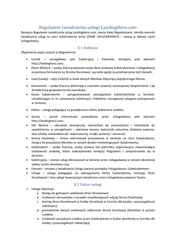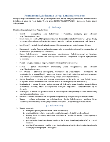 Regulamin świadczenia usługi LandingHero.com Niniejszy Regulamin świadczenia usług LandingHero.com, zwany dalej Regulaminem, określa warunki świadczenia usług na rzecz Subskrybenta przez [DANE USŁUGODAWCY] – zwaną w dalszej części Usługodawcą . § 1 Definicje Objaśnienie pojęć użytych w Regulaminie: Cennik – szczegółowy opis Subskrypcji i Pakietów, dostępny pod adresem http://landinghero.com; Klient (Klienci) – osoba, która przekazała swoje dane osobowe Subskrybentowi i Usługodawcy za pomocą formularza na Stronie Docelowej i wyraziła zgodę na przetwarzanie tych danych; Lead (Leady) – wpis (rekord) w bazie danych Klientów dotyczący pojedynczego Klienta; Konsument – osoba fizyczna dokonująca czynności prawnej niezwiązanej bezpośrednio z jej działalnością gospodarczą lub zawodową Konto Subskrybenta – oprogramowanie udostępnione Subskrybentowi w Serwisie, umożliwiające m. in. zamawianie Subskrypcji i Pakietów i zarządzanie usługami wykupionymi w Serwisie; Pakiet – usługa polegająca na powiększeniu limitu pobierania Leadów; Serwis – portal internetowy prowadzony przez Usługodawcę pod adresem http://landinghero.com; Siła Wyższa – zdarzenie zewnętrzne, niemożliwe do przewidzenia i niemożliwe do zapobieżenia; w szczególności – zdarzenie losowe, katastrofa naturalna, działania wojenne, akty władzy ustawodawczej i wykonawczej, strajki, protesty i zamieszki; Strona Docelowa – strona internetowa prowadzona w Serwisie na rzecz Subskrybenta, służąca do pozyskania Klientów w ramach działań marketingowych Subskrybenta; Subskrybent – osoba fizyczna, osoba prawna lub jednostka organizacyjna nieposiadająca osobowości prawnej, która zaakceptowała niniejszy Regulamin i zarejestrowała się w Serwisie; Subskrypcja – zestaw usług oferowanych w Serwisie przez Usługodawcę w ramach określonej opłaty i przez określony czas; Umowa – umowa o świadczenie Usługi zawarta pomiędzy Usługodawcą i Subskrybentem; Usługa – usługa polegająca na udostępnieniu Konta Subskrybenta, hostingu Stron Docelowych i inne usługi towarzyszące świadczone przez Usługodawcę poprzez Serwis. § 2 Zakres usługi 1. Usługa obejmuje: a. dostęp do gotowych szablonów Stron Docelowych; b. możliwość skorzystania z narzędzi umożliwiających edycję Strony Docelowej; c. hosting Stron Docelowych w liczbie określonej w Cenniku dla każdej z poszczególnych Subskrypcji; d. gromadzenie danych osobowych odbiorców Strony Docelowej (Klientów) w postaci Leadów; e. możliwość pozyskania Leadów przez Subskrybenta w liczbie określonej w Cenniku dla każdej z poszczególnych Subskrypcji; f. możliwość skorzystania z narzędzi do analizy ruchu na Stronie Docelowej. 2. Korzystanie z Usługi wymaga założenia Konta. Za jego pomocą Subskrybent może dokonywać zamówień pozostałych składników Usługi (w postaci Pakietów lub Subskrypcji) oraz nimi zarządzać. 3. O ile Subskrybent nie wykupił Pakietu lub Subskrypcji, na Koncie aktywna pozostaje Subskrypcja Podstawowa, która umożliwia dostęp do usług określonych powyżej oraz w Cenniku. 4. Założenie Konta oraz Subskrypcja Demonstracyjna są darmowe. 5. Poprzez zamówienie Subskrypcji, Subskrybent uzyskuje możliwość korzystania z Usługi w pełnym zakresie przez określony czas, w zamian za opłatę wnoszoną w cyklu miesięcznym lub rocznym. 6. Szczegółowe informacje o oferowanych Pakietach i Subskrypcjach, czasie ich obowiązywania oraz wysokości opłat zawarte są w Cenniku. § 3 Strony Docelowe 1. Subskrybent, pod warunkiem akceptacji niniejszego Regulaminu, ma możliwość zaprojektowania własnej Strony Docelowej lub dostosowania gotowego szablonu Strony Docelowej spośród oferowanych przez Usługodawcę. 2. Strony Docelowe, za pośrednictwem których zbierane są dane osobowe Klientów, zawierają: a. formularz kontaktowy służący do zbierania danych osobowych Klientów; b. przyciski wyboru, za pomocą których Klient akceptuje Politykę Prywatności, wyraża zgodę na przetwarzania danych osobowych w celach marketingowych oraz na przesyłanie wiadomości handlowych; c. odsyłacz do Polityki Prywatności. 3. Administratorami danych osobowych Klientów zebranych za pomocą formularza kontaktowego są Subskrybent i Usługodawca. 4. Wzory opisów przycisków wyboru oraz treści Polityki Prywatności stanowią załączniki do niniejszego Regulaminu. 5. Usługodawca udziela Subskrybentowi niewyłącznej, nieprzenoszalnej, nieograniczonej terytorialnie licencji na wykorzystywanie w okresie obowiązywania Subskrypcji i w ramach wniesionej opłaty, udostępnionych w Serwisie szablonów Stron Docelowych (dalej jako Utwór), wyłącznie w celu przygotowania własnej Strony Docelowej i opublikowania jej w ramach Usługi. 6. Licencja, o której mowa w ust. 5 powyżej przy uwzględnieniu zastrzeżeń odnośnie co do zakresu w którym zostaje udzielona, obejmuje następujące pola eksploatacji: a. Utrwalanie i zwielokrotnianie egzemplarzy Utworu techniką zapisu magnetycznego oraz techniką cyfrową; b. Publiczne udostępnianie Utworu w taki sposób, aby każdy mógł mieć do niego dostęp w miejscu i czasie przez siebie wybranym; c. Modyfikowanie Utworu wyłącznie w zakresie funkcjonalności udostępnionej w Serwisie; d. Sporządzanie i korzystanie z opracowania Utworu. § 4 Usługodawca 1. Usługodawca zobowiązuje się świadczyć Usługę z należytą starannością. 2. Usługodawca podejmie środki w celu ochrony Konta Subskrybenta i zawartych na nim danych przed dostępem i działaniami osób trzecich. 3. Usługodawca zastrzega sobie prawo dokonywania przerw w dostępności Usługi uzasadnionych względami konserwacji i obsługi Serwisu. Usługodawca dołoży starań, by przerwy były jak najkrótsze, a Subskrybent w miarę możliwości został poinformowany z wyprzedzeniem o planowanej przerwie w dostępności Usługi, chyba, że przerwa spowodowana będzie na