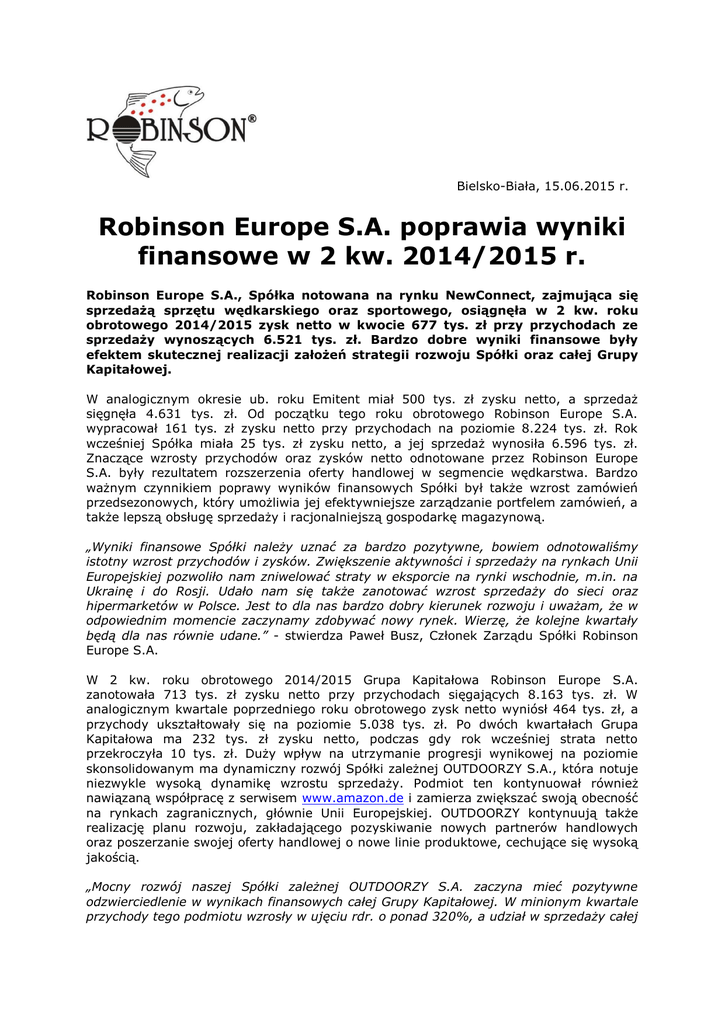 Bielsko-Biała, 15.06.2015 r. Robinson Europe S.A. poprawia wyniki finansowe w 2 kw. 2014/2015 r. Robinson Europe S.A., Spółka notowana na rynku NewConnect, zajmująca się sprzedażą sprzętu wędkarskiego oraz sportowego, osiągnęła w 2 kw. roku obrotowego 2014/2015 zysk netto w kwocie 677 tys. zł przy przychodach ze sprzedaży wynoszących 6.521 tys. zł. Bardzo dobre wyniki finansowe były efektem skutecznej realizacji założeń strategii rozwoju Spółki oraz całej Grupy Kapitałowej. W analogicznym okresie ub. roku Emitent miał 500 tys. zł zysku netto, a sprzedaż sięgnęła 4.631 tys. zł. Od początku tego roku obrotowego Robinson Europe S.A. wypracował 161 tys. zł zysku netto przy przychodach na poziomie 8.224 tys. zł. Rok wcześniej Spółka miała 25 tys. zł zysku netto, a jej sprzedaż wynosiła 6.596 tys. zł. Znaczące wzrosty przychodów oraz zysków netto odnotowane przez Robinson Europe S.A. były rezultatem rozszerzenia oferty handlowej w segmencie wędkarstwa. Bardzo ważnym czynnikiem poprawy wyników finansowych Spółki był także wzrost zamówień przedsezonowych, który umożliwia jej efektywniejsze zarządzanie portfelem zamówień, a także lepszą obsługę sprzedaży i racjonalniejszą gospodarkę magazynową. „Wyniki finansowe Spółki należy uznać za bardzo pozytywne, bowiem odnotowaliśmy istotny wzrost przychodów i zysków. Zwiększenie aktywności i sprzedaży na rynkach Unii Europejskiej pozwoliło nam zniwelować straty w eksporcie na rynki wschodnie, m.in. na Ukrainę i do Rosji. Udało nam się także zanotować wzrost sprzedaży do sieci oraz hipermarketów w Polsce. Jest to dla nas bardzo dobry kierunek rozwoju i uważam, że w odpowiednim momencie zaczynamy zdobywać nowy rynek. Wierzę, że kolejne kwartały będą dla nas równie udane.” - stwierdza Paweł Busz, Członek Zarządu Spółki Robinson Europe S.A. W 2 kw. roku obrotowego 2014/2015 Grupa Kapitałowa Robinson Europe S.A. zanotowała 713 tys. zł zysku netto przy przychodach sięgających 8.163 tys. zł. W analogicznym kwartale poprzedniego roku obrotowego zysk netto wyniósł 464 tys. zł, a przychody ukształtowały się na poziomie 5.038 tys. zł. Po dwóch kwartałach Grupa Kapitałowa ma 232 tys. zł zysku netto, podczas gdy rok wcześniej strata netto przekroczyła 10 tys. zł. Duży wpływ na utrzymanie progresji wynikowej na poziomie skonsolidowanym ma dynamiczny rozwój Spółki zależnej OUTDOORZY S.A., która notuje niezwykle wysoką dynamikę wzrostu sprzedaży. Podmiot ten kontynuował również nawiązaną współpracę z serwisem www.amazon.de i zamierza zwiększać swoją obecność na rynkach zagranicznych, głównie Unii Europejskiej. OUTDOORZY kontynuują także realizację planu rozwoju, zakładającego pozyskiwanie nowych partnerów handlowych oraz poszerzanie swojej oferty handlowej o nowe linie produktowe, cechujące się wysoką jakością. „Mocny rozwój naszej Spółki zależnej OUTDOORZY S.A. zaczyna mieć pozytywne odzwierciedlenie w wynikach finansowych całej Grupy Kapitałowej. W minionym kwartale przychody tego podmiotu wzrosły w ujęciu rdr. o ponad 320%, a udział w sprzedaży całej Grupy zwiększył się do 20%. OUTDOORZY kontynuują ekspansję na rynkach krajów Unii Europejskiej, a także w dalszym ciągu poszukują nowych partnerów i produktów o wysokiej jakości do swojego portfolio. Decyzję o włączeniu do Grupy Kapitałowej podmiotu zajmującego się sprzedażą internetową oceniamy bardzo dobrze i liczę, że w następnym kwartale utrzymamy trend wzrostowy.” - dodaje Busz. W marcu 2015 r. obligacje Robinson Europe S.A. zadebiutowały na rynku Catalyst. Spółka z przeprowadzonej emisji pozyskała 1.027 tys. zł, które przeznaczyła m.in. na rozwój swojej głównej linii biznesowej wędkarstwo poprzez zwiększenie zatowarowania magazynu oraz rozszerzenie asortymentu produktów o nowe specjalistyczne marki. Wyemitowane papiery dłużne są zabezpieczonymi obligacjami trzyletnimi o oprocentowaniu zmiennym wynoszącym WIBOR3M + marża w wysokości 7,00% w skali roku. Spółka Robinson Europe S.A. jest notowana na rynku NewConnect od czerwca 2011 r. Głównym przedmiotem jej działalności jest sprzedaż sprzętu wędkarskiego oraz sportowego. Historia przedsiębiorstwa sięga 1991 r., kiedy to obecni Członkowie Zarządu założyli firmę „BIS”, która od wielu lat jest znana w branży wędkarskiej. Robinson Europe S.A. posiada 600.000 szt. akcji stanowiących 75% udziałów w kapitale zakładowym spółki OUTDOORZY S.A., która prowadzi sprzedaż sprzętu sportowego poprzez swój sklep internetowy. Pozostałe 200.000 szt. akcji, które stanowią 25% udziałów w kapitale zakładowym OUTDOORZY S.A., posiada ABS Investment S.A. - partner strategiczny Robinson Europe S.A. *** Kontakt: Artur Górski Relacje Inwestorskie/Media [email protected] tel. +48 501-215-243