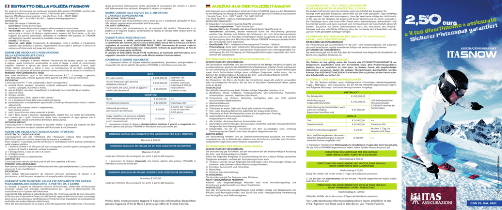 Per qualsiasi informazione sul contenuto integrale della polizza ITASNOW, nonché sulle modalità di denuncia di eventuali sinistri, lʼAssicurato potrà rivolgersi a: Agenzia ITAS Mutua Assicurazioni - Via alla Croce, 9/A - 38027 MALÈ Tel. 0463 901167 - Fax 0463 901903 - [email protected] DEFINIZIONI Nel testo che segue si intende per: - Contraente: Trento Funivie Spa; - Itasnow: il nome del prodotto oggetto della presente assicurazione; - Assicurato: lo sciatore il cui interesse è protetto dallʼassicurazione, ossia il possessore e titolare di skipass regolarmente emesso dal Contraente, o da altri soggetti da questo autorizzati, riportante la conferma dellʼacquisto di ITASNOW nellʼapposito riquadro secondo le modalità concordate; - Società: ITAS Mutua; - Soccorso sulle piste: lʼorganismo di salvataggio civile o militare o lʼorganismo specializzato pubblico o privato, regolarmente autorizzato a prestare il servizio di soccorso allʼAssicurato sul luogo del sinistro. NORME CHE REGOLANO LʼASSICURAZIONE DELLA RESPONSABILITÀ CIVILE OGGETTO DELLʼASSICURAZIONE La Società si impegna a tenere indenne lʼAssicurato da quanto questi sia tenuto a pagare, quale civilmente responsabile ai sensi di legge, a titolo di risarcimento (capitale, interessi e spese) per danni involontariamente cagionati a terzi, quali morte, lesioni personali e danni a cose, in conseguenza di un fatto accidentale verificatosi in relazione allʼattività sportiva sciistica amatoriale da discesa e snowboard. PERSONE NON CONSIDERATE TERZI Non sono considerati terzi ai fini dellʼassicurazione R.C.T. il coniuge, i genitori, i figli dellʼAssicurato, nonché qualsiasi altro parente od affine con lui convivente. ESCLUSIONI Lʼassicurazione R.C.T. non comprende i danni conseguenti a: a) trombe dʼaria, uragani, terremoti, eruzioni vulcaniche, inondazioni, mareggiate, slavine, valanghe, maremoti o frane; b) uso di droghe, narcotici, stupefacenti o medicinali non prescritti da un medico; c) abuso di alcol; d) tentato suicidio; e) partecipazione a furti, rapine o altri crimini; f) sci o snowboard fuori dalle aree sciabili attrezzate; g) partecipazione a competizioni agonistiche a livello professionistico inclusi i relativi allenamenti; h) utilizzo della skipass contro il regolamento. Sono inoltre esclusi: i) tutti i danni che non siano materiali e diretti; l) tutti i danni causati a strutture, equipaggiamenti, impianti fissi e/o mobili del Contraente; m) i sinistri per i quali lʼAssicurato abbia fatto transazioni di ogni genere con il danneggiato senza il preventivo benestare della Società. SECONDO RISCHIO Lʼassicurazione si intende prestata in secondo rischio a quanto già coperto da altre polizze assicurative in vigore stipulate dallʼAssicurato e/o Contraente. NORME CHE REGOLANO LʼASSICURAZIONE INFORTUNI dovrà presentare dichiarazione scritta riportante le circostanze del sinistro e i giorni dellʼabbonamento non utilizzati, allegando lo skipass in originale. Lʼassicurazione è valida esclusivamente in caso di intervento, nel luogo di accadimento del sinistro, del servizio di SOCCORSO SULLE PISTE; lʼAssicurato dovrà segnalare al servizio di SOCCORSO SULLE PISTE intervenuto di essere coperto dallʼassicurazione mostrando tutti i documenti richiesti da questʼultimo, al fine di effettuare le necessarie verifiche. Il servizio di SOCCORSO SULLE PISTE verificherà, al momento dellʼintervento, se il soggetto causante il sinistro possieda effettivamente lʼassicurazione. Informationen zum vollständigen Inhalt der Polizze ITASNOW sowie zu den Modalitäten für die Meldung von etwaigen Schadenfällen erteilt die Agentur ITAS Mutua Assicurazioni – Via alla Croce, 9/A – 38027 MALÈ – Tel. 0463 901167 Fax 0463 901903 - [email protected] BEGRIFFSBESTIMMUNGEN Im folgenden Text werden folgende Begriffe verwendet: - Versicherungsnehmer: Trento Funivie Spa. - Itasnow: Name des Produkts, das Gegenstand dieser Versicherung ist. - Versicherter: Schifahrer, dessen Interessen durch die Versicherung geschützt werden, bzw. Besitzer und Inhaber des Schipasses, der vom Versicherungsnehmer und von anderen von ihm dazu ermächtigten Stellen ausgestellt wurde und auf dem die Bestätigung über den Abschluss der Polizze ITASNOW im entsprechenden Feld in der vereinbarten Form aufscheint. - Gesellschaft: ITAS - Landesversicherungsanstalt Trentino – Südtirol. - Pistenrettung: Zivile oder militärische Rettungsorganisation oder öffentliche oder private auf Rettungsarbeiten spezialisierte Organisation mit ordnungsgemäßer Genehmigung für die Erbringung von Rettungsdienstleistungen zugunsten des Versicherten am Schadensort. MASSIMALI E SOMME ASSICURATE BESTIMMUNGEN DER HAFTPFLICHTVERSICHERUNG NORME COMUNI ALLE SEZIONI R.C.T., INFORTUNI E GARANZIA SUPPLEMENTARE ESTENSIONE TERRITORIALE Lʼassicurazione vale esclusivamente per le piste da sci e snowboard utilizzabili in base allo skipass regolarmente posseduto dallʼAssicurato. VALIDITÀ TEMPORALE Lʼassicurazione vale esclusivamente se, al momento del sinistro, lʼAssicurato è in possesso di regolare skipass, comprovante la facoltà di utilizzo delle relative piste da sci e snowboard. VALIDITÀ DELLʼASSICURAZIONE 1. I possessori-titolari di skipass mattutino/pomeridiano, giornaliero, plurigiornaliero o stagionale che hanno aderito alla polizza ITASNOW si intendono assicurati per: R.C.T. Per ogni sinistro ma col limite per ogni persona deceduta o ferita di € 200.000,00 € 200.000,00 e per danni alle cose, anche se appartenenti a più persone di € 15.000,00 Scoperto 10% relativamente ai danni a persone. Franchigia € 500,00 relativamente ai danni a cose. INFORTUNI Morte € 10.000,00 == Invalidità permanente € 30.000,00 Franchigia 30% Indennità giornaliera per ricovero da infortunio € 20,00 A partire dal 1° giorno e con un massimo di 60 giorni. Spese mediche e di soccorso prestate nellʼimmediatezza del sinistro presso € 200,00 == centri convenzionati 2. I possessori-t