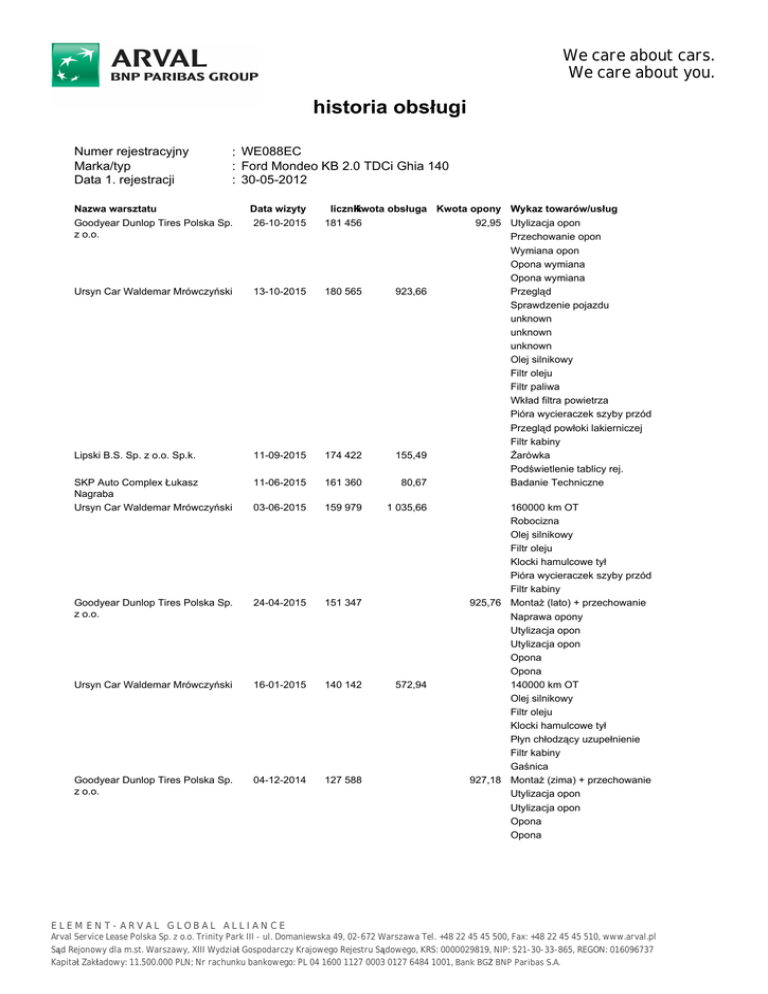 We care about cars. We care about you. historia obsługi Numer rejestracyjny Marka/typ Data 1. rejestracji : WE088EC : Ford Mondeo KB 2.0 TDCi Ghia 140 : 30-05-2012 Nazwa warsztatu Goodyear Dunlop Tires Polska Sp. z o.o. Data wizyty 26-10-2015 Ursyn Car Waldemar Mrówczyński 13-10-2015 Lipski B.S. Sp. z o.o. Sp.k. 11-09-2015 SKP Auto Complex Łukasz Nagraba Ursyn Car Waldemar Mrówczyński 11-06-2015 licznik Kwota obsługa Kwota opony Wykaz towarów/usług 181 456 92,95 Utylizacja opon Przechowanie opon Wymiana opon Opona wymiana Opona wymiana 180 565 923,66 Przegląd Sprawdzenie pojazdu unknown unknown unknown Olej silnikowy Filtr oleju Filtr paliwa Wkład filtra powietrza Pióra wycieraczek szyby przód Przegląd powłoki lakierniczej Filtr kabiny 174 422 155,49 Żarówka Podświetlenie tablicy rej. 161 360 80,67 Badanie Techniczne 03-06-2015 159 979 Goodyear Dunlop Tires Polska Sp. z o.o. 24-04-2015 151 347 Ursyn Car Waldemar Mrówczyński 16-01-2015 140 142 Goodyear Dunlop Tires Polska Sp. z o.o. 04-12-2014 127 588 ELEMENT-ARVAL GLOBAL ALLIANCE 1 035,66 572,94 160000 km OT Robocizna Olej silnikowy Filtr oleju Klocki hamulcowe tył Pióra wycieraczek szyby przód Filtr kabiny 925,76 Montaż (lato) + przechowanie Naprawa opony Utylizacja opon Utylizacja opon Opona Opona 140000 km OT Olej silnikowy Filtr oleju Klocki hamulcowe tył Płyn chłodzący uzupełnienie Filtr kabiny Gaśnica 927,18 Montaż (zima) + przechowanie Utylizacja opon Utylizacja opon Opona Opona Arval Service Lease Polska Sp. z o.o. Trinity Park III - ul. Domaniewska 49, 02-672 Warszawa Tel. +48 22 45 45 500, Fax: +48 22 45 45 510, www.arval.pl Sąd Rejonowy dla m.st. Warszawy, XIII Wydział Gospodarczy Krajowego Rejestru Sądowego, KRS: 0000029819, NIP: 521-30-33-865, REGON: 016096737 Kapitał Zakładowy: 11.500.000 PLN; Nr rachunku bankowego: PL 04 1600 1127 0003 0127 6484 1001, Bank BGŻ BNP Paribas S.A. Nazwa warsztatu Ursyn Car Waldemar Mrówczyński Data wizyty 20-11-2014 Ursyn Car Waldemar Mrówczyński 02-10-2014 Ursyn Car Waldemar Mrówczyński 12-09-2014 Goodyear Dunlop Tires Polska Sp. z o.o. 16-05-2014 Ursyn Car Waldemar Mrówczyński 18-04-2014 Goodyear Dunlop Tires Polska Summit Motors Poland Sp. z o.o. Ursyn Car Waldemar Mrówczyński 28-03-2014 17-03-2014 09-01-2014 Ursyn Car Waldemar Mrówczyński 13-12-2013 Goodyear Dunlop Tires Polska Sp. z o.o. 02-12-2013 Euromaster Polska Sp. z o.o. Ursyn Car Waldemar Mrówczyński 27-08-2013 26-07-2013 Ursyn Car Waldemar Mrówczyński 13-06-2013 licznik Kwota obsługa Kwota opony Wykaz towarów/usług 131 134 1 073,25 Robocizna Tarcze hamulcowe tył Klocki hamulcowe tył 122 657 127,02 Robocizna Żarówka Żarówka 119 767 2 049,02 120000 km OT Robocizna Olej silnikowy Filtr oleju Wyważenie koła Tarcze hamulcowe przód Klocki hamulcowe przód Płyn hamulcowy Filtr powietrza Filtr paliwa Żarówka Filtr kabiny Gaśnica 104 486 901,90 Montaż (lato) + przechowanie Utylizacja opon Opona Opona 100 136 1 593,21 100000 km OT Robocizna Materiały drobne Olej silnikowy Filtr oleju Tarcze hamulcowe tył Klocki hamulcowe tył Filtr powietrza Filtr kabiny 95 320 0,01 Relokacja opon 93 373 101,50 Żarówka 85 071 1 440,81 Robocizna Sprzęgło wymiana 80 014 1 044,84 80000 km OT Olej silnikowy Śruba koła Klocki hamulcowe tył Żarówka Pióra wycieraczek szyby przód wymiana Klakson sprawdzenie Gaśnica 77 036 111,30 Montaż (zima) + przechowanie Utylizacja opon 61 100 53,00 Naprawa opony 59 127 1 037,40 60000 km OT Osłona wymiana Półoś wymiana Klocki hamulcowe przód Filtr powietrza Filtr kabiny 49 260 36,91 Bezpiecznik Nazwa warsztatu Goodyear Dunlop Tires Polska Sp. z o.o. Data wizyty 28-05-2013 Ursyn Car Waldemar Mrówczyński Goodyear Dunlop Tires Polska Sp. z o.o. Ursyn Car Waldemar Mrówczyński 15-05-2013 10-04-2013 licznik Kwota obsługa Kwota opony Wykaz towarów/usług 43 739 949,24 Montaż (lato) + przechowanie Opona Opona 43 124 90,06 Żarówka 23 604 40,00 Relokacja opon 08-04-2013 39 839 966,11 Ursyn Car Waldemar Mrówczyński Goodyear Dunlop Tires Polska Sp. z o.o. 26-03-2013 13-12-2012 37 332 23 603 63,35 Ursyn Car Waldemar Mrówczyński 30-10-2012 20 650 657,85 40000 km OT Olej silnikowy Filtr oleju Klocki hamulcowe tył Płyn chłodzący uzupełnienie Pióra wycieraczek szyby przód Filtr kabiny Światła 2 100,45 Montaż (zima) + przechowanie Pozostałe opony 1 Opona zimowa Przegląd Wymiana filtra pyłkowego Robocizna Materiały drobne Olej silnikowy Filtr oleju Miska olejowa Pióra wycieraczek szyby przód
