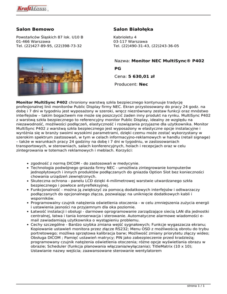 Salon Bemowo Salon Białołęka Powstańców Śląskich 87 lok. U10 B 01-466 Warszawa Tel. (22)427-89-95, (22)398-73-32 Kabrioletu 4 03-117 Warszawa Tel. (22)490-31-43, (22)243-36-05 Nazwa: Monitor NEC MultiSync® P402 PG Cena: 5 630,01 zł Producent: Nec Monitor MultiSync P402 chroniony warstwą szkła bezpiecznego kontynuuje tradycję profesjonalnej linii monitorów Public Display firmy NEC. Ekran przystosowany do pracy 24 godz. na dobę i 7 dni w tygodniu jest wyposażony w szeroki, wręcz niezrównany zestaw funkcji oraz mnóstwo interfejsów – takim bogactwem nie może się poszczycić żaden inny produkt na rynku. MultiSync P402 z warstwą szkła bezpiecznego to referencyjny monitor Public Display, idealny ze względu na niezawodność, możliwości podłączeń, elastyczność i rozwiązania przyjazne dla użytkownika. Monitor MultiSync P402 z warstwą szkła bezpiecznego jest wyposażony w elastyczne opcje instalacyjne i wyróżnia się w branży swoimi wysokimi parametrami, dzięki czemu może zostać wykorzystany w szerokim spektrum zastosowań, w tym w celach informacyjno-reklamowych w handlu (retail signage) – także w warunkach pracy 24 godziny na dobę i 7 dni w tygodniu, w zastosowaniach transportowych, w sterowniach, salach konferencyjnych, holach i recepcjach oraz w celu zintegrowania w totemach reklamowych i meblach. Korzyści: zgodność z normą DICOM - do zastosowań w medycynie. Technologia podwójnego gniazda firmy NEC - umożliwia zintegrowanie komputerów jednopłytowych i innych produktów podłączanych do gniazda Option Slot bez konieczności chowania urządzeń zewnętrznych. Skuteczna ochrona - panelu LCD dzięki 4-milimetrowej warstwie utwardzanego szkła bezpiecznego i powłoce antyrefleksyjnej. Funkcjonalność - można ją zwiększyć za pomocą dodatkowych interfejsów i odtwarzaczy podłączanych do opcjonalnego złącza, pozwalając na uniknięcie dodatkowych kabli i wsporników. Programowalny czujnik natężenia oświetlenia otoczenia - w celu zmniejszenia zużycia energii i ustawienia jasności na przyjemnym dla oka poziomie. Łatwość instalacji i obsługi - darmowe oprogramowanie zarządzające siecią LAN dla jednostki centralnej, łatwa i tania konserwacja i sterowanie. Automatyczne alarmowe wiadomości email zawiadamiają użytkownika o wystąpieniu problemu. Cechy szczególne - Bardzo szybka zmiana wejść sygnałowych; Funkcje wygaszacza ekranu; Kopiowanie ustawień monitora przez złącze RS232; Menu OSD z możliwością obrotu do trybu portretowego; możliwa sprzętowa kalibracja barw; Możliwość zmiany priorytetu złączy wideo; Obsługa DICOM ; Pamięć ustawień matrycy; PIN jako zabezpieczenie przed kradzieżą; programowany czujnik natężenia oświetlenia otoczenia; różne opcje wyświetlania obrazu w obrazie; Scheduler (funkcja planowania włączania/wyłączania); TitleMatrix (10 x 10); Ustawianie nazwy wejścia; zaawansowane sterowanie wentylatorem strona 1 / 1 Powered by TCPDF (www.tcpdf.org)